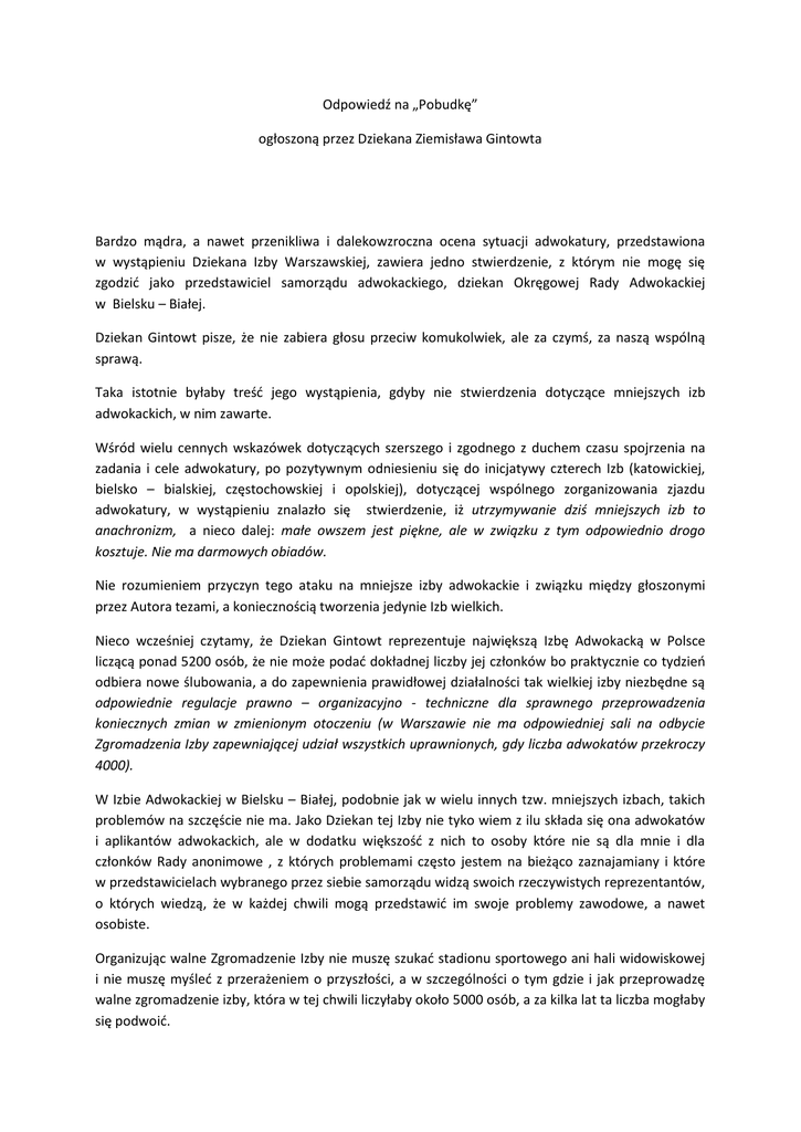 Odpowiedź na „Pobudkę” ogłoszoną przez Dziekana Ziemisława Gintowta Bardzo mądra, a nawet przenikliwa i dalekowzroczna ocena sytuacji adwokatury, przedstawiona w wystąpieniu Dziekana Izby Warszawskiej, zawiera jedno stwierdzenie, z którym nie mogę się zgodzić jako przedstawiciel samorządu adwokackiego, dziekan Okręgowej Rady Adwokackiej w Bielsku – Białej. Dziekan Gintowt pisze, że nie zabiera głosu przeciw komukolwiek, ale za czymś, za naszą wspólną sprawą. Taka istotnie byłaby treść jego wystąpienia, gdyby nie stwierdzenia dotyczące mniejszych izb adwokackich, w nim zawarte. Wśród wielu cennych wskazówek dotyczących szerszego i zgodnego z duchem czasu spojrzenia na zadania i cele adwokatury, po pozytywnym odniesieniu się do inicjatywy czterech Izb (katowickiej, bielsko – bialskiej, częstochowskiej i opolskiej), dotyczącej wspólnego zorganizowania zjazdu adwokatury, w wystąpieniu znalazło się stwierdzenie, iż utrzymywanie dziś mniejszych izb to anachronizm, a nieco dalej: małe owszem jest piękne, ale w związku z tym odpowiednio drogo kosztuje. Nie ma darmowych obiadów. Nie rozumieniem przyczyn tego ataku na mniejsze izby adwokackie i związku między głoszonymi przez Autora tezami, a koniecznością tworzenia jedynie Izb wielkich. Nieco wcześniej czytamy, że Dziekan Gintowt reprezentuje największą Izbę Adwokacką w Polsce liczącą ponad 5200 osób, że nie może podać dokładnej liczby jej członków bo praktycznie co tydzień odbiera nowe ślubowania, a do zapewnienia prawidłowej działalności tak wielkiej izby niezbędne są odpowiednie regulacje prawno – organizacyjno - techniczne dla sprawnego przeprowadzenia koniecznych zmian w zmienionym otoczeniu (w Warszawie nie ma odpowiedniej sali na odbycie Zgromadzenia Izby zapewniającej udział wszystkich uprawnionych, gdy liczba adwokatów przekroczy 4000). W Izbie Adwokackiej w Bielsku – Białej, podobnie jak w wielu innych tzw. mniejszych izbach, takich problemów na szczęście nie ma. Jako Dziekan tej Izby nie tyko wiem z ilu składa się ona adwokatów i aplikantów adwokackich, ale w dodatku większość z nich to osoby które nie są dla mnie i dla członków Rady anonimowe , z których problemami często jestem na bieżąco zaznajamiany i które w przedstawicielach wybranego przez siebie samorządu widzą swoich rzeczywistych reprezentantów, o których wiedzą, że w każdej chwili mogą przedstawić im swoje problemy zawodowe, a nawet osobiste. Organizując walne Zgromadzenie Izby nie muszę szukać stadionu sportowego ani hali widowiskowej i nie muszę myśleć z przerażeniem o przyszłości, a w szczególności o tym gdzie i jak przeprowadzę walne zgromadzenie izby, która w tej chwili liczyłaby około 5000 osób, a za kilka lat ta liczba mogłaby się podwoić. Rację ma Dziekan Gintowt pisząc, że taka sytuacja wymaga odpowiednich regulacji i zapewne ma na myśli zmianę prawa o adwokaturze w ten sposób aby Zgromadzenie Izby zastąpić zgromadzeniem delegatów izby. Tylko czy to są zmiany mające cokolwiek wspólnego z krzewieniem idei samorządności? Czy rzeczywiście przyszłość adwokatury pozostaje w sprzeczności z istotą samorządu adwokackiego i wymuszać będzie w miejsce dotychczas istniejących izb tworzenie wyłącznie izb–molochów, z których każda działać będzie na takich zasadach na jakich działa cała Adwokatura, decydując o istotnych sprawach głosami swych delegatów? Nie wiem także i nie rozumiem co miał na myśli dziekan Gintowt pisząc, że utrzymywanie małych izb odpowiednio drogo kosztuje. Przedstawiona w ten sposób teza nie została poparta jakimkolwiek wyliczeniem i twierdzę, że jest całkowicie bezpodstawna i sprzeczna z faktami. Wręcz przeciwnie mniejsze izby gospodarują bardzo oszczędnie posiadanymi środkami finansowymi i per saldo ich utrzymywanie jest dzięki temu dużo tańsze. Może chodzi o to, że takie izby nie są w stanie własnym sumptem organizować wielkich imprez. To prawda, ale właśnie podjęta przez nasze Izby wspólna inicjatywa dobitnie wskazuje na to, że jest to problem, z którym można sobie poradzić, bez wylewania dziecka z kąpielą i bez łączenia mniejszych izb z większymi. A co do obiadów… warszawskie też nie są darmowe, a nasze są skromniejsze. Apeluję wiec o umiar i rozwagę w dobieraniu argumentów. Mądre i przemyślane tezy obronią się same, bez potrzeby naginania faktów i używania argumentów wątpliwych. Poza tym, ogólna wymowa omawianego pisma zawiera się w apelu o większą aktywność, o lepsze wykorzystywanie naszego potencjału, o podejmowanie trudnych wyzwań. Jednym z tych wyzwań jest obrona naszego samorządu, więc nie poświęcajmy go niepotrzebnie i nie uszczęśliwiajmy na siłę i wbrew ich woli adwokatów zrzeszonych w mniejszych izbach, skoro oni o zmiany w tym zakresie jakoś nie proszą. Przecież istota samorządu polega na tym, że ludzie w nich zrzeszeni rządzą się sami, a nie są uszczęśliwiani wbrew swojej woli przez cudze decyzje. O to walczymy jako samorząd adwokacki, starając się przeciwdziałać różnym decyzjom i naciskom idącym z zewnątrz. Czy rzeczywiście my, przedstawiciele samorządów mniejszych izb, musimy też o to walczyć i to z własnymi kolegami? Dziekan Okręgowej Rady Adwokackiej w Bielsku – Białej adwokat Jerzy Stworzewicz