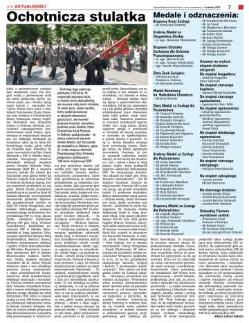>> AKTUALNOŚCI Ochotnicza stulatka Tygodnik Mazowiecki Nowy Dzwon • www.nowydzwon.pl • 1 czerwca 2016 Medale i odznaczenia: Brązowy Krzyż Zasługi: – dh Bronisław Porębski Srebrny Medal za Długoletnią Służbę: – st. ogn. Sławomir Piotrkowski Brązowa Odznaka Zasłużony dla Ochrony Przeciwpożarowej: – st. ogn. Marcin Kresa – st. ogn. Tomasz Wardzyński – ogn. Marcin Wojciechowski Złoty Znak Związku: –O chotnicza Straż Pożarna w Dobrem – dh Hieronim Rawski Jedni z pożarnictwem związali swe zawodowe życie. Dla drugich walka z płomieniami stała się celem społecznej służby. Zarówno jedni, jak i drudzy ratują nasze mienie, a nierzadko też i życie. Mowa rzecz jasna o strażakach Państwowej Straży Pożarnej oraz druhach z Ochotniczych Straży Pożarnych, którzy wspólnie obchodzili swe strażackie święto w Dobrem. Sobotnie uroczystości zainaugurowała koncelebrowana msza święta, sprawowana w miejscowym kościele pw. św. Mikołaja. Następnie jej uczestnicy udali się na teren dobrzańskiego rynku, gdzie odbył się strażacki apel. Dowódcą tej części uroczystości był kpt. Kamil Płochocki z PSP w Mińsku Mazowieckim. Uroczystego otwarcia obchodów dokonali wspólnie prezes Zarządu Oddziału Wojewódzkiego ZOSP RP, a zarazem starosta miński dh Antoni Jan Tarczyński, wójt gminy Dobre dh Tadeusz Gałązka oraz prezes OSP w Dobrem dh Roman Sajnóg, którzy przywitali przybyłych na nie gości. Wśród licznie przybyłych znaleźli się m.in. poseł na Sejm RP Czesław Mroczek, wicewojewoda mazowiecki Sylwester Dąbrowski, przedstawiciele posłów na Sejm RP Teresy Wargockiej oraz Daniela Milewskiego, zastępca mazowieckiego komendanta wojewódzkiego PSP st. bryg. Janusz Szylar, wieloletni komendant główny PSP gen. bryg. Wiesław Leśniakiewicz, komendant powiatowy PSP w Mińsku Mazowieckim st. bryg. Jarosław Ufnal, zastępca dyrektora Zarządu Dróg Wojewódzkich Mariusz Kozera, dyrektor departamentu edukacji i sportu Urzędu Marszałkowskiego Mirosław Krusiewicz, komendant powiatowy KPP w Mińsku Mazowieckim nadkom. Bartłomiej Dydek, kapelan mińskich strażaków dh ks. Zenon Wójcik, włodarze miast i wsi mińskiego powiatu, poczty sztandarowe, a także przedstawiciele duchowieństwa, służb mundurowych, lokalnego samorządu i mieszkańcy. Chociaż sobotnie uroczystości były świętem wszystkich strażaków z terenu mińskiego powiatu, główną uwagę skupiała na sobie dobrzańska OSP, która w dowód zasług za swą 100-letnią społeczną działalność odznaczona została Złotym Znakiem Związku. Nie było to zresztą jedyne przyznane tego dnia odznaczenie, a ich pełną listę prezentujemy w umieszczo- – Gratuluję tego pięknego jubileuszu 100-lecia. To wspaniale zapisana karta w historii ziemi dobrzańskiej, ale również całej ziemi mińskiej. To wiele potu, wiele wysiłku, który został poniesiony w akcjach ratowniczogaśniczych, ale również podczas ćwiczeń, zawodów, podczas wielu działań, które Ochotnicza Straż Pożarna w Dobrem podejmowała – te słowa skierował starosta miński Antoni Jan Tarczyński do strażaków w Dobrem, gdzie 21 miały miejsce obchody Powiatowego Dnia Strażaka połączone z jubileuszem 100-lecia miejscowej OSP. nej pod artykułem tabelce. Jak zwykle przy tego typu okazjach nie zabrakło również okolicznościowych przemówień, które były sposobnością do wyrażenia podziękowań za codzienną strażacką służbę. Jako pierwszy głos zabrał starosta miński Antoni Jan Tarczyński, który dziękował strażakom za „otwarte, piękne serca”, a następnie wspólnie z wicestarostą Krzysztofem Płochockim wręczył nagrody przyznane przez powiat kadrze mińskiej PSP. Za służbę strażakom dziękował także poseł Czesław Mroczek. – Ta dzisiejsza uroczystość ma cechę szczególną – 100-lecia Ochotniczej Straży Pożarnej w Dobrem – i wdzięczną pamięcią, myślę, wszyscy ogarniamy założycieli straży tutaj, w Dobrem i wszystkich strażaków w Dobrem, którzy przez pokolenia służyli swoim współmieszkańcom wedle tego, co napisane mają na sztandarze: Na chwałę Bogu i na pożytek ludziom – mówił, życząc strażakom wsparcia św. Floriana w bezpiecznym powrocie z akcji. Do kwestii bezpieczeństwa odniósł się także wicewojewoda Dąbrowski. – To strażacy niejednokrotnie dzisiaj są pierwsi przy wypadkach, część z nich jest ratownikami medycznymi. To oni udzielają tej pomocy medycznej, to oni są podczas powodzi, to oni są podczas pożarów, to oni są podczas jakichkolwiek klęsk żywiołowych, to oni są tam, gdzie ludzie potrzebują pomocy – mówił o ilości zagrożeń, z jakimi muszą mierzyć się podczas służby. – Dzień Strażaka to taki okres, gdzie podsumowujemy, patrzymy w tył, patrzymy przed siebie. Sprawdzamy, czy to, co robimy to jest właśnie to, co chcieliśmy, czy idziemy w dobrą stronę. – Ostatnio bardzo dużo się słyszy o społeczeństwie obywatelskim. Od lat już zmieniamy się i jak gdyby głównie słyszymy artykułowanie praw obywatela, mam takie prawo, mam takie, mam takie. Szanowni państwo, w czarnych mundurach naprzeciwko was stoją ludzie, którzy najpierw pytają o powinność w stosunku do naszej ojczyzny, w stosunku do społeczeństwa, a potem mówią o prawach. To są ci, którzy kawałek swojego życia poświęcają innym, dlatego cieszą się takim ogromnym szacunkiem. Uważam, że jest to szacunek zasłużony. Jestem dumny, że też noszę ten mundur, co i oni – mówił z kolei st. bryg Janusz Szylar, który podkreślił mądrość założycieli dobrzańskiej OSP. Do strażackiego dziedzictwa odniósł się także gen. bryg. Wiesław Leśniakiewicz. – Sto lat służycie ojczyźnie, służycie tej miejscowości. Przecież OSP to nie ten sprzęt, ale przede wszystkim ludzie. To pokolenia strażaków, którzy dobrowolnie niosą pomoc i ratunek wtedy, kiedy ratowane jest życie, kiedy 