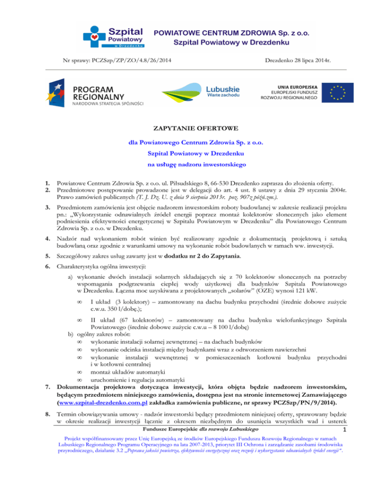 Nr sprawy: PCZSzp/ZP/ZO/4.8/26/2014 Drezdenko 28 lipca 2014r. ZAPYTANIE OFERTOWE dla Powiatowego Centrum Zdrowia Sp. z o.o. Szpital Powiatowy w Drezdenku na usługę nadzoru inwestorskiego 1. Powiatowe Centrum Zdrowia Sp. z o.o. ul. Piłsudskiego 8, 66-530 Drezdenko zaprasza do złożenia oferty. 2. Przedmiotowe postępowanie prowadzone jest w delegacji do art. 4 ust. 8 ustawy z dnia 29 stycznia 2004r. Prawo zamówień publicznych (T. J. Dz. U. z dnia 9 sierpnia 2013r. poz. 907z późń.zm.). 3. Przedmiotem zamówienia jest objęcie nadzorem inwestorskim roboty budowlanej w zakresie realizacji projektu pn.: „Wykorzystanie odnawialnych źródeł energii poprzez montaż kolektorów słonecznych jako element podniesienia efektywności energetycznej w Szpitalu Powiatowym w Drezdenku” dla Powiatowego Centrum Zdrowia Sp. z o.o. w Drezdenku. 4. Nadzór nad wykonaniem robót winien być realizowany zgodnie z dokumentacją projektową i sztuką budowlaną oraz zgodnie z warunkami umowy na wykonanie robót budowlanych w ramach ww. inwestycji. 5. Szczegółowy zakres usług zawarty jest w dodatku nr 2 do Zapytania. 6. Charakterystyka ogólna inwestycji: a) wykonanie dwóch instalacji solarnych składających się z 70 kolektorów słonecznych na potrzeby wspomagania podgrzewania ciepłej wody użytkowej dla budynków Szpitala Powiatowego w Drezdenku. Łączna moc uzyskiwana z projektowanych „solarów” (OZE) wynosi 121 kW. • I układ (3 kolektory) – zamontowany na dachu budynku przychodni (średnie dobowe zużycie c.w.u. 350 l/dobę.); • II układ (67 kolektorów) – zamontowany na dachu budynku wielofunkcyjnego Szpitala Powiatowego (średnie dobowe zużycie c.w.u – 8 100 l/dobę) b) ogólny zakres robót: • wykonanie instalacji solarnej zewnętrznej – na dachach budynków • wykonanie odcinka instalacji między budynkami wraz z odtworzeniem nawierzchni • wykonanie instalacji wewnętrznej w pomieszczeniach kotłowni budynku przychodni i w kotłowni centralnej • montaż układów automatyki • uruchomienie i regulacja automatyki 7. Dokumentacja projektowa dotycząca inwestycji, która objęta będzie nadzorem inwestorskim, będącym przedmiotem niniejszego zamówienia, dostępna jest na stronie internetowej Zamawiającego (www.szpital-drezdenko.com.pl zakładka zamówienia publiczne, nr sprawy PCZSzp/PN/9/2014). 8. Termin obowiązywania umowy - nadzór inwestorski będący przedmiotem niniejszej oferty, sprawowany będzie w okresie realizacji inwestycji łącznie z okresem niezbędnym do usunięcia wszystkich wad i usterek Fundusze Europejskie dla rozwoju Lubuskiego 1 Projekt współfinansowany przez Unię Europejską ze środków Europejskiego Funduszu Rozwoju Regionalnego w ramach Lubuskiego Regionalnego Programu Operacyjnego na lata 2007-2013, priorytet III Ochrona i zarządzanie zasobami środowiska przyrodniczego, działanie 3.2 „Poprawa jakości powietrza, efektywności energetycznej oraz rozwój i wykorzystanie odnawialnych źródeł energii ”. Nr sprawy: PCZSzp/ZP/ZO/4.8/26/2014 9. 10. 11. 12. 13. Drezdenko 28 lipca 2014r. stwierdzonych w trakcie odbioru końcowego oraz rozliczenia inwestycji. Przewidziany termin wykonania robót budowlanych – 4 miesiące. Cena ofertowa winna uwzględniać wszystkie koszty związane z realizacją umowy, uwzględniając specyfikę i zakres nadzorowanej inwestycji. Płatność będzie następowała na podstawie faktur częściowych i faktury końcowej, wystawianych w terminach określonych w harmonogramie rzeczowo-finansowym, po dokonaniu odbioru robót częściowych. Wynagrodzenie brutto za nadzór inwestorski wykazywane na fakturach częściowych, będzie proporcjonalne do procentowego wskaźnika wartości brutto zrealizowanych i zafakturowanych robót budowlanych przemnożonego przez współczynnik 0.8, wynikających z realizacji nadzorowanej inwestycji. Wymagana forma płatności – przelew do 30 dni od daty dostarczenia faktury VAT (częściowej, końcowej) za zrealizowaną usługę. Warunkiem zapłacenia faktury końcowej jest przekazanie następujących dokumentów: • dokumentacji powykonawczej • certyfikatów, deklaracji zgodności, atestów w związku z wbudowanymi materiałami, urządzeniami, • kart gwarancyjnych, instrukcji obsługi, • protokołu niezbędnych pomiarów i badań technicznych, • protokołu usunięcia usterek i wad wskazanych w protokole końcowym, • uzyskanie pozwolenia na użytkowanie obiektu. 14. O zamówienie może ubiegać się Wykonawca dysponujący potencjałem osobowym posiadającym uprawnienia do pełnienia samodzielnych funkcji technicznych w budownictwie polegających na kierowaniu budową lub innymi robotami budowlanymi w następujących specjalnościach: a) konstrukcyjno-budowlanej, b) instalacyjnej w zakresie sieci, instalacji i urządzeń cieplnych, wentylacyjnych, gazowych, wodociągowych i kanalizacyjnych lub posiadać odpowiadające ww. uprawnieniom ważne uprawnienia wydane na podstawie wcześniej obowiązujących przepisów, c) instalacyjnej w zakresie sieci, instalacji i urządzeń elektrycznych i elektroenergetycznych lub posiadać odpowiadające ww. uprawnieniom ważne uprawnienia wydane na podstawie wcześniej obowiązujących przepisów, 15. Na potwierdzenie spełnienia warunku Wykonawca zobowiązany jest przedstawić wykaz osób, które będą uczestniczyć w realizacji zamówienia z podaniem zakresu posiadanych przez nie uprawnień budowlanych, doświadczenia. 16. Ofertę należy złożyć w oparciu o załączony do zaproszenia dodatek nr 1. 17. Oferty należy składać w Sekretariacie PCZ Sp. z o.o. Szpital Powiatowy ul. Piłsudskiego 8, 66-530 Drezdenko, do dnia 04.08.2014r. Pożądane jest, aby oferta złożona była w zaklejonym i nienaruszonym opakowaniu opatrzona następującym opisem: Powiatowe Centrum Zdrowia Sp. z o.o. ul. Piłsudskiego 8, 66-530 Drezdenko Oferta na usługę nadzoru inwestorskiego nr sprawy: PCZSzp/ZP/ZO/4.8/26/2014 18. Oferta winna być p