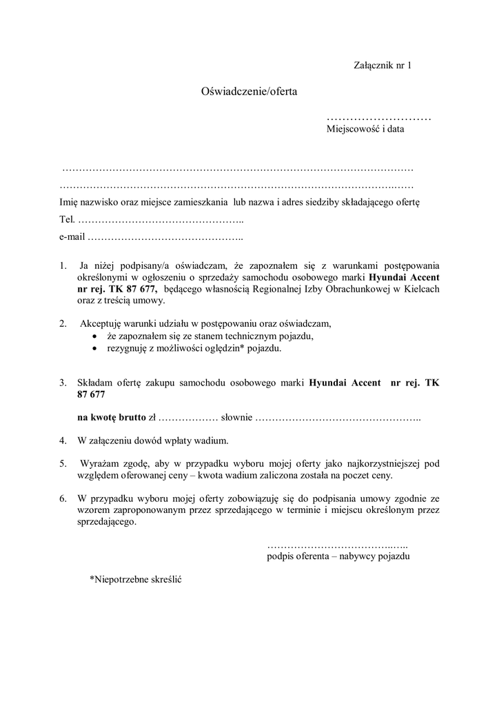 Załącznik nr 1 Oświadczenie/oferta ……………………… Miejscowość i data …………………………………………………………………………………………… ……………………………………………………………………………………….…… Imię nazwisko oraz miejsce zamieszkania lub nazwa i adres siedziby składającego ofertę Tel. ………………………………………….. e-mail ……………………………………….. 1. Ja niżej podpisany/a oświadczam, że zapoznałem się z warunkami postępowania określonymi w ogłoszeniu o sprzedaży samochodu osobowego marki Hyundai Accent nr rej. TK 87 677, będącego własnością Regionalnej Izby Obrachunkowej w Kielcach oraz z treścią umowy. 2. Akceptuję warunki udziału w postępowaniu oraz oświadczam, że zapoznałem się ze stanem technicznym pojazdu, rezygnuję z możliwości oględzin* pojazdu. 3. Składam ofertę zakupu samochodu osobowego marki Hyundai Accent nr rej. TK 87 677 na kwotę brutto zł ……………… słownie ………………………………………….. 4. W załączeniu dowód wpłaty wadium. 5. Wyrażam zgodę, aby w przypadku wyboru mojej oferty jako najkorzystniejszej pod względem oferowanej ceny – kwota wadium zaliczona została na poczet ceny. 6. W przypadku wyboru mojej oferty zobowiązuję się do podpisania umowy zgodnie ze wzorem zaproponowanym przez sprzedającego w terminie i miejscu określonym przez sprzedającego. ………………………………..….. podpis oferenta – nabywcy pojazdu *Niepotrzebne skreślić