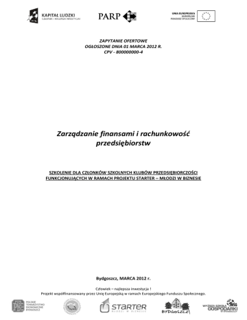 ZAPYTANIE OFERTOWE OGŁOSZONE DNIA 01 MARCA 2012 R. CPV - 800000000-4 Zarządzanie finansami i rachunkowość przedsiębiorstw SZKOLENIE DLA CZŁONKÓW SZKOLNYCH KLUBÓW PRZEDSIĘBIORCZOŚCI FUNKCJONUJĄCYCH W RAMACH PROJEKTU STARTER – MŁODZI W BIZNESIE Bydgoszcz, MARCA 2012 r. Człowiek – najlepsza inwestycja ! Projekt współfinansowany przez Unię Europejską w ramach Europejskiego Funduszu Społecznego. NAZWA I ADRES ZAMAWIAJĄCEGO POLSKIE TOWARZYSTWO EKONOMICZNE ODDZIAŁ W BYDGOSZCZY UL. DŁUGA 34, 85-034 BYDGOSZCZ TRYB ZAMÓWIENIA Postępowanie o udzielenie zamówienia w oparciu o zasadę konkurencyjności zgodną z Wytycznymi w zakresie kwalifikowania wydatków w ramach PO KL OPIS PRZEDMIOTU ZAMÓWIENIA Przedmiotem zamówienia jest wyłonienie trenerów do realizacji szkoleń dla członków Szkolnych Klubów Przedsiębiorczości (SzKP). Szkolenia stanowią element „Programu promującego postawy przedsiębiorcze i wspierające rozwój przedsiębiorczości wśród uczniów szkół ponadgimnazjalnych”, który w ramach projektu Starter-młodzi w biznesie realizowany jest w Klubach. Założenia Programu zakładają realizację szkoleń przygotowujące członków SzKP do napisania profesjonalnego biznesplanu. SzKP funkcjonują w 15 szkołach ponadgimnazjalnych na terenie województw: Kujawsko-pomorskiego, Warmińskomazurskiego oraz Pomorskiego. W ramach niniejszego zapytania poszukuje się Oferentów zdolnych do przeprowadzenia szkolenia z tematu: Zarządzanie finansami i rachunkowość przedsiębiorstw Wyłoniony trener zobowiązany jest do: poprowadzenia 6h szkolenia dla członków SzKP zgodnie z powyższą tematyką; opracowania pre i postestów badających postęp wiedzy uczestników szkolenia; opracowania materiałów szkoleniowych obejmujących, prócz programu szkolenia i realizowanego materiału, zestaw 3 scenariuszy dla Lokalnego Opiekuna SzKP wraz z metodyką i instrukcją. Scenariusze zawierać powinny materiał ćwiczeniowy nawiązujący do tematu szkolenia, przewidziany na min. 2h zajęć w formie indywidulanej i/lub zbiorowej pracy uczniów pod nadzorem Lokalnego Opiekuna SzKP. Po zakończonym szkoleniu Wykonawca zobowiązany będzie do wypełnienia odpowiedniej dokumentacji projektu oraz współpracy z projektodawcą w celu działań ewaluacyjnych. Szkolenia dla członków SzKP odbywać się będą w siedzibie szkoły, w której działa Klub, w salach udostępnionych przez dyrekcję na potrzeby organizacji szkolenia. Szkolne Kluby Przedsiębiorczości działają w następujących szkołach: 1. WOJ. POMORSKIE a. II Liceum Ogólnokształcące w Chojnicach b. Zespół Szkół Ogólnokształcących i Technicznych VII Liceum Ogólnokształcące w Słupsku Człowiek – najlepsza inwestycja ! Projekt współfinansowany przez Unię Europejską w ramach Europejskiego Funduszu Społecznego. c. Zespół Szkół Ponadgimnazjalnych nr 2 w Malborku d. Liceum Ogólnokształcące im. Wincentego Pola w Czersku e. I Liceum Ogólnokształcące w Starogardzie Gdańskim im. Marii Skłodowskiej – Curie 2. WOJ. WARMIŃSKO-MAZURSKIE a. Zespół Szkół nr 5 w Ełku b. Zespół Szkół Ogólnokształcących w Elblągu c. Zespół Szkół w Lubawie d. Zespół Szkół Ekonomiczno-Handlowych Olsztyn e. Liceum Ogólnokształcące w Zespole Szkół im. Cypriana K. Norwida w Nowym Mieście Lubawskim 3. WOJ. KUJAWSKO-POMORSKIE a. Zespół Szkół Ekonomiczno-Administracyjnych w Bydgoszczy (I) b. Zespół Szkół Ponadgimnazjalnych nr 4 w Inowrocławiu c. Zespół Szkół Ekonomicznych w Toruniu d. Zespół Szkół Ekonomicznych we Włocławku e. III Liceum Ogólnokształcące w Bydgoszczy (II) ZAKRES ZAMÓWIENIA Wykonawca zapewnia realizację programu szkoleniowego we wskazanych w ofercie Szkolnych Klubach Przedsiębiorczości. Przez program rozumie się poprowadzenie szkolenia metodą wykładowo-warsztatową z wykorzystaniem prezentacji multimedialnej i/lub technik interaktywnej pracy grupowej. Częścią programu szkoleniowego będą także materiały ćwiczeniowe, przekazywane Lokalnemu Opiekunowi SzKP do realizacji podczas spotkań Klubu po zakończeniu szkolenia. Dopuszcza się składanie ofert cząstkowych obejmujących deklarację do poprowadzenia szkolenia w jednej lub kilku szkołach. W ofercie Oferent jest zobowiązany wyraźnie zaznaczyć jakiej szkoły / jakich szkół dotyczy składana przez niego oferta. TERMIN SKŁADANIA OFERT Oferty można składać do 15marca 2012 r. do godz. 12. osobiście w biurze zleceniodawcy, za pośrednictwem poczty elektronicznej, lub za pośrednictwem poczty tradycyjnej. Oferty przesłane po wskazanym wyżej terminie nie będą brane pod uwagę. TERMIN WYKONANIA ZAMÓWIENIA Wykonawca realizować będzie zamówienie w terminie od marca 2012 r do czerwca 2012 r. Człowiek – najlepsza inwestycja ! Projekt współfinansowany przez Unię Europejską w ramach Europejskiego Funduszu Społecznego. WARUNKI UDZIAŁU W POSTĘPOWANIU OFERTOWYM O udzielenie zamówienia mogą ubiegać się osoby, które spełniają warunki wymieniane w zapytaniu ofertowym oraz złożą oświadczenie o spełnianiu tych warunków na załączonym do zapytania formularzu oferty (załącznik nr 1), a ponadto potwierdzą je w przedstawionym życiorysie (CV). W przypadku składania ofert cząstkowych wymagane jest zadeklarowanie jakiej szkoły / szkół dotyczy oferta. O udzielenie zamówienia mogą ubiegać się osoby niepowiązane kapitało ani osobowo z Zamawiającym lub osobami upoważnionymi do zaciągania zobowiązań w imieniu Zamawiającego lub osobami wykonującymi w imieniu Zamawiającego czynności związane z przygotowaniem i przeprowadzeniem procedury wyboru wykonawcy. W myśl zapisów Wytycznych dotyczących kwalifikowania wydatków PO KL przez powiązanie kapitałowe lub osobowe należy rozmieć: uczestniczenie w spółce jako wspólnik spółki cywilnej lub spółki osobowej posiadaniu co najmniej 10% udziałów lub akcji pełnienie funkcji członka organu nadzorczego 