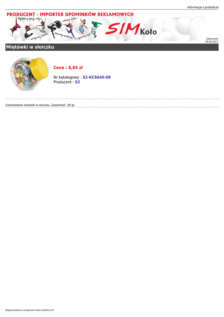 Informacje o produkcie Utworzono 08-03-2017 Miętówki w słoiczku Cena : 8,84 zł Nr katalogowy : S2-KC6640-08 Producent : S2 Czekoladowe drażetki w słoiczku. Zawartość: 30 gr. Wygenerowano w programie www.oscGold.com