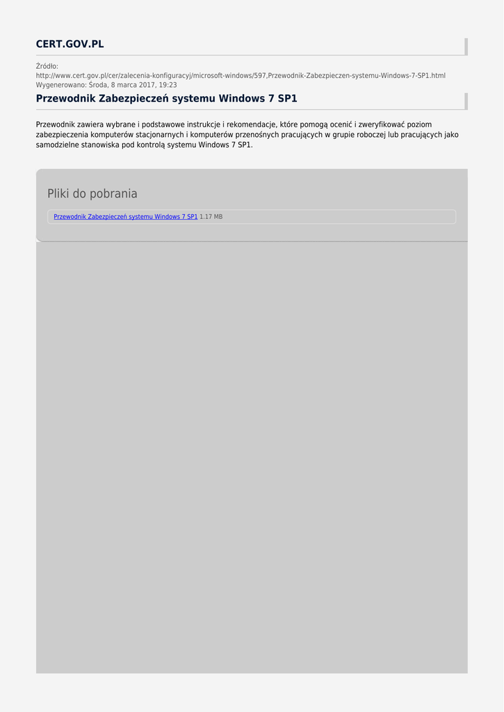 CERT.GOV.PL Źródło: http://www.cert.gov.pl/cer/zalecenia-konfiguracyj/microsoft-windows/597,Przewodnik-Zabezpieczen-systemu-Windows-7-SP1.html Wygenerowano: Środa, 8 marca 2017, 19:23 Przewodnik Zabezpieczeń systemu Windows 7 SP1 Przewodnik zawiera wybrane i podstawowe instrukcje i rekomendacje, które pomogą ocenić i zweryfikować poziom zabezpieczenia komputerów stacjonarnych i komputerów przenośnych pracujących w grupie roboczej lub pracujących jako samodzielne stanowiska pod kontrolą systemu Windows 7 SP1. Pliki do pobrania Przewodnik Zabezpieczeń systemu Windows 7 SP1 1.17 MB zabezpieczenia, przewodnik zabezpieczeń, przewodnik, Win7, zalecenia, Windows 7, Microsoft Ocena: 4.3/5 (6)