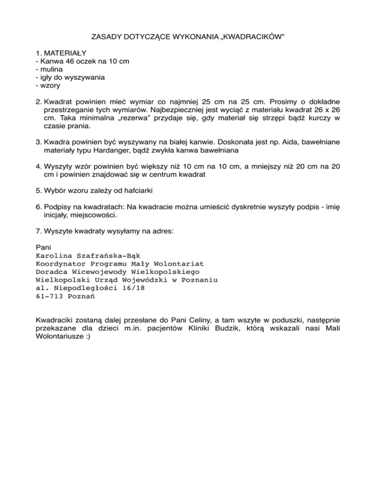 ZASADY DOTYCZĄCE WYKONANIA „KWADRACIKÓW” 1. MATERIAŁY - Kanwa 46 oczek na 10 cm - mulina - igły do wyszywania - wzory 2. Kwadrat powinien mieć wymiar co najmniej 25 cm na 25 cm. Prosimy o dokładne przestrzeganie tych wymiarów. Najbezpieczniej jest wyciąć z materiału kwadrat 26 x 26 cm. Taka minimalna „rezerwa” przydaje się, gdy materiał się strzępi bądź kurczy w czasie prania. 3. Kwadra powinien być wyszywany na białej kanwie. Doskonała jest np. Aida, bawełniane materiały typu Hardanger, bądź zwykła kanwa bawełniana 4. Wyszyty wzór powinien być większy niż 10 cm na 10 cm, a mniejszy niż 20 cm na 20 cm i powinien znajdować się w centrum kwadrat 5. Wybór wzoru zależy od hafciarki 6. Podpisy na kwadratach: Na kwadracie można umieścić dyskretnie wyszyty podpis - imię inicjały, miejscowości. 7. Wyszyte kwadraty wysyłamy na adres: Pani Karolina Szafrańska-Bąk Koordynator Programu Mały Wolontariat Doradca Wicewojewody Wielkopolskiego Wielkopolski Urząd Wojewódzki w Poznaniu al. Niepodległości 16/18 61-713 Poznań Kwadraciki zostaną dalej przesłane do Pani Celiny, a tam wszyte w poduszki, następnie przekazane dla dzieci m.in. pacjentów Kliniki Budzik, którą wskazali nasi Mali Wolontariusze :)
