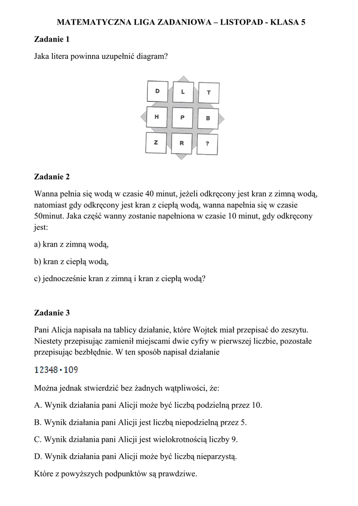 MATEMATYCZNA LIGA ZADANIOWA – LISTOPAD - KLASA 5 Zadanie 1 Jaka litera powinna uzupełnić diagram? Zadanie 2 Wanna pełnia się wodą w czasie 40 minut, jeżeli odkręcony jest kran z zimną wodą, natomiast gdy odkręcony jest kran z ciepłą wodą, wanna napełnia się w czasie 50minut. Jaka część wanny zostanie napełniona w czasie 10 minut, gdy odkręcony jest: a) kran z zimną wodą, b) kran z ciepłą wodą, c) jednocześnie kran z zimną i kran z ciepłą wodą? Zadanie 3 Pani Alicja napisała na tablicy działanie, które Wojtek miał przepisać do zeszytu. Niestety przepisując zamienił miejscami dwie cyfry w pierwszej liczbie, pozostałe przepisując bezbłędnie. W ten sposób napisał działanie Można jednak stwierdzić bez żadnych wątpliwości, że: A. Wynik działania pani Alicji może być liczbą podzielną przez 10. B. Wynik działania pani Alicji jest liczbą niepodzielną przez 5. C. Wynik działania pani Alicji jest wielokrotnością liczby 9. D. Wynik działania pani Alicji może być liczbą nieparzystą. Które z powyższych podpunktów są prawdziwe. Zadanie 4 W czworokącie ABCD kąt przy wierzchołku C jest o 30o większy od kąta przy wierzchołku A, kąt przy wierzchołku D jest dwa razy większy od kąta C, a kąt przy wierzchołku B jest o 30o większy od sumy kątów przy wierzchołkach A i C. Jakie miary mają kąty tego czworokąta? Zadanie 5 8 zer i 8 jedynek ustaw w tablicy 4 x 4 tak, żeby suma liczb w każdym wierszu i w każdej kolumnie były nieparzyste. POWODZENIA :-)