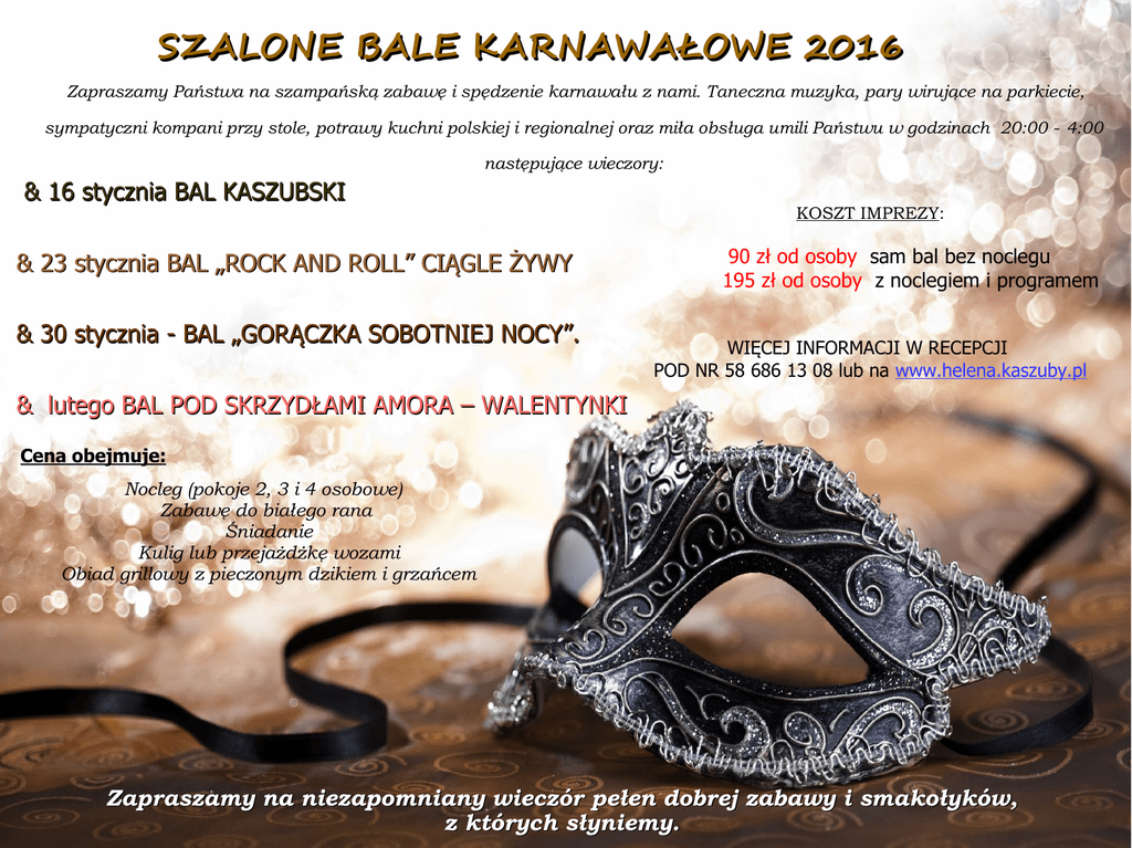 SZALONE BALE KARNAWAŁOWE 2016 Zapraszamy Państwa na szampańską zabawę i spędzenie karnawału z nami. Taneczna muzyka, pary wirujące na parkiecie, sympatyczni kompani przy stole, potrawy kuchni polskiej i regionalnej oraz miła obsługa umili Państwu w godzinach 20:00 - 4:00 następujące wieczory: & 16 stycznia BAL KASZUBSKI & 23 stycznia BAL „ROCK AND ROLL” CIĄGLE ŻYWY & 30 stycznia - BAL „GORĄCZKA SOBOTNIEJ NOCY”. KOSZT IMPREZY: 90 zł od osoby sam bal bez noclegu 195 zł od osoby z noclegiem i programem WIĘCEJ INFORMACJI W RECEPCJI POD NR 58 686 13 08 lub na www.helena.kaszuby.pl & lutego BAL POD SKRZYDŁAMI AMORA – WALENTYNKI Cena obejmuje: Nocleg (pokoje 2, 3 i 4 osobowe) Zabawę do białego rana Śniadanie Kulig lub przejażdżkę wozami Obiad grillowy z pieczonym dzikiem i grzańcem Zapraszamy na niezapomniany wieczór pełen dobrej zabawy i smakołyków, z których słyniemy.