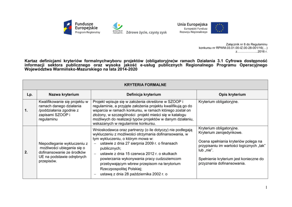Załącznik nr 8 do Regulaminu konkursu nr RPWM.03.01.00-IZ.00-28-001/16(…) z………………..2016 r. Kartaz definicjami kryteriów formalnychwyboru projektów (obligatoryjne)w ramach Działania 3.1 Cyfrowa dostępność informacji sektora publicznego oraz wysoka jakość e-usług publicznych Regionalnego Programu Operacyjnego Województwa Warmińsko-Mazurskiego na lata 2014-2020 KRYTERIA FORMALNE Lp. 1. 2. Nazwa kryterium Definicja kryterium Kwalifikowanie się projektu w ramach danego działania /poddziałania zgodnie z zapisami SZOOP i regulaminu Projekt wpisuje się w założenia określone w SZOOP i regulaminie, a przyjęte założenia projektu kwalifikują go do wsparcia w ramach konkursu, w ramach którego został on złożony, w szczególności projekt mieści się w katalogu możliwych do realizacji typów projektów w danym działaniu, wskazanych w regulaminie konkursu. Kryterium obligatoryjne. Wnioskodawca oraz partnerzy (o ile dotyczy) nie podlegają wykluczeniu z możliwości otrzymania dofinansowania, w tym wykluczeniu, o którym mowa w: ustawie z dnia 27 sierpnia 2009 r. o finansach publicznych; ustawie z dnia 15 czerwca 2012 r. o skutkach powierzania wykonywania pracy cudzoziemcom przebywającym wbrew przepisom na terytorium Rzeczpospolitej Polskiej; ustawą z dnia 28 października 2002 r. o Kryterium obligatoryjne. Kryterium zerojedynkowe. Niepodleganie wykluczeniu z możliwości ubiegania się o dofinansowanie ze środków UE na podstawie odrębnych przepisów. Opis kryterium Ocena spełniania kryteriów polega na przypisaniu im wartości logicznych „tak” lub „nie”. Spełnienie kryterium jest konieczne do przyznania dofinansowania. 1 odpowiedzialności podmiotów zbiorowych za czyny zabronione pod groźbą kary. Kryterium weryfikowane na podstawie oświadczenia wnioskodawcy i partnerów, (jeśli dotyczy). Kryterium obligatoryjne. Kryterium zerojedynkowe. 3. 4. Wartość projektu oraz poziom dofinansowania projektu. Spełnienie wymogów w odniesieniu do projektu partnerskiego. Wartość projektu i jego poziom dofinansowania są zgodne z minimalną i maksymalną wartością projektu oraz minimalnym i maksymalnym poziomem dofinansowania obowiązującymi dla danego działania/poddziałania/typu projektu określonymi w SZOOP i regulaminie konkursu. Weryfikowane będzie spełnienie przez Wnioskodawcę wymogów w zakresie utworzenia partnerstwa zgodnie z ustawą wdrożeniową. Kryterium będzie weryfikowane na podstawiezawartego i dołączonego do wniosku o dofinansowanie porozumienia lub / oraz umowy Wnioskodawcy oraz treści wniosku o dofinansowanie. Ocena spełniania kryteriów polega na przypisaniu im wartości logicznych „tak” lub „nie” albo stwierdzeniu, że kryterium nie dotyczy danego projektu. Spełnienie kryterium jest konieczne do przyznania dofinansowania. Kryterium obligatoryjne. Kryterium zerojedynkowe. Ocena spełniania kryteriów polega na przypisaniu im wartości logicznych „tak” lub „nie” albo stwierdzeniu, że kryterium nie dotyczy danego projektu. Spełnienie kryterium jest konieczne do przyznania dofinansowania. Kryterium obligatoryjne. Kryterium zerojedynkowe. 5. 6. Uprawnienia podmiotu do ubiegania się o dofinansowanie Obszar realizacji projektu. Weryfikowana będzie zgodność formy prawnej Wnioskodawcy/partnera, (jeśli dotyczy) z typem beneficjentów wskazanym w SZOOP i regulaminie konkursu. Weryfikowane będzie czy wskazany obszar realizacji projektu jest zgodny ze wskazanym w SZOOP i regulaminie. Ocena spełniania kryteriów polega na przypisaniu im wartości logicznych „tak” lub „nie”. Spełnienie kryterium jest konieczne do przyznania dofinansowania. Kryterium obligatoryjne. Kryterium zerojedynkowe. Ocena spełniania kryteriów polega na 2 przypisaniu im wartości logicznych „tak”, „nie”. Spełnienie kryterium jest konieczne do przyznania dofinansowania. Kryterium obligatoryjne. Kryterium zerojedynkowe. 7. Poprawne zastosowanie cross-financingu Weryfikowane będzie czy warunki i planowany zakres stosowania cross-financingu nie przekraczają poziomu wskazanego w pkt 15 SZOOP „Warunki i planowany zakres stosowania cross-financingu (%)”. Ocena spełniania kryteriów polega na przypisaniu im wartości logicznych „tak” lub „nie” albo stwierdzaniu, że kryterium nie dotyczy danego projektu. Spełnienie kryterium jest konieczne do przyznania dofinansowania. 3