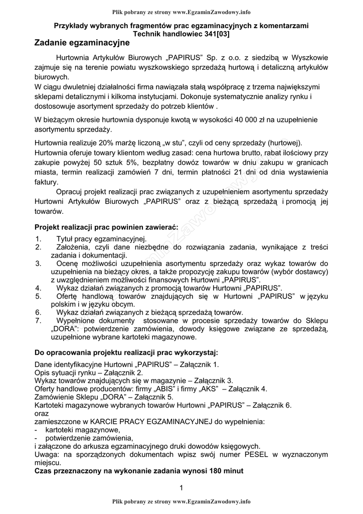 Plik pobrany ze strony www.EgzaminZawodowy.info Przykłady wybranych fragmentów prac egzaminacyjnych z komentarzami Technik handlowiec 341[03] Zadanie egzaminacyjne Hurtownia Artykułów Biurowych „PAPIRUS” Sp. z o.o. z siedzibą w Wyszkowie zajmuje się na terenie powiatu wyszkowskiego sprzedażą hurtową i detaliczną artykułów biurowych. W ciągu dwuletniej działalności firma nawiązała stałą współpracę z trzema największymi sklepami detalicznymi i kilkoma instytucjami. Dokonuje systematycznie analizy rynku i dostosowuje asortyment sprzedaży do potrzeb klientów . W bieżącym okresie hurtownia dysponuje kwotą w wysokości 40 000 zł na uzupełnienie asortymentu sprzedaży. Hurtownia realizuje 20% marżę liczoną „w stu”, czyli od ceny sprzedaży (hurtowej). Hurtownia oferuje towary klientom według zasad: cena hurtowa brutto, rabat ilościowy przy zakupie powyżej 50 sztuk 5%, bezpłatny dowóz towarów w dniu zakupu w granicach miasta, termin realizacji zamówień 7 dni, termin płatności 21 dni od dnia wystawienia faktury. Opracuj projekt realizacji prac związanych z uzupełnieniem asortymentu sprzedaży Hurtowni Artykułów Biurowych „PAPIRUS” oraz z bieżącą sprzedażą i promocją jej towarów. Projekt realizacji prac powinien zawierać: 1. 2. 3. 4. 5. 6. 7. Tytuł pracy egzaminacyjnej. Założenia, czyli dane niezbędne do rozwiązania zadania, wynikające z treści zadania i dokumentacji. Ocenę możliwości uzupełnienia asortymentu sprzedaży oraz wykaz towarów do uzupełnienia na bieżący okres, a także propozycję zakupu towarów (wybór dostawcy) z uwzględnieniem możliwości finansowych Hurtowni „PAPIRUS”. Wykaz działań związanych z promocją towarów Hurtowni „PAPIRUS”. Ofertę handlową towarów znajdujących się w Hurtowni „PAPIRUS” w języku polskim i w języku obcym. Wykaz działań związanych z bieżącą sprzedażą towarów. Wypełnione dokumenty stosowane w procesie sprzedaży towarów do Sklepu „DORA”: potwierdzenie zamówienia, dowody księgowe związane ze sprzedażą, uzupełnione wybrane kartoteki magazynowe. Do opracowania projektu realizacji prac wykorzystaj: Dane identyfikacyjne Hurtowni „PAPIRUS” – Załącznik 1. Opis sytuacji rynku – Załącznik 2. Wykaz towarów znajdujących się w magazynie – Załącznik 3. Oferty handlowe producentów: firmy „ABIS” i firmy „AKS” – Załącznik 4. Zamówienie Sklepu „DORA” – Załącznik 5. Kartoteki magazynowe wybranych towarów Hurtowni „PAPIRUS” – Załącznik 6. oraz zamieszczone w KARCIE PRACY EGZAMINACYJNEJ do wypełnienia: - kartoteki magazynowe, - potwierdzenie zamówienia, i załączone do arkusza egzaminacyjnego druki dowodów księgowych. Uwaga: na sporządzonych dokumentach wpisz swój numer PESEL w wyznaczonym miejscu. Czas przeznaczony na wykonanie zadania wynosi 180 minut 1 Plik pobrany ze strony www.EgzaminZawodowy.info Plik pobrany ze strony www.EgzaminZawodowy.info Technik handlowiec 341[03] Załącznik 1. Dane identyfikacyjne Hurtowni „PAPIRUS” Hurtownia Artykułów Biurowych „PAPIRUS” Sp. z o.o. Siedziba: 07-200 Wyszków, ul. Leśna 4 NIP: 762-334-88-11 REGON: 313245678 Tel.: (29) 742-34-18 Numer rachunku: Bank BPH S.A. O/Wyszków 28 1122 0077 0000 4444 4001 5566 Spółka zarejestrowana w Sądzie Rejonowym dla m.st. Warszawa XIX Wydział Gospodarczy Krajowego Rejestru Sądowego pod nr KRS 000088776655 Kapitał zakładowy spółki 720 000 zł. Osobą upoważnioną do wystawienia faktur VAT i zatwierdzania dowodu Wz jest Jan Nowak, wystawia Wz i wydaje towar – Maria Król. Towar odbiera osoba, która podpisała zamówienie. Numeracja dokumentów prowadzona jest odrębnie w ramach grup rodzajowych, w każdym miesiącu od początku, ze wskazaniem miesiąca i roku, np.: 1/06/07 (nr, m-c, rok). Ostatnimi wystawionymi dokumentami są: - faktura VAT 56/06/2007; - Wz 61/06/2007. Towary są opodatkowane stawką podstawową. Załącznik 2. Opis sytuacji rynku Hurtownia Artykułów Biurowych „PAPIRUS” Sp. z o.o. swym zasięgiem obejmuje głównie teren miasta Wyszków, w którym znajdują się: - 5 szkół podstawowych, - 2 gimnazja, - 5 szkół średnich, - 1 uczelnia wyższa, - około 20 zakładów pracy. Potencjalnymi klientami Hurtowni „PAPIRUS” są właściciele trzech sklepów detalicznych powiatu wyszkowskiego oraz szkoły i zakłady pracy. Prognozy zakupu na czerwiec 2007 r. (w oparciu o wyniki badań ankietowych przeprowadzonych przez pracowników ds. marketingu) są następujące: L.p. Nazwa towaru 1 Toner do kopiarek Koma 2 Teczka kartonowa foliowana z gumką 3 Kostka samoprzylepna 76 x 76 mm Ilość (w szt.) 400 250 170 2 Plik pobrany ze strony www.EgzaminZawodowy.info Plik pobrany ze strony www.EgzaminZawodowy.info Technik handlowiec 341[03] Załącznik 3. Wykaz towarów znajdujących się w magazynie Towar Ilość (w szt.) Segregator A4 Teczka kartonowa foliowana z gumką Długopis Tenel czarny Tusz do drukarek Koma Kostka samoprzylepna 76 x 76 mm 400 40 Cena zakupu netto w zł 4,40 1,90 200 100 250 3,20 45,80 5,00 Towary ewidencjonowane są w cenach zakupu. Załącznik 4. Oferty handlowe producentów: firmy „ABIS” i firmy „AKS” OFERTA I „ABIS” Sp. z o.o. ul. Bliska 13 03-804 Warszawa NIP 789-055-44-32 1. Toner do kopiarek Koma cena netto: 80,00 zł cena brutto: 97,60 zł 2. Teczka kartonowa foliowana z gumką cena netto: 1,93 zł cena brutto: 2,35 zł 3 Plik pobrany ze strony www.EgzaminZawodowy.info Plik pobrany ze strony www.EgzaminZawodowy.info Technik handlowiec 341[03] 3. Długopis Tenel: czarny, niebieski, czerwony, zielony cena netto: 3,26 zł cena brutto: 3,98 zł Przy zakupie powyżej 100 sztuk 15% rabatu Bezpłatny dowóz towarów w dniu zakupu w granicach miasta Termin realizacji zamówienia: 7 dni Termin płatności: 21 dni od dnia wystawienia faktury OFERTA II „AKS” Sp. z o.o. ul. Miła 11 03-804 Warszawa NIP 789-066-55-43 1. 2. 3. 4. Toner do kopiarek Koma Teczk