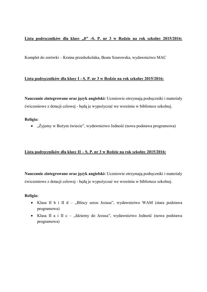 Lista podręczników dla klasy ,,0" -S. P. nr 3 w Redzie na rok szkolny 2015/2016: Komplet do zerówki – Kraina przedszkolaka, Beata Szurowska, wydawnictwo MAC Lista podręczników dla klasy I - S. P. nr 3 w Redzie na rok szkolny 2015/2016: Nauczanie zintegrowane oraz język angielski: Uczniowie otrzymają podręczniki i materiały ćwiczeniowe z dotacji celowej - będą je wypożyczać we wrześniu w bibliotece szkolnej. Religia: „Żyjemy w Bożym świecie”, wydawnictwo Jedność (nowa podstawa programowa) Lista podręczników dla klasy II – S. P. nr 3 w Redzie na rok szkolny 2015/2016: Nauczanie zintegrowane oraz język angielski: Uczniowie otrzymają podręczniki i materiały ćwiczeniowe z dotacji celowej - będą je wypożyczać we wrześniu w bibliotece szkolnej. Religia: Klasa II b i II d – „Bliscy sercu Jezusa”, wydawnictwo WAM (stara podstawa programowa) Klasa II a i II c – „Idziemy do Jezusa”, wydawnictwo Jedność (nowa podstawa programowa) Lista podręczników dla klasy III -S. P. nr 3 w Redzie na rok szkolny 2015/2016: Nauczanie zintegrowane: „ Oto ja” – P. Tkacz, D. Wosianek- pakiet podręczników do klasy 3 Język angielski: „Bugs World 3. Workbook B”- podręcznik +zeszyt współpracy, wydawnictwo MacMillan Religia: „Jezusowa wspólnota serc” - wydawnictwo WAM – podręcznik + ćwiczenia Lista podręczników dla klas IV -S. P. nr 3 w Redzie na rok szkolny 2015/2016: Uczniowie otrzymają podręczniki i materiały ćwiczeniowe z dotacji celowej - będą je wypożyczać we wrześniu w bibliotece szkolnej. Religia: „Miejsce pełne BOGActw”, wydawnictwo Jedność, podręcznik + ćwiczenia Lista podręczników dla klas V –S. P. nr 3 w Redzie na rok szkolny 2015/2016: Język polski: „Czarowanie słowem” podręcznik do języka polskiego dla szkoły podstawowej, klasa 5, A. Kania, K. Kwak, J. Majchrzak- Broda, wydawnictwo WSiP, książka + ćwiczenia Język angielski: „Discover English 2” (podręcznik + ćwiczenia), wydawnictwo Pearson, I. Hearn, J. Wildman (wydanie egzaminacyjne) Historia: „Historia i społeczeństwo” –Tomasz Małkowski, Jacek Rześniowiecki, Gdańskie Wydawnictwo Oświatowe, cykl Wehikuł czasu, podręcznik + ćwiczenia Atlas historyczny do użytku domowego Matematyka: „Matematyka wokół nas”, wydawnictwo WSiP, podręcznik + ćwiczenia, podstawa programowa nowa Przyroda: „Przyroda z klasą- 5, E. Frąckowiak, J. Beniowska, E. Gęca, P. Jeruszka, wydawnictwo KLETT, podręcznik + ćwiczenia Atlas „Przyroda z klasą”, wydawnictwo KLETT (atlas z klasy IV- kontynuacja) Religia: „Spotkanie uBOGAcające”, wydawnictwo „Jedność”, podręcznik + ćwiczenia Plastyka: „Plastyka- V”, Krzysztof Stopczyk, WSiP Muzyka: Kontynuacja z klasy IVwydawnictwo Operon „Odkrywamy na nowo” klasy IV- VI podręcznik, Informatyka: Kontynuacja z klasy IV - Zajęcia komputerowe dla szkoły podstawowej kl. IV- VI, Grażyna Koba, wydawnictwo Migra Zajęcia techniczne: Kontynuacja z klasy IV - Zajęcia techniczne „Jak to działa”, podręcznik z ćwiczeniami, Lech Łabecki, Marta Łabecka , wydawnictwo Nowa Era Lista podręczników dla klas VI- S. P. nr 3 w Redzie na rok szkolny 2015/2016: Język polski: „Czarowanie słowem” podręcznik do języka polskiego dla szkoły podstawowej, klasa 6, A. Kania, K. Kwak, J. Majchrzak- Broda, wydawnictwo WSiP, książka + ćwiczenia Język angielski: „ Discover English 3”- podręcznik i ćwiczenia, wydawnictwo Pearson Historia: „Historia i społeczeństwo” –Tomasz Małkowski, Jacek Rześniowiecki, Gdańskie Wydawnictwo Oświatowe, cykl Wehikuł czasu, podręcznik + ćwiczenia Atlas historyczny do użytku domowego Matematyka: „Matematyka wokół nas”, wydawnictwo WSiP, podręcznik + ćwiczenia, nowa podstawa programowa Przyroda: „Przyroda z klasą- 6, E. Frąckowiak, J. Beniowska, E. Gęca, P. Jeruszka, wydawnictwo KLETT, podręcznik i ćwiczenia Atlas „Przyroda z klasą”, wydawnictwo KLETT (atlas z klasy IV) Religia: „Tajemnice BOGAtego życia” –wydawnictwo „Jedność”, podręcznik + ćwiczenia Plastyka: „Plastyka- 6”, Krzysztof Stopczyk, wydawnictwo WSiP Informatyka: Kontynuacja z klasy IV i V - Zajęcia komputerowe dla szkoły podstawowej kl. IVVI, Grażyna Koba, wydawnictwo Migra Zajęcia techniczne: Kontynuacja z klasy IV i V - Zajęcia techniczne „Jak to działa”, podręcznik z ćwiczeniami, Lech Łabecki, Marta Łabecka , wydawnictwo Nowa Era Muzyka: Kontynuacja z klasy IV i V- „Odkrywamy na nowo” klasy IV- VI podręcznik, wydawnictwo Operon