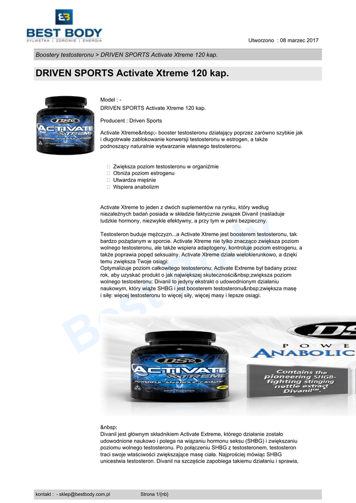 Utworzono : 08 marzec 2017 Boostery testosteronu > DRIVEN SPORTS Activate Xtreme 120 kap. DRIVEN SPORTS Activate Xtreme 120 kap. Model : DRIVEN SPORTS Activate Xtreme 120 kap. Producent : Driven Sports Activate Xtreme - booster testosteronu działający poprzez zarówno szybkie jak i długotrwałe zablokowanie konwersji testosteronu w estrogen, a także podnoszący naturalnie wytwarzanie własnego testosteronu. � Zwiększa poziom testosteronu w organiźmie � Obniża poziom estrogenu � Utwardza mięśnie � Wspiera anabolizm Activate Xtreme to jeden z dwóch suplementów na rynku, który według niezależnych badań posiada w składzie faktycznie związek Divanil (naśladuje ludzkie hormony, niezwykle efektywny, a przy tym w pełni bezpieczny. y d Testosteron buduje mężczyzn...a Activate Xtreme jest boosterem testosteronu, tak bardzo pożądanym w sporcie. Activate Xtreme nie tylko znacząco zwiększa poziom wolnego testosteronu, ale także wspiera adaptogeny, kontroluje poziom estrogenu, a także poprawia popęd seksualny. Activate Xtreme działa wielokierunkowo, a dzięki temu zwiększa Twoje osiągi: Optymalizuje poziom całkowitego testosteronu: Activate Extreme był badany przez rok, aby uzyskać produkt o jak największej skuteczności zwiększa poziom wolnego testosteronu: Divanil to jedyny ekstrakt o udowodnionym działaniu naukowym, który wiąże SHBG i jest boosterem testosteronu zwiększa masę i siłę: więcej testosteronu to więcej siły, więcej masy i lepsze osiągi. t s e B o B Divanil jest głównym składnikiem Activate Extreme, którego działanie zostało udowodnione naukowo i polega na wiązaniu hormonu seksu (SHBG) i zwiększaniu poziomu wolnego testosteronu. Po połączeniu SHBG z testosteronem, testosteron traci swoje właściwości zwiększające masę ciała. Najprościej mówiąc SHBG unicestwia testosteron. Divanil na szczęście zapobiega takiemu działaniu i sprawia, kontakt : - [email protected] Strona 1/{nb} Utworzono : 08 marzec 2017 Boostery testosteronu > DRIVEN SPORTS Activate Xtreme 120 kap. DRIVEN SPORTS Activate Xtreme 120 kap. że testosteron jest cały czas aktywny. Driven Sports Activate Xtreme zawiera wyłącznie sprawdzone składniki w skutecznych dawkach, takie jak: Divanillyl Tetrahydrofuran to wysokiej jakości ekstrakt z Urtica Dioica (pokrzywa zwyczajna) standaryzowany na zawartość lignanów. Są to związki zaliczane, obok m.in.: izoflawonów ikKumestanów, do grupy fitoestrogenów. Środki z tej grupy wykazują zdolność naśladowania hormonów naturalnie wytupujących w ludzkim organizmie. Suplementacja lignanami wpływa na poziom: wolnego Testosteronu (ograniczają aktywność SHGB), trójjodotyroniny - główny hormon tarczycy, niezbędny do poprawnego funkcjonowania całego organizmu, IGF-1 insulinopodobny czynnik wzrostu. Potężny anabolik występujący w naszym organizmie. Mucuna Pruriens czyli świerzbiec właściwy to roślina z rodziny bobowatych, pochodząca z Azji Wschodniej. Znajduje zastosowanie m.in. w przeciwdziałaniu skutkom choroby Parkinsona. Dopa mucuna to roślina lecznicza tradycyjnie stosowana w medycynie indyjskiej. Jej nasiona zawierają będący neurotransmiterem związek organiczny L-Dopa, który jest prekursorem dopaminy. Dopamina odgrywa bardzo ważną rolę w metabolizmie mózgowym jako substancja sygnałowa nerwów. Ilość dopaminy w mózgu zmniejsza się też wraz z wiekiem. Skutkiem tego jest stłumiony nastrój, brak uwagi i żywotności. Przeciwdziała temu właśnie Mucuna Pruriens. t s e B y d o B L-Dopa to naturalny aminokwas, amina katecholowa, powstała w procesie hydroksylacji tyrozyny, na skutek reakcji prowadzonej przez hydroksylazę tyrozynową. Jest prekursorem dopaminy, powodującym zwiększenie stężenia tego neuroprzekaźnika w mózgu. Tongkat Ali - działa głównie poprzez inhibicje enzymu acetylocholinoesterazy (AChe) co w bezpośredni sposób prowadzi do podwyższenia poziomu neurotransmiterów odpowiedzialnych za pobudzenie seksualne. Dodatkowo wpływa pozytywnie na poziom testosteronu. Różeniec Górski - roślina zaliczana do grupy adaptogenów, czyli takich roślin, kontakt : - [email protected] Strona 2/{nb} Utworzono : 08 marzec 2017 Boostery testosteronu > DRIVEN SPORTS Activate Xtreme 120 kap. DRIVEN SPORTS Activate Xtreme 120 kap. które pomagają organizmowi w przystosowaniu się do dużego obciążenia psychicznego i fizycznego. Jej główne działanie polega na znoszeniu zmęczenia, poprawianiu koncentracji oraz polepszaniu nastroju. Wszystko to przekłada się na lepsze wyniki zarówno na siłowni, jak również w pracy czy szkole. Proanthocyanidins - bardzo silny antyoksydant o wszechstronnym działaniu na organizm (wzmacnia odporność, poprawia wygląd cery). Zwiększa produkcje tlenku azotu i bardzo korzystnie wpływa na erekcje. Indole-3-Karbinol - działa głownie antyestrogenowo, przekształcając aktywny estrogen w jego formę mniej aktywna - 2-hydroksy estrogen. Jest to naturalny związek fitochemiczny cechujący się niezwykle silnymi właściwościami antyoksydacyjnymi. Basella Alba - pokrewna szpinaku, zwiększa produkcje testosteronu u mężczyzn. Korzystnie wpływa na przyrost suchej masy i siły mięśniowej. Cynk - niezbędny w syntezie białka, wytwarzaniu testosteronu oraz kwasów nukleinowych, kieruje kurczliwością mięśni, ma swój udział w procesie tworzenia insuliny, przyspiesza gojenie ran, poprawia sprawność umysłową, bierze udział w wytwarzaniu prostaglandyn regulujących ciśnienie krwi oraz rytm pracy serca, normalizuje poziom leptyny. t s e B y d o B Activate Xtreme idealnie współdziała z Triazole oraz Lean Xtreme. kontakt : - [email protected] Strona 3/{nb} Utworzono : 08 marzec 2017 Boostery testosteronu > DRIVEN SPORTS Activate Xtreme 120 kap. DRIVEN SPORTS Activate Xtreme 120 kap. t s e B kontakt : - [email protected] Strona 4/{nb} o B y d Utworzono : 08 marzec 2017 Boostery testosteronu > DRIVEN SPORTS Activate 