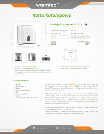 podajnik ręczników ZZ Podajnik na ręczniki ZZ ABS Karta katalogowa POJEMNOŚĆ ZASOBNIKA 500 szt. WIELKOŚĆ LISTKA 250 mm x 230 mm KOLOR BIAŁY, SREBRNO - GRAFITOWA WAGA 0,64kg 0,8 kg GWARANCJA (door-to-door) 2 lata m 0m 305 mm 13 260 mm ü ü ü ü zamykany na specjalny "kluczyk", obudowa z trwałego tworzywa ABS, wizjer w kształcie kropli - do kontroli poziomu wkładu, wyciągnięcie jednej sztuki papieru powoduje wysunięcie się kolejnej, ü ü prosta obsługa - łatwe napełnianie pojemnika, opakowanie zawiera zestaw montażowy. Zastosowanie ü ü ü ü ü ü ü ü hotele, restauracje, biura, salony kosmetyczne, SPA, placówki szkolne, szpitale, domowe kuchnie lub łazienki. Funkcjonalny podajnik marki WARMTEC na ręczniki papierowe ZZ (w listkach), należy do popularnej serii PLUM. Jest to linia produktów WARMTEC specjalnie zaprojektowanych pod kątem funkcjonalności oraz przyjemnej dla oka estetyki. Podajnik wykonany jest z odpornego na zarysowania tworzywa ABS wysokiej jakości. Dzięki czemu jest trwały i odporny na uszkodzenia mechaniczne. Funkcjonalny i praktyczny, do wykorzystania w każdej łazience, a także kuchni. Przeźroczysty wizjer w kształcie kropli pozwala na łatwą kontrolę zużycia wkładu. Podajnik zamykany jest na specjalny "kluczyk" pozwalając skutecznie chronić jego zawartość. Dzięki prostej obsłudze oraz łatwej wymianie, podajnik szczególnie polecany jest do obiektów użyteczności publicznej. Sposób dozowania polega na wyciągnięciu jednej sztuki papieru, co automatycznie spowoduje wysunięcie się kolejnej sztuki. www.warmtec.pl www.warmtec.pl [email protected] WARMTEC Sp. z o.o., Al. Jana Pawła II 27, 00-867 Warszawa V. 1.03