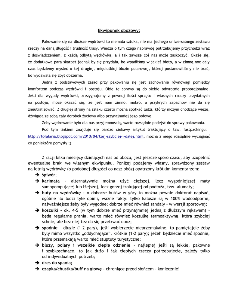 Ekwipunek obozowy: Z racji kilku miesięcy dzielących nas od obozu