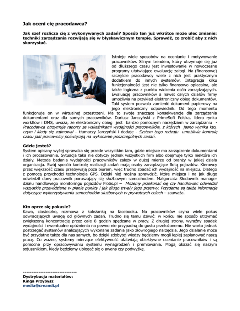 Jak oceni cię pracodawca? Jak szef rozlicza cię z wykonywanych zadań? Sposób ten już wkrótce może ulec zmianie: techniki zarządzania rozwijają się w błyskawicznym tempie. Sprawdź, co zrobić aby z nich skorzystać. Istnieje wiele sposobów na ocenianie i motywowanie pracowników. Silnym trendem, który utrzymuje się już od dłuższego czasu jest inwestowanie w nowoczesne programy ułatwiające ewaluację załogi. Na (finansowe) szczęście pracodawcy wiele z nich jest praktycznym dodatkiem do innych systemów. Integracja kilku funkcjonalności jest nie tylko finansowo opłacalna, ale także logiczna z punktu widzenia osób zarządzających. Ewaluację pracowników a nawet całych działów firmy umożliwia na przykład elektroniczny obieg dokumentów. Taki system pozwala zamienić dokument papierowy na jego elektroniczny odpowiednik. Od tego momentu funkcjonuje on w wirtualnej przestrzeni. Ma to swoje znaczące konsekwencje dla zarządzania dokumentami oraz dla samych pracowników. Dariusz Jarczyński z PrimeSoft Polska, lidera rynku workflow i DMS, uważa, że elektroniczny obieg jest bardzo pomocnym narzędziem w zarządzaniu Pracodawca otrzymuje raporty ze wskaźnikami wydajności pracowników, z których jasno wynika kto, czym i kiedy się zajmował – tłumaczy Jarczyński i dodaje - System tego rodzaju umożliwia kontrolę czasu jaki pracownicy poświęcają na wykonanie poszczególnych zadań. Gdzie jesteś? System opisany wyżej sprawdza się przede wszystkim tam, gdzie miejsce ma zarządzenie dokumentami i ich procesowanie. Sytuacja taka nie dotyczy jednak wszystkich firm albo obejmuje tylko niektóre ich działy. Metoda badania wydajności pracowników zależy w dużej mierze od branży w jakiej działa organizacja. Swój sposób kontrolę realizacji zadań mają osoby zarządzające flotą pojazdów. Kierowcy przez większość czasu przebywają poza biurem, więc trudno zbadać ich wydajność na miejscu. Dlatego z pomocą przychodzi technologia GPS. Dzięki niej można sprawdzić, które miejsca i na jak długo odwiedził dany pracownik poruszający się służbowym samochodem. Małgorzata Słodownik manager działu handlowego monitoringu pojazdów Flotis.pl – Możemy przekonać się czy handlowiec odwiedził wszystkie przewidziane w planie punkty i jak długo trwały jego przerwy. Przydatne są także informacje dotyczące wykorzystywania samochodów służbowych w prywatnych celach – zauważa. Kto oprze się pokusie? Kawa, ciasteczko, rozmowa z koleżanką na facebooku. Na pracowników czyha wiele pokus odwracających uwagę od głównych zadań. Trudno się temu dziwić: w końcu nie sposób utrzymać zwiększoną koncentrację przez całe 8 godzin spędzane w pracy. Z drugiej strony, wyraźny spadek wydajności i ewentualne opóźnienia na pewno nie przypadną do gustu przełożonemu. Nie warto jednak postrzegać systemów analizujących wykonane zadania jako złowrogiego narzędzia. Jego działanie może być przydatne także dla nas samych, bo dzięki zdobytej wiedzy będziemy mogli lepiej zaplanować naszą pracę. Co ważne, systemy mierzące efektywność ułatwiają obiektywne ocenianie pracowników i są pomocne przy opracowywaniu systemu wynagrodzeń i premiowania. Mogą okazać się naszym sojusznikiem, kiedy będziemy ubiegać się o awans czy podwyżkę. ------------------------------Dystrybucja materiałów: Kinga Przybysz [email protected] kom./+48/ 519-181-900