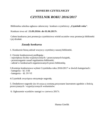 KONKURS CZYTELNICZY CZYTELNIK ROKU 2016/2017 Biblioteka szkolna ogłasza całoroczny konkurs czytelniczy „Czytelnik roku”. Konkurs trwa od 15.09.2016r. do 01.06.2017r. Celem konkursu jest promocja czytelnictwa wśród uczniów oraz promocja biblioteki i jej działań. Zasady konkursu 1. Konkursie biorą udział wszyscy czytelnicy naszej biblioteki. 2. Ocenie konkursowej podlegają : - największa liczba wypożyczonych / przeczytanych książek, - przestrzeganie zasad regulaminu biblioteki, - udział w konkursach organizowanych przez bibliotekę. 3.Komisja konkursowa wyłoni Czytelnika roku 2016/2017 w dwóch kategoriach : - kategoria - kl. I-III - kategoria – kl. IV-VI 4.Czytelnik zwycięzca otrzymuje nagrodę. 5. Dodatkowe nagrody (do III miejsca) zostaną przyznane laureatom zgodnie z ilością przeczytanych / wypożyczonych woluminów. 6. Ogłoszenie wyników nastąpi w czerwcu 2017r. Hanna Gierlik