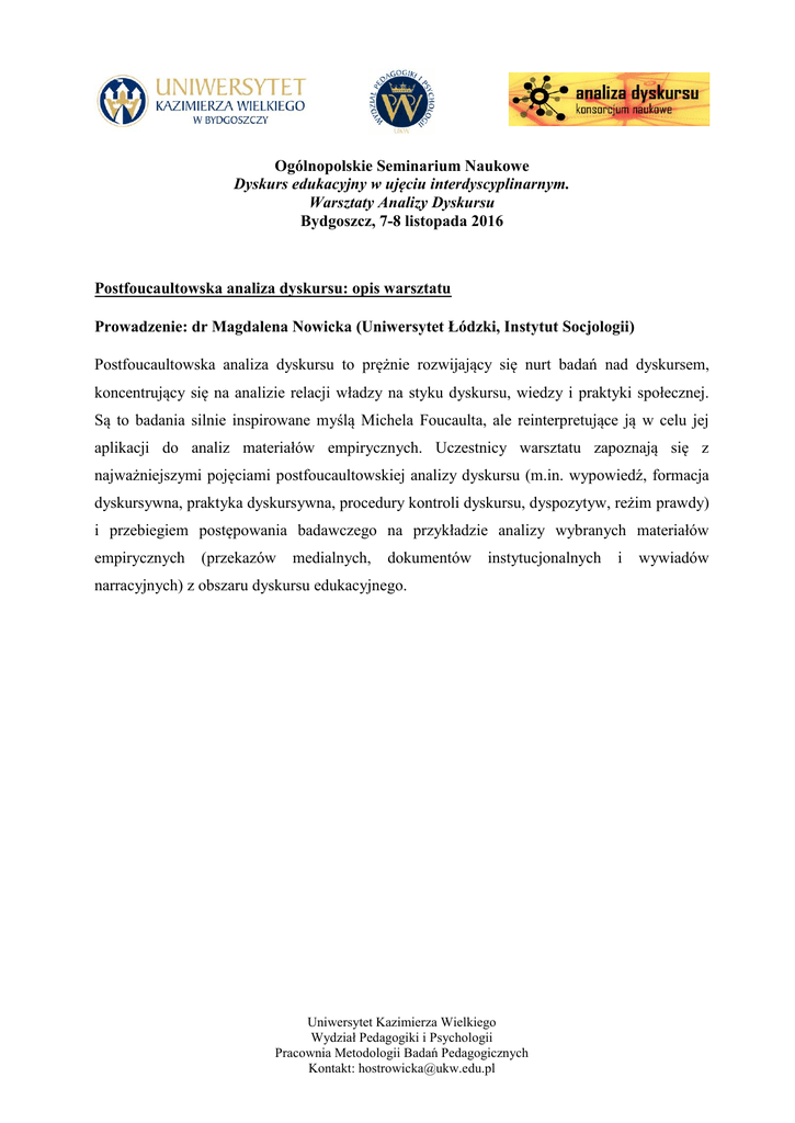 Ogólnopolskie Seminarium Naukowe Dyskurs edukacyjny w ujęciu interdyscyplinarnym. Warsztaty Analizy Dyskursu Bydgoszcz, 7-8 listopada 2016 Postfoucaultowska analiza dyskursu: opis warsztatu Prowadzenie: dr Magdalena Nowicka (Uniwersytet Łódzki, Instytut Socjologii) Postfoucaultowska analiza dyskursu to prężnie rozwijający się nurt badań nad dyskursem, koncentrujący się na analizie relacji władzy na styku dyskursu, wiedzy i praktyki społecznej. Są to badania silnie inspirowane myślą Michela Foucaulta, ale reinterpretujące ją w celu jej aplikacji do analiz materiałów empirycznych. Uczestnicy warsztatu zapoznają się z najważniejszymi pojęciami postfoucaultowskiej analizy dyskursu (m.in. wypowiedź, formacja dyskursywna, praktyka dyskursywna, procedury kontroli dyskursu, dyspozytyw, reżim prawdy) i przebiegiem postępowania badawczego na przykładzie analizy wybranych materiałów empirycznych (przekazów medialnych, dokumentów instytucjonalnych narracyjnych) z obszaru dyskursu edukacyjnego. Uniwersytet Kazimierza Wielkiego Wydział Pedagogiki i Psychologii Pracownia Metodologii Badań Pedagogicznych Kontakt: [email protected] i wywiadów