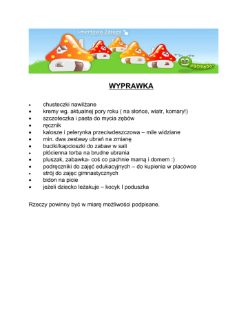 WYPRAWKA chusteczki nawilżane kremy wg. aktualnej pory roku ( na słońce, wiatr, komary!) szczoteczka i pasta do mycia zębów ręcznik kalosze i pelerynka przeciwdeszczowa – mile widziane min. dwa zestawy ubrań na zmianę buciki/kapcioszki do zabaw w sali płócienna torba na brudne ubrania pluszak, zabawka- coś co pachnie mamą i domem :) podręczniki do zajęć edukacyjnych – do kupienia w placówce strój do zajęc gimnastycznych bidon na picie jeżeli dziecko leżakuje – kocyk I poduszka Rzeczy powinny być w miarę możliwości podpisane.