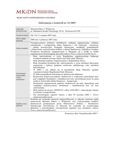 Informacja o kontroli nr 21/2007 Jednostka kontrolowana: Muzeum Pałac w Wilanowie ul. Stanisława Kostki Potockiego 10/16, Warszawa 02-958 Termin kontroli: Od 7 do 31 sierpnia 2007 roku. Okres objęty kontrolą: 2006 rok i I półrocze 2007 roku. Formalno-prawne podstawy działalności, struktura organizacyjna, struktura zatrudnienia i wynagrodzeń, plany finansowe i ich realizacja, inwestycje i zakupy inwestycyjne, Programy Operacyjne, zasadność, gospodarność Zakres kontroli i efektywność wykorzystania środków z dotacji budżetowej, Zakładowy Fundusz Świadczeń Socjalnych, zaangażowanie w ubieganie się o środki ze źródeł zagranicznych, przestrzeganie procedur ustawy Prawo zamówień publicznych. − Brak wprowadzenia w życie Regulaminu organizacyjnego będącego wynikiem nadania nowego statutu oraz brak opinii Ministra. − Brak aktualnej struktury organizacyjnej w Regulaminie Pracy. − Brak Zarządzeń Dyrektora dot. wprowadzenia w życie instrukcji dotyczącej organizacji i zakresu działania archiwum zakładowego oraz instrukcji kancelaryjnej. − W 2006 r. nie odbyło się II posiedzenie Rady Muzeum, zgodnie z postanowieniami Regulaminu Rady Muzeum. Stwierdzone − W kilku przypadkach nieterminowo dokonywano płatności. nieprawidło− Rozliczenia krajowych podróży służbowych w większości sprawdzane były wości i pod względem formalnym i rachunkowym oraz zatwierdzane przez tą samą uchybienia osobę tj. kierownika działu finansowo – księgowego. − Rozliczenia zagranicznych podróży służbowych nie były sprawdzane pod względem merytorycznym, formalnym i rachunkowym lecz od razu zatwierdzane. − Brak aneksu do umowy 100/NE/07 z dnia 10.04.2007 r. dotyczącego zmiany wysokości wynagrodzenia. − Nie przestrzegano zapisów ustawy z dnia 29 stycznia 2004 r. Prawo zamówień publicznych. Kontrola nie wykazała istotnych nieprawidłowości w zakresie realizacji zadań statutowych Muzeum Pałacu w Wilanowie oraz wykorzystania środków finansowych przekazanych przez Ministerstwo Kultury i Dziedzictwa Ogólna ocena kontroli Narodowego. Stwierdzono, że Muzeum nie wykazało się wystarczającą dbałością o przestrzeganie wewnętrznych regulacji oraz przepisów ustawy Prawo zamówień publicznych. Warszawa, dnia 18 października 2007 r.