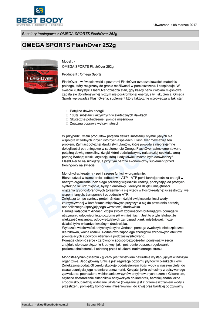 Utworzono : 08 marzec 2017 Boostery treningowe > OMEGA SPORTS FlashOver 252g OMEGA SPORTS FlashOver 252g Model : OMEGA SPORTS FlashOver 252g Producent : Omega Sports FlashOver - w świecie walki z pożarami FlashOver oznacza kawałek materiału palnego, który rozgrzany do granic możliwości w pomieszczeniu i eksploduje. W świecie kulturystyki FlashOver oznacza stan, gdy każdy nerw i włókno mięśniowe zapala się do intensywnej niczym nie poskromionej energii, siły i skupienia. Omega Sports wprowadza FlashOver'a, suplement który faktycznie wprowadza w taki stan. � Potężna dawka energii � 100% substancji aktywnych w skutecznych dawkach � Skuteczne pobudzenie i pompa mięśniowa � Znaczna poprawa wytrzymałości y d W przypadku wielu produktów potężna dawka substancji stymulujących nie współgra w żadnych innych istotnych aspektach. FlashOver rozwiązuje ten problem. Zamiast potężnej dawki stymulantów, które powodują nieprzyjemne dolegliwości potreningowe w suplemencie Omega FlashOver zaimplementowano potężną dawkę norwaliny, dzięki której doświadczymy najbardziej spektakularną pompę i waskularyzację którą kiedykolwiek można było doświadczyć. FlashOver to najsilniejszy, a przy tym bardzo ekonomiczny suplement przed treningowy na świecie. t s e B o B Monohydrat kreatyny - pełni szereg funkcji w organizmie: Bierze udział w transporcie i odbudowie ATP - ATP pełni funkcję nośnika energii w naszym organizmie, bez niego przebieg większości reakcji, poczynając od prostych syntez po skurcz mięśnia, byłby niemożliwy. Kreatyna dzięki umiejętności wiązania grup fosforanowych (przemienia się wtedy w Fosfokreatynę) uczestniczy, we wspomnianych, transporcie i odbudowie ATP. Zwiększa tempo syntezy protein – dzięki zwiększeniu ilości wody zatrzymywanej w komórkach mięśniowych przyczynia się do powstania bardziej anabolicznego (sprzyjającego wzrostowi) środowiska. Hamuje katabolizm – dzięki swoim zdolnościom buforującym pomaga w utrzymaniu odpowiedniego poziomu pH w mięśniach. Jest to o tyle istotne, że większość enzymów, odpowiedzialnych za rozpad tkanki mięśniowej, może działać tylko w bardzo kwaśnym środowisku. Wykazuje właściwości antyoksydacyjne – pomaga zwalczyć, niebezpieczne dla zdrowia, wolne rodniki. Dodatkowo zapobiega szeregowi szkodliwych efektów powstających z powodu utleniania podczaswysiłkowego. Pomaga chronić serce - zarówno w sposób bezpośredni, ponieważ w sercu znajduje się duże stężenie kreatyny, jak i pośrednio poprzez regulowanie poziomu cholesterolu i ochronę przed skutkami nadmiernego stresu. Monostearynian glicerolu - glicerol jest związkiem naturalnie występującym w naszym organizmie. Jego główną funkcją jest regulacja poziomu płynów w tkankach i krwi. Zwiększona podaż Glicerolu skutkuje podniesieniem ilości wody w naszym ciele, do czasu usunięcia jego nadmiaru przez nerki. Korzyści jakie odnosimy z opisywanego zjawiska to: poprawione wchłanianie związków przyjmowanych razem z Glicerolem, szybsze dostarczanie składników odżywczych do komórek, bardziej anaboliczne środowisko, bardziej widoczne użylenie (związane jest z przemieszczaniem wody z przestrzeni, pomiędzy komórkami mięśniowymi, do krwi) oraz bardziej odczuwalny kontakt : - [email protected] Strona 1/{nb} Utworzono : 08 marzec 2017 Boostery treningowe > OMEGA SPORTS FlashOver 252g OMEGA SPORTS FlashOver 252g „efekt pompy” podczas treningów. N-acetyl L-tyrozyna - acetylowana wersja aminokwasu tyrozyn, która jest prekursorem dla adrenaliny, dopaminy i noradrenaliny (niezbędne do prawidłowej pracy układu nerwowego), działa pobudzająco, wzmaga czujność i koncentrację. Reszta acetylowa, po odłączeniu od tyrozyny, może zostać wykorzystana np.: w syntezie acetylocholiny, ważnego neuroprzekaźnika. Beta-alanina - wraz z histydyna wchodzi w skład karnozyny, związku odpowiedzialnego za opóźnianie procesu zmęczenia mięśni podczas intensywnych treningów. Tworzy również dipeptydy odpowiedzialne za „odkwaszanie” szybkokurczliwych włókien mięśniowych, dzięki czemu możliwe jest jeszcze większe wydłużenie czasu treningu i zwiększenie jego intensywności, jak również przyspieszenie procesu regeneracji powysiłkowej oraz zmniejszenie ogólnej bolesności mięśni towarzyszącej wyczerpującym treningom. Beta-alanina zapewnia także prawidłową prace ATP, enzym biorącego udział w procesie uwalniania energii, co w bezpośrednio sposób przekłada się na zwiększoną zdolność naszego ciała do podejmowania wysiłku. y d Wodorochlorek beta-fenyloetyloaminy - wykazują właściwości stymulacyjne, podnoszą poziom dopaminy, zwiększają poziom energii, poprawiają nastrój, redukują zmęczenie fizyczne i psychiczne. Swobodnie przechodzi przez barierę krew-mózg i wywołuje kaskadowe wydzielanie norepinefryny, dopaminy i serotoniny oraz stymuluje ścieżkę mezolimbiczną, wywołując euforię i podniecenie. o B L-Norwalina - zabezpiecza przed rozpadem guanidynę (związek niezbędny do syntezy m.: kreatyny i argininy), pomaga zwiększyć stężenie jonów amonowych (dzięki czemu zmniejsza kwasowość naszego organizmu, hamuje katabolizm oraz przyspiesza anabolizm). t s e B Kofeina bezwodna - najbardziej znany na całym świecie związek o charakterze termogenicznym. Działa pobudzająco, obniża poziom Adenozyny, hamuje rozpad cAMP - tym samym wzmacnia zachodzące w organizmie procesy termogeniczne (wydzielanie energii powstałej podczas spalania tłuszczy w postaci ciepła) i lipolityczne (rozkład tłuszczy na wolne kwasy tłuszczowe). 1,3-Dimethylamylamine to naturalnie występujący w przyrodzie związek o działaniu podobnym do adrenaliny. Dzięki odpowiedniej proporcji składnik ten jest doskonałym dodatkiem do FlashOver zapewniającym ciągłe źródło energii. Geranium wpływa również na szlaki odpowiedzialne za kontrolowanie apetytu I dzia
