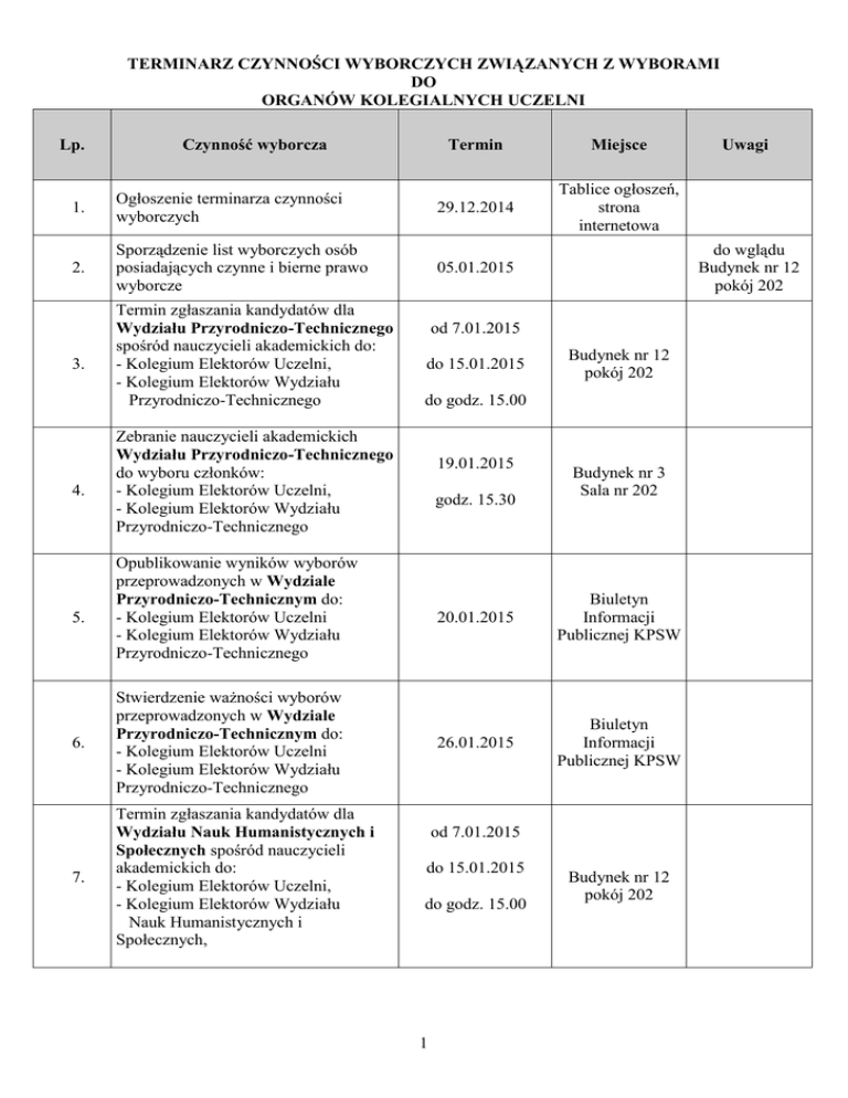 TERMINARZ CZYNNOŚCI WYBORCZYCH ZWIĄZANYCH Z WYBORAMI DO ORGANÓW KOLEGIALNYCH UCZELNI Lp. Czynność wyborcza 1. Ogłoszenie terminarza czynności wyborczych 2. Sporządzenie list wyborczych osób posiadających czynne i bierne prawo wyborcze 3. 4. 5. Termin zgłaszania kandydatów dla Wydziału Przyrodniczo-Technicznego spośród nauczycieli akademickich do: - Kolegium Elektorów Uczelni, - Kolegium Elektorów Wydziału Przyrodniczo-Technicznego 7. Termin zgłaszania kandydatów dla Wydziału Nauk Humanistycznych i Społecznych spośród nauczycieli akademickich do: - Kolegium Elektorów Uczelni, - Kolegium Elektorów Wydziału Nauk Humanistycznych i Społecznych, 29.12.2014 Tablice ogłoszeń, strona internetowa do 15.01.2015 Budynek nr 12 pokój 202 do godz. 15.00 19.01.2015 godz. 15.30 Budynek nr 3 Sala nr 202 20.01.2015 Biuletyn Informacji Publicznej KPSW 26.01.2015 Biuletyn Informacji Publicznej KPSW od 7.01.2015 do 15.01.2015 do godz. 15.00 1 Uwagi do wglądu Budynek nr 12 pokój 202 od 7.01.2015 Opublikowanie wyników wyborów przeprowadzonych w Wydziale Przyrodniczo-Technicznym do: - Kolegium Elektorów Uczelni - Kolegium Elektorów Wydziału Przyrodniczo-Technicznego 6. Miejsce 05.01.2015 Zebranie nauczycieli akademickich Wydziału Przyrodniczo-Technicznego do wyboru członków: - Kolegium Elektorów Uczelni, - Kolegium Elektorów Wydziału Przyrodniczo-Technicznego Stwierdzenie ważności wyborów przeprowadzonych w Wydziale Przyrodniczo-Technicznym do: - Kolegium Elektorów Uczelni - Kolegium Elektorów Wydziału Przyrodniczo-Technicznego Termin Budynek nr 12 pokój 202 Lp. 8. 9. 10. 11. Czynność wyborcza Zebranie nauczycieli akademickich Wydziału Nauk Humanistycznych i Społecznych do wyboru członków: - Kolegium Elektorów Uczelni, - Kolegium Elektorów Wydziału Nauk Humanistycznych i Społecznych Miejsce 19.01.2015 Budynek Rektoratu Sala Senatu godz. 12.00 Opublikowanie wyników wyborów przeprowadzonych w Wydziale Nauk Humanistycznych i Społecznych do: - Kolegium Elektorów Uczelni - Kolegium Elektorów Wydziału Nauk Humanistycznych i Społecznych Stwierdzenie ważności wyborów przeprowadzonych w Wydziale Nauk Humanistycznych i Społecznych do: - Kolegium Elektorów Uczelni - Kolegium Elektorów Wydziału Nauk Humanistycznych i Społecznych Termin zgłaszania kandydatów dla pracowników niebędących nauczycielami akademickimi do: - Kolegium Elektorów Uczelni - Kolegium Elektorów Wydziału Przyrodniczo-Technicznego, Nauk Humanistycznych i Społecznych Termin 20.01.2015 Biuletyn Informacji Publicznej KPSW 26.01.2015 Biuletyn Informacji Publicznej KPSW od 7.01.2015 do 15.01.2015 Budynek nr 12 pokój 202 do godz. 15.00 (dot. pracowników WPT i WNHiS) 12. Zebranie pracowników niebędących nauczycielami akademickimi do wyboru członków: - Kolegium Elektorów Uczelni - Kolegium Elektorów Wydziału Przyrodniczo-Technicznego, Nauk Humanistycznych i Społecznych 19.01.2015 godz. 14.00 Budynek Rektoratu Sala Senatu (dot. pracowników WPT i WNHiS) 13. Opublikowanie wyników wyborów przeprowadzonych na ogólnym zebraniu pracowników niebędących nauczycielami akademickimi do: - Kolegium Elektorów Uczelni - Kolegium Elektorów Wydziału Przyrodniczo-Technicznego, Nauk Humanistycznych i Społecznych (dot. pracowników WPT i WNHiS). 20.01.2015 2 Biuletyn Informacji Publicznej KPSW Uwagi Lp. Czynność wyborcza 14. Stwierdzenie ważności wyborów przeprowadzonych na ogólnym zebraniu pracowników niebędących nauczycielami akademickimi do: - Kolegium Elektorów Uczelni - Kolegium Elektorów Wydziału Przyrodniczo-Technicznego, Nauk Humanistycznych i Społecznych (dot. pracowników WPT i WNHiS). 15. Termin zgłaszania kandydatów dla Wydziału Przyrodniczo-Technicznego spośród nauczycieli akademickich do: - Senatu Uczelni - Rady Wydziału PrzyrodniczoTechnicznego 16. 17. 18. 19. 20. Miejsce 26.01.2015 Biuletyn Informacji Publicznej KPSW od 25.05.2015 do 29.05.2015 Budynek nr 12 pokój 202 do godz. 15.00 Zebranie nauczycieli akademickich Wydziału Przyrodniczo-Technicznego do wyboru członków: - Senatu Uczelni, - Rady Wydziału PrzyrodniczoTechnicznego 08.06.2015 Budynek nr 3 Sala nr 202 godz. 15.30 Opublikowanie wyników wyborów przeprowadzonych w Wydziale Przyrodniczo-Technicznym do: - Senatu Uczelni - Rady Wydziału PrzyrodniczoTechnicznego Stwierdzenie ważności wyborów przeprowadzonych w Wydziale Przyrodniczo-Technicznym do: - Senatu Uczelni, - Rady Wydziału PrzyrodniczoTechnicznego Termin zgłaszania kandydatów dla Wydziału Nauk Humanistycznych i Społecznych spośród nauczycieli akademickich do: - Senatu Uczelni - Rady Wydziału Nauk Humanistycznych i Społecznych Zebranie nauczycieli akademickich Wydziału Nauk Humanistycznych i Społecznych do wyboru członków: - Senatu Uczelni, - Rady Wydziału Humanistycznych i Społecznych Termin 09.06.2015 Biuletyn Informacji Publicznej KPSW 12.06.2015 Biuletyn Informacji Publicznej KPSW od 25.05.2015 do 29.05.2015 Budynek nr 12 pokój 202 do godz. 15.00 08.06.2015 godz. 12.00 3 Budynek Rektoratu Sala Senatu Uwagi Lp. 21. 22. 23. Czynność wyborcza Opublikowanie wyników wyborów przeprowadzonych w Wydziale Nauk Humanistycznych i Społecznych do: - Senatu Uczelni - Rady Wydziału Humanistycznych i Społecznych Stwierdzenie ważności wyborów przeprowadzonych w Wydziale Nauk Humanistycznych i Społecznych do: - Senatu Uczelni, - Rady Wydziału Humanistycznych i Społecznych Termin zgłaszania kandydatów dla pracowników niebędących nauczycielami akademickimi do: - Senatu Uczelni - Rady Wydziału PrzyrodniczoTechnicznego, Nauk Humanistycznych i Społecznych Termin Miejsce 09.06.2015 Biuletyn Informacji Publicznej KPSW 12.06.2015 Biuletyn Informacji Publicznej KPSW od 25.05.2015 do 29.05.2015 Budynek nr 12 pokój 202 do godz. 15.00 (dot. pracowników WPT i WNHiS) 24. Zebranie pracowników niebędących nauczycielami akademickimi do wyboru członków: - Senatu Uczelni - Rady Wydziału PrzyrodniczoTechnicznego