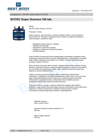 Utworzono : 08 marzec 2017 Energetyczne > SCITEC Super Guarana 100 tab. SCITEC Super Guarana 100 tab. Model : SCITEC Super Guarana 100 tab. Producent : Scitec Scitec Guarana - jest naturalnym, ziołowym źródłem kofeiny i innych związków fitochemicznych. Pomaga w zwiększeniu ilości energii, wzmaga koncentrację, a także pomaga w utrzymaniu diety. � Największa dawka guarany w tabletce � Zwiększa koncentrację � Długotrwale i stopniowo pobudza � Pomaga w redukowaniu tkanki tłuszczowej � Produkt naturalny y d Scitec Nutrition Guarana jest silnie energetyzującym ekstraktem tropikalnej rośliny uprawianej w Brazyli (Paullinia cupana), będącej jednym z najbogatszych w świecie roślin źródłem alkaloidów purynowych m.in. kofeiny. Guarana ogranicza apetyt i pomaga w spalaniu tłuszczu. o B Scitec Guarana stymuluje układ nerwowy, zwiększa zdolność koncentracji, hamuje łaknienie, poprawia kondycję i wydolność ogólną organizmu. Zawarta w niej kofeina jest czynnikiem termogenicznym, dzięki czemu pobudza przemianę materii oraz wpływa na szybsze spalanie kalorii. t s e B Kofeina z guarany znacznie przedłuża efekty metaboliczne katecholamin (adrenaliny, noradrenaliny) hamując fosfodiesterazę, dzięki czemu znacznie nasila efekt redukcji tkanki tłuszczowej w organizmie. Ponadto preparat wspomaga efektywność i wydajność treningu, przeciwdziała fazie katabolicznej oraz przyspiesza regenerację mięśni po wysiłku fizycznym. Połączenie kofeiny i wyciągu z guarany wielokrotnie potęguje siłę działania preparatu, czego efektem jest utrzymujący się przez wiele godzin wzrost aktywności organizmu. Guarana skuteczniej i na dłużej niż kawa podnosi czujność, koncentracje, zdolność logicznego myślenia i zapamiętywania. Składniki aktywne: Ilość w porcji (2 tab.) Guarana (Paullinia Cupana ekstrakt 3-5:1) 900 mg Wapń (węglan wapnia) 500 mg kontakt : - [email protected] Strona 1/{nb} Utworzono : 08 marzec 2017 Energetyczne > SCITEC Super Guarana 100 tab. SCITEC Super Guarana 100 tab. Wielkość porcji: 2 tab. Ilość porcji w opakowaniu: 50 Dawkowanie i sposób użycia: stosować 2 tabletki na około 30 minut przed treningiem lub inną czynnością gdzie zachodzi wzmożona aktywność fizyczna bądź umysłowa. Opis produktu zgodny z najnowszymi przepisami GIS'u. UWAGA - kopiowanie oraz rozpowrzechnianie opisów jest zabronione przez BEST BODY © 2010. Ustawa z dnia 4 lutego 1994 r. o prawie autorskim i prawach pokrewnych (Dz. U. z 2006 r. Nr 90, poz. 631 z późn. zm.). Ochrona autorskich praw osobistych: Twórca, którego autorskie prawa osobiste zostały zagrożone cudzym działaniem, może żądać zaniechania tego działania. W razie dokonanego naruszenia może także żądać, aby osoba, która dopuściła się naruszenia, dopełniła czynności potrzebnych do usunięcia jego skutków, w szczególności, aby złożyła publiczne oświadczenie o odpowiedniej treści i formie. Jeżeli naruszenie było zawinione, sąd może przyznać twórcy odpowiednią sumę pieniężną tytułem zadośćuczynienia za doznaną krzywdę albo - na żądanie twórcy - zobowiązać sprawcę, aby uiścił odpowiednią sumę pieniężną na wskazany przez twórcę cel społeczny. t s e B o B Cena : 29,00 zł Brutto ( 27,10 zł Netto) Dostępność: Produkt dostępny w naszym sklepie od 27 październik 2010 kontakt : - [email protected] Strona 2/{nb} y d