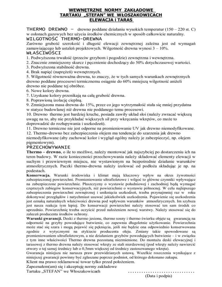 WEWNĘTRZNE NORMY ZAKŁADOWE TARTAKU „STEFAN” WE WŁOSZAKOWICACH ELEWACJA i TARAS THERMO DREWNO – drewno poddane działaniu wysokich temperatur (150 – 220 st. C) w osłonach gazowych bez użycia środków chemicznych w sposób całkowicie naturalny. WILGOTNOŚĆ THERMO-DREWNA Zarówno grubość szerokość i długość elewacji zewnętrznej zależna jest od wymagań zamawiającego lub ustaleń projektowych. Wilgotność drewna wynosi 3 – 10%. WŁAŚCIWOŚCI 1. Podwyższona trwałość (przeciw grzybom i pogodzie) zewnętrzna i wewnętrzna. 2. Znacznie zmniejszony skurcz i pęcznienie dochodzący do 50% dotychczasowej wartości. 3. Podwyższona stabilność drewna. 4. Brak napięć (naprężeń) wewnętrznych. 5. Wilgotność równoważna drewna, to znaczy, że w tych samych warunkach zewnętrznych drewno poddane procesowi termicznemu osiągnie do 60% mniejszą wilgotność aniżeli drewno nie poddane tej obróbce. 6. Nowe kolory drewna. 7. Uzyskane kolory przenikają na całą grubość drewna. 8. Poprawioną izolację cieplną. 9. Zmniejszona masa drewna do 15%, przez co jego wytrzymałość stała się mniej przydatna w statyce budowlanej niż drewna nie poddanego temu procesowi. 10. Drewno thermo jest bardziej kruche, posiada zawiły układ słoi (należy zwracać większą uwagę na to, aby nie przykładać większych sił przy wkręcaniu wkrętów, co może to doprowadzić do rozłupywania i uszkodzeń). 11. Drewno termiczne nie jest odporne na promieniowanie UV jak drewno niemodyfikowane. 12. Thermo-drewno bez zabezpieczenia olejem ma tendencje do szarzenia jak drewno niemodyfikowane (aby zachować kolor i wygląd ogólny należy je zabezpieczyć, np. olejem pigmentowym). PRZECHOWYWANIE Thermo – drewno, o ile to możliwe, należy montować jak najszybciej po dostarczeniu ich na teren budowy. W razie konieczności przechowywania należy składować elementy elewacji w suchym i przewiewnym miejscu, nie wystawionym na bezpośrednie działanie warunków atmosferycznych. Paczki thermo-drewna należy izolować od podłoża składując je np. na podestach. Konserwacja. Warunki środowiska i klimat mają kluczowy wpływ na okres żywotności zabezpieczonej powierzchni. Promieniowanie ultrafioletowe i wilgoć to główne czynniki wpływające na zabezpieczone powierzchnie. Płaszczyzny o wystawie południowej i zachodniej będą wymagać częstszych zabiegów konserwacyjnych, niż powierzchnie o wystawie północnej. W celu najlepszego zabezpieczenia powierzchni zewnętrznej i uniknięcia uszkodzeń, trzeba przynajmniej raz w roku dokonywać przeglądów i natychmiast usuwać jakiekolwiek uszkodzenia. Pojawienie się uszkodzenia jest oznaką naturalnych właściwości drewna pod wpływem warunków atmosferycznych. Im szybsza jest nasza reakcja tym lepiej. Do konserwacji powierzchni należy stosować ten sam środek co uprzednio. Powierzchnię trzeba oczyścić przed nałożeniem nowej warstwy. Należy stosować się do zaleceń producenta środków ochrony. Warunki gwarancji. Deski z thermo jesionu, thermo sosny i thermo świerku objęte są gwarancją na odporność na grzyby powodujące butwienie, co zapewnia długoletnie użytkowanie. Powierzchnia może stać się szara i mogą pojawić się pęknięcia, jeśli nie będzie ona odpowiednio konserwowana zgodnie z wytycznymi na etykiecie producenta oleju. Zmiany takie spowodowane są promieniowaniem ultrafioletowym, a nie działaniem grzybów powodujących butwienie – i w związku z tym inne właściwości Thermo drewna pozostaną niezmienione. Do montażu deski elewacyjnej i tarasowej z thermo drewna należy stosować wkręty ze stali nierdzewnej (pod wkręty należy nawiercić otwory o tej samej średnicy lub o 0,5mm większej od średnicy zastosowanego wkręta). Gwarancja niniejsza nie narusza praw przewidzianych ustawą. Wszelkie roszczenia wynikające z niniejszej gwarancji powinny być zgłaszane poprzez podmiot, od którego dokonano zakupu. Klient ma prawo reklamować towar tylko przed położeniem. Zapoznałem(am) się i akceptuję normy zakładowe Tartaku „STEFAN” we Włoszakowicach .............................. (Data i podpis)