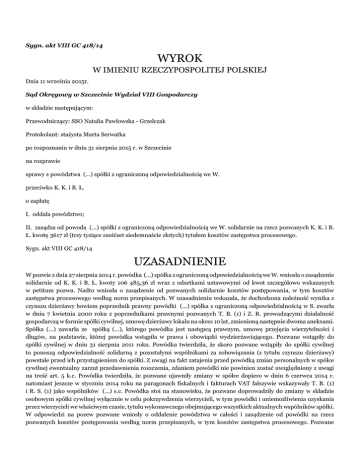 Sygn. akt VIII GC 418/14 WYROK W IMIENIU RZECZYPOSPOLITEJ POLSKIEJ Dnia 11 września 2015r. Sąd Okręgowy w Szczecinie Wydział VIII Gospodarczy w składzie następującym: Przewodniczący: SSO Natalia Pawłowska - Grzelczak Protokolant: stażysta Marta Serwatka po rozpoznaniu w dniu 31 sierpnia 2015 r. w Szczecinie na rozprawie sprawy z powództwa (...) spółki z ograniczoną odpowiedzialnością we W. przeciwko K. K. i B. Ł. o zapłatę I. oddala powództwo; II. zasądza od powoda (...) spółki z ograniczoną odpowiedzialnością we W. solidarnie na rzecz pozwanych K. K. i B. Ł. kwotę 3617 zł (trzy tysiące sześćset siedemnaście złotych) tytułem kosztów zastępstwa procesowego. Sygn. akt VIII GC 418/14 UZASADNIENIE W pozwie z dnia 27 sierpnia 2014 r. powódka (...) spółka z ograniczoną odpowiedzialnością we W. wniosła o zasądzenie solidarnie od K. K. i B. Ł. kwoty 106 485,36 zł wraz z odsetkami ustawowymi od kwot szczegółowo wskazanych w petitum pozwu. Nadto wniosła o zasądzenie od pozwanych solidarnie kosztów postępowania, w tym kosztów zastępstwa procesowego według norm przepisanych. W uzasadnieniu wskazała, że dochodzona należność wynika z czynszu dzierżawy bowiem poprzednik prawny powódki (...) spółka z ograniczoną odpowiedzialnością w S. zwarła w dniu 7 kwietnia 2000 roku z poprzednikami prawnymi pozwanych T. B. (1) i Z. R. prowadzącymi działalność gospodarczą w formie spółki cywilnej, umowę dzierżawy lokalu na okres 10 lat, zmienioną następnie dwoma aneksami. Spółka (...) zawarła ze spółką (...), którego powódka jest następcą prawnym, umowę przejęcia wierzytelności i długów, na podstawie, której powódka wstąpiła w prawa i obowiązki wydzierżawiającego. Pozwane wstąpiły do spółki cywilnej w dniu 31 sierpnia 2011 roku. Powódka twierdziła, że skoro pozwane wstąpiły do spółki cywilnej to ponoszą odpowiedzialność solidarną z pozostałymi wspólnikami za zobowiązania (z tytułu czynszu dzierżawy) powstałe przed ich przystąpieniem do spółki. Z uwagi na fakt zatajenia przed powódką zmian personalnych w spółce cywilnej ewentualny zarzut przedawnienia roszczenia, zdaniem powódki nie powinien zostać uwzględniony z uwagi na treść art. 5 k.c. Powódka twierdziła, że pozwane ujawniły zmiany w spółce dopiero w dniu 6 czerwca 2014 r. natomiast jeszcze w styczniu 2014 roku na paragonach fiskalnych i fakturach VAT fałszywie wskazywały T. B. (1) i R. S. (1) jako wspólników (...) s.c. Powódka stoi na stanowisku, że pozwane doprowadziły do zmiany w składzie osobowym spółki cywilnej wyłącznie w celu pokrzywdzenia wierzycieli, w tym powódki i uniemożliwienia uzyskania przez wierzycieli we właściwym czasie, tytułu wykonawczego obejmującego wszystkich aktualnych wspólników spółki. W odpowiedzi na pozew pozwane wniosły o oddalenie powództwa w całości i zasądzenie od powódki na rzecz pozwanych kosztów postępowania według norm przepisanych, w tym kosztów zastępstwa procesowego. Pozwane nie kwestionowały faktu przystąpienia do spółki, ani też swojej odpowiedzialności za zobowiązania spółki powstałe przed przystąpieniem, jednak z uwagi na datę powstania dochodzonych w niniejszej sprawie należności podniosły zarzut przedawnienia. Wskazały, że zgodnie z treścią umowy najmu nazwanej przez powódkę dzierżawą, wynika iż obowiązywała ona najpóźniej do 12 maja 2010 r. i tylko w tym okresie pozwane mogłyby być zobowiązane do zapłaty. Natomiast przedłożone przez powódkę faktury VAT dotyczą należności czynszowych za okres po 24 maja 2010 r., zatem biorąc pod uwagę trzyletni termin przedawnienia to roszczenie powódki uległo przedawnieniu w 2013 r. Jednocześnie pozwane zaprzeczyły by zataiły fakt przystąpienia do spółki cywilnej skoro już w we wrześniu 2011 r. podjęły wszelkie niezbędne działania mające na celu ujawnienie zmian personalnych w spółce składając stosowne wnioski do organów podatkowych jak i w (...). Sąd ustalił następujący stan faktyczny: W dniu 7 kwietnia 2000 r. (...) spółka z ograniczoną odpowiedzialnością w S. zawarła z T. B. (1) i Z. R., prowadzącymi działalność gospodarczą w formie spółki cywilnej pod nazwą Restauracja (...) s.c. umowę nazwaną umową dzierżawy wraz z oddaniem do użytkowania lokalu nr (...) położonego w S. przy ul. (...). B. X 9. W § 2 ust. 1 umowy strony ustaliły, że częścią procedury przekazania lokalu będzie pomiar z natury lokalu po zakończeniu prac konstrukcyjnych, a wyliczona w ten sposób faktyczna powierzchnia skorygowana będzie ustaleń aneksu nr (...) i będzie podstawą do obliczenia czynszu zgodnie z § 6. Przedmiot dzierżawy miał zostać wydany do użytkowania dzierżawcy do dnia 12 maja 2000 r., w oparciu o protokół zdawczo-odbiorczy, który miał stać się elementem umowy (§ 3 ust. 1). Wydzierżawiający zobowiązał się w tym samym terminie, jaki został wyszczególniony w ust. 1 umożliwić dzierżawcy użytkowanie części wspólnych budynku, o ile nie nastąpią inne pisemne uzgodnienia w tej sprawie pomiędzy wydzierżawiającym a dzierżawcą (§ 3 ust. 2). Zgodnie z § 5 umowa miała wejść w życie z dniem jej podpisania i miała obowiązywać przez 10 lat, licząc od daty podpisania protokołu zdawczo-odbiorczego i wydania przedmiotu dzierżawy. Dzierżawca miał płacić wydzierżawiającemu miesięczny czynsz podstawowy w wysokości równowartości 15 DEM w złotych polskich za każdy metr kwadratowy powierzchni lokalu (…) liczony według kursu średniego NBP w dniu wystawienia faktury. Do czynszu miał być doliczany podatek VAT w obowiązującej wysokości. Dowód: umowa z dnia 7 kwietnia 2000 r. (k. 18 – 27), załączniki do umowy (k. k. 28 – 30, 270 - 271). (...) spółki cywilnej prowadzili prace związane z adaptacją lokalu. W dniu 5 maja 2000 r. zawarli umowę o roboty budowlane w pomieszczeniach dzierżaw