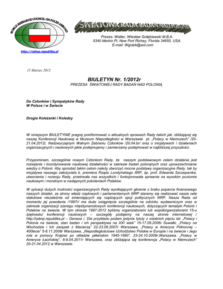 Prezes: Walter, Wiesław Gołębiewski M.B.A. 5340 Merkin Pl, New Port Richey, Florida 34655, USA. E-mail: [email protected] http://rpbnp.republika.pl 15 Marzec 2012 BIULETYN Nr. 1/2012r PREZESA ŚWIATOWEJ RADY BADAŃ NAD POLONIĄ Do Członków i Sympatyków Rady W Polsce i w Świecie Drogie Koleżanki i Koledzy W niniejszym BIULETYNIE pragnę poinformować o aktualnych sprawach Rady takich jak: zbliżającej się naszej Konferencji Naukowej w Muzeum Niepodległości w Warszawie pt. „Polacy w Niemczech” /2021.04.2012/, Nadzwyczajnym Walnym Zebraniu Członków /20.04.br/ oraz o inicjatywach i działaniach organizacyjnych i naukowych jakie podejmujemy i zamierzamy podejmować w najbliższej przyszłości. Przypominam, szczególnie nowym Członkom Rady, że naszym podstawowym celem działania jest rozwijanie i koordynowanie naukowej działalności w zakresie badań polonijnych oraz upowszechnianie wiedzy o Polonii. Aby sprostać takim celom należy stworzyć mocne podstawy organizacyjne Rady, tak by inicjatywa naszego założyciela b. premiera Rządu Londyńskiego IIRP, śp. prof. Edwarda Szczepanika, utworzenia i rozwoju Rady, przetrwała nas wszystkich i funkcjonowała sprawnie na wysokim poziomie naukowym i moralnym w następnych pokoleniach Polaków. W sytuacji dużych trudności organizacyjnych Rady wynikających głownie z braku poparcia finansowego naszych działań, ze strony władz rządowych i parlamentarnych IIIRP staramy się realizować nasze cele statutowe niezależnie od zmieniających się rządzących opcji politycznych IIIRP. Nasza Rada od momentu jej powołania /1997r/ ma duże osiągnięcia szczególnie na odcinku wydawniczym oraz w zakresie organizacji szeregu międzynarodowych konferencji naukowych, dotyczących tematyki Polonii i Polaków na świecie. W tym okresie 1997-2012 byliśmy organizatorami lub współorganizatorami 15-u /piętnastu/ konferencji naukowych – szczegóły podajemy na naszej stronie internetowej / http://rpbnp.republika.pl – Geneza /. Dla przykładu podam jedynie tytuly z ostatnich pięciu lat: „Polacy i Polonia na świecie, stan badan i ich perspektywa na XXI wiek” 15-17.09.2006r Suwałki, „Polacy na Wschodzie i Ich związek z Macierzą” 22-23.06.2007r Warszawa, „Polacy w Ameryce Północnej – 400lecie” 5-6.11.2008r Warszawa, „Niepodległościowe Uchodźstwo Polskie w Europie i na świecie i Jego rola w pomocy Krajowi po układzie jałtańskim 1945-1990”, 23-24.10.2009r,Warszawa, „Polacy w Ameryce Łacińskiej”, 8-9.04.2011r Warszawa, oraz zbliżająca się konferencja „Polacy w Niemczech” 20-21.04.2012 w Warszawie. Na konferencjach Rady wygłasza się średnio 20-30 referaty w sekcjach problemowych, po czym następują panelowe otwarte dyskusje. W konferencjach biorą udział przedstawiciele z kilkunastu krajów a wygłaszane referaty staramy się publikować w wydawnictwach książkowych /jak są na to fundusze/, a od niedawna rozpoczęliśmy publikacje na naszej stronie internetowej: rpbnp.republika.pl w dziale – Nasze publikacje pokonferencyjne, E-book. W tym miejscu składam podziękowanie Panu dr. Adamowi Baran – redaktorowi i operatorowi naszej strony internetowej za Jego wielki wysilek i ogromny wkład pracy związany z jej utrzymaniem i uaktualnianiem. Konferencja naukowa „ Polacy w Niemczech” w Muzeum Niepodległości 20-21.04.2012r w Warszawie. Serdeczne dziękuje Ks.prof. Waldemarowi Glińskiemu Wiceprezesowi Rady i jednocześnie Przewodniczącemu Komitetu Organizacyjnego Konferencji, oraz wszystkim Członkom tego Komitetu – a mianowicie: mgr. Dorocie Arciszewskiej-Mielewczyk, mec. Piotrowi Łukaszowi Andrzejewskiemu, dr.Grzerzowi Wodzińskiemu, ks.prof dr hab.Januszowi Balickiemu, prof.zw.dr hab. Marianowi M.Drozdowskiemu, prof. zw. dr hab. Wiesławowi Janowi Wysockiemu, ks. dr hab. Dominikowi Zamiatale, mgr Ewie Wysga, dr. Józefinie Aleksik, dr Zbigniewowi Tomaszowi Klimaszewskiemu, mgr Zbigniewowi Wiktorowi Krakowiakowi, za ogrom prac włożony w przygotowanie tej konferencji. Cieszę się również z nawiązania ściślej współpracy z Muzeum Niepodległości w Warszawie, gdzie odbywać się będzie nasza konferencja. Szczegółowy program konferencji w załączeniu /zał. 1/ Organizatorami tegorocznej konferencji p.n. „Polacy w Niemczech” są: Światowa Rada Badań nad Polonią, Uniwersytet Kardynała Stefana Wyszyńskiego, Muzeum Niepodległości a konferencja odbywa się pod patronatem honorowym Jego Magnificencji Księdza Profesora Doktora Habilitowanego Henryka Skorowskiego – Rektora UKSW. Moderatorami Konferencji są: Pani mgr Dorota Arciszewska-Mielewczyk, poseł Sejmu RP VII kadencji oraz Pan senator, mec. Piotr Łukasz Andrzejewski. Nadzwyczajne Walne Zebranie Członków SRBnP Nadzwyczajne Walne Zgromadzenie Członków SRBnP zaplanowane jest na godz. 20:30, 20 kwietnia 2012 r. w Sali Muzeum Niepodległości w Warszawie. Bardzo serdecznie zapraszamy wszystkich naszych Członków do udziału w tym Zebraniu ponieważ porządek obrad /zał. nr.2/ przewiduje szereg ważnych decyzji, które będą podejmowane na tym Zebraniu m.in.: założenia programowe Rady na rok następny, wybory członków Zarządu Rady którym upływa w 2012r pięcioletnia kadencja. Zgodnie z & 19 Statutu Rady – kadencja Członków Zarządu i Członków Komisji Rewizyjnej trwa 5 lat, a ich wybór odbywa się w głosowaniu tajnym bezwzględną większością głosów. Kadencja każdego Członka Władz Rady, w tym Prezesa może być powtórzona, jednak aby to nastąpiło musi On/Ona przejść ponownie normalny proces wyborczy na Walnym Zgromadzeniu Członków Rady. Mam nadzieje, ze w czasie zbliżającego się Walnego Zebrania Członków będzie okazja na przedyskutowanie najważniejszych problemów Rady a szczególnie spraw najbliższej przyszłości. Zawsze podkreślam, ze w Towarzystwie Naukowym sukcesy mierzy się aktywnością i osiągnięciami poszczególnych Członków, dlatego serdecznie proszę 