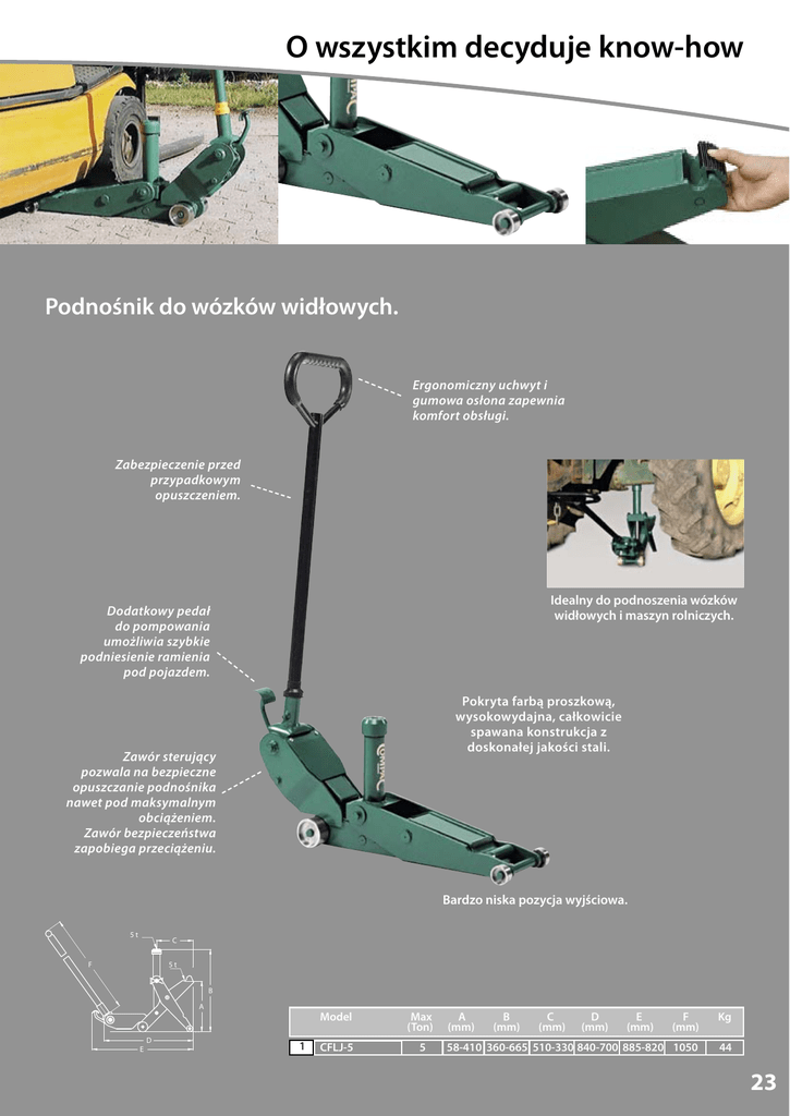 O wszystkim decyduje know-how Podnośnik do wózków widłowych. Ergonomiczny uchwyt i gumowa osłona zapewnia komfort obsługi. Zabezpieczenie przed przypadkowym opuszczeniem. Idealny do podnoszenia wózków widłowych i maszyn rolniczych. Dodatkowy pedał do pompowania umożliwia szybkie podniesienie ramienia pod pojazdem. Pokryta farbą proszkową, wysokowydajna, całkowicie spawana konstrukcja z doskonałej jakości stali. Zawór sterujący pozwala na bezpieczne opuszczanie podnośnika nawet pod maksymalnym obciążeniem. Zawór bezpieczeństwa zapobiega przeciążeniu. Bardzo niska pozycja wyjściowa. 5t C 5t F B A E D 1 Model Max (Ton) CFLJ-5 5 A (mm) B (mm) C (mm) D (mm) E (mm) F (mm) Kg 58-410 360-665 510-330 840-700 885-820 1050 44 23