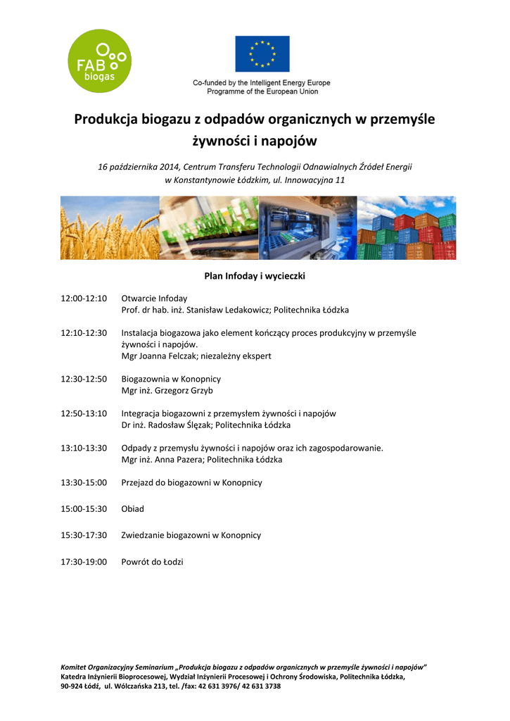Produkcja biogazu z odpadów organicznych w przemyśle żywności i napojów 16 października 2014, Centrum Transferu Technologii Odnawialnych Źródeł Energii w Konstantynowie Łódzkim, ul. Innowacyjna 11 Plan Infoday i wycieczki 12:00-12:10 Otwarcie Infoday Prof. dr hab. inż. Stanisław Ledakowicz; Politechnika Łódzka 12:10-12:30 Instalacja biogazowa jako element kończący proces produkcyjny w przemyśle żywności i napojów. Mgr Joanna Felczak; niezależny ekspert 12:30-12:50 Biogazownia w Konopnicy Mgr inż. Grzegorz Grzyb 12:50-13:10 Integracja biogazowni z przemysłem żywności i napojów Dr inż. Radosław Ślęzak; Politechnika Łódzka 13:10-13:30 Odpady z przemysłu żywności i napojów oraz ich zagospodarowanie. Mgr inż. Anna Pazera; Politechnika Łódzka 13:30-15:00 Przejazd do biogazowni w Konopnicy 15:00-15:30 Obiad 15:30-17:30 Zwiedzanie biogazowni w Konopnicy 17:30-19:00 Powrót do Łodzi Komitet Organizacyjny Seminarium „Produkcja biogazu z odpadów organicznych w przemyśle żywności i napojów” Katedra Inżynierii Bioprocesowej, Wydział Inżynierii Procesowej i Ochrony Środowiska, Politechnika Łódzka, 90-924 Łódź, ul. Wólczańska 213, tel. /fax: 42 631 3976/ 42 631 3738
