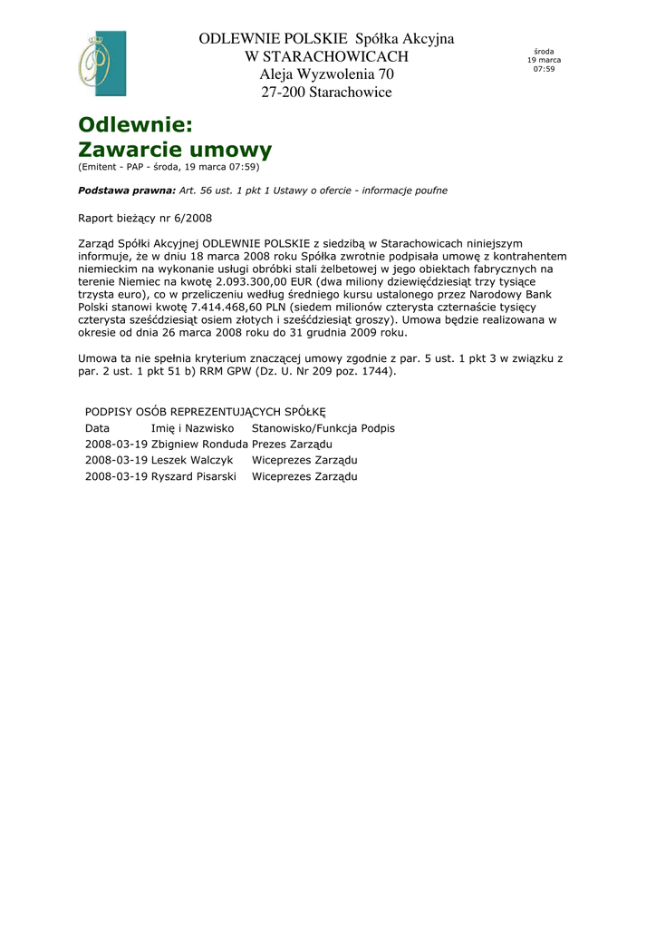 ODLEWNIE POLSKIE Spółka Akcyjna W STARACHOWICACH Aleja Wyzwolenia 70 27-200 Starachowice ! " # $ % & '( ) ) * *+,- ./0 +-&10 %2 % 3 & 43 4 * 2% 5 6* 3 6 # " # )6& '( ) %3 2 ( 6 37%) 4 ) 3 ) 62( 68 ' ) 2 9 9 3 *3 *8 ) 45 % 4 / )3 7": ;: ; < 3 9 % 3 7= % 2 % 2 %2 6 3 % 9 % 63 ( 68 8 )6 2662 9 8 % %/ 3 > ) 9 2) 2 3 )3 7 : ? ?: ?# -/ 2 9 '3 % 2 % 27 % 2 2% = % 2 2 %( 4 2% = % 2 8 2% :< 3 7 % 9% 3 3 ) 2 " " # )6 ; 86 " )6: < 3 :"62: 2 ( ) ) +, 0 &B+&C> , 6 % % *6 3 %8 % @ A . ,%:<:/ " %: ?? : $ /D<E FGBGH & CI1J 0 7 / %3 2) " # ; $ 8 " # ; - 2% ). 9% ) " # ; 2% 3 & 6 2 2) 3 2) ! K6 ) * % 2$ % 6 . % 2$ % 6 . % 2$ % 6 2 : 62: ) ; 3 %3 %)6%