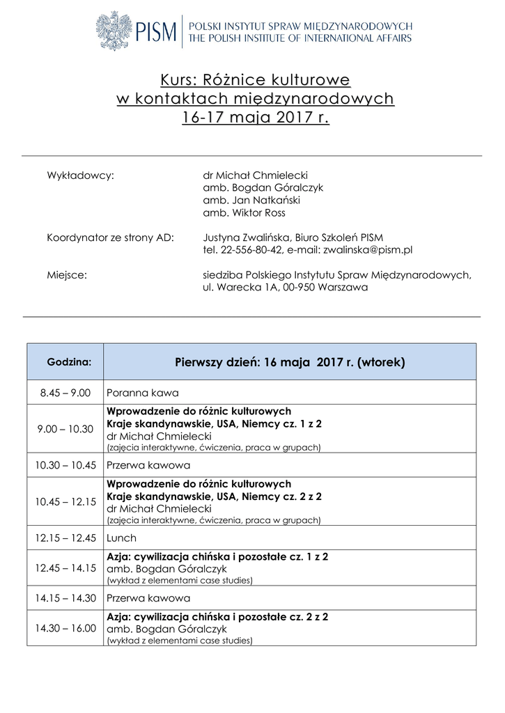 K ur s : Róż ni ce k ul tur o we w k o n tak ta c h m i ęd zy na r odo wy c h 16-17 maja 2017 r. Wykładowcy: dr Michał Chmielecki amb. Bogdan Góralczyk amb. Jan Natkański amb. Wiktor Ross Koordynator ze strony AD: Justyna Zwalińska, Biuro Szkoleń PISM tel. 22-556-80-42, e-mail: [email protected] Miejsce: siedziba Polskiego Instytutu Spraw Międzynarodowych, ul. Warecka 1A, 00-950 Warszawa __________________________________________________________________________________________ Pierwszy dzień: 16 maja 2017 r. (wtorek) Godzina: 8.45 – 9.00 9.00 – 10.30 Poranna kawa Wprowadzenie do różnic kulturowych Kraje skandynawskie, USA, Niemcy cz. 1 z 2 dr Michał Chmielecki (zajęcia interaktywne, ćwiczenia, praca w grupach) 10.30 – 10.45 10.45 – 12.15 Przerwa kawowa Wprowadzenie do różnic kulturowych Kraje skandynawskie, USA, Niemcy cz. 2 z 2 dr Michał Chmielecki (zajęcia interaktywne, ćwiczenia, praca w grupach) 12.15 – 12.45 Lunch 12.45 – 14.15 Azja: cywilizacja chińska i pozostałe cz. 1 z 2 amb. Bogdan Góralczyk (wykład z elementami case studies) 14.15 – 14.30 Przerwa kawowa 14.30 – 16.00 Azja: cywilizacja chińska i pozostałe cz. 2 z 2 amb. Bogdan Góralczyk (wykład z elementami case studies) Drugi dzień: 17 maja 2017 r. (środa) Godzina: 8.45 – 9.00 Poranna kawa 9.00 – 10.30 Rosja i obszar postsowiecki cz. 1 z 2 amb. Wiktor Ross (wykład z elementami case studies) 10.30 – 10.45 Przerwa kawowa 10.45 – 12.15 Rosja i obszar postsowiecki cz. 2 z 2 amb. Wiktor Ross (wykład z elementami case studies) 12.15 – 12.45 Lunch 12.45 – 14.15 Bliski Wschód cz. 1 z 2 amb. Jan Natkański (wykład z elementami case studies) 14.15 – 14.30 Przerwa kawowa 14.30 – 16.00 Bliski Wschód cz. 2 z 2 amb. Jan Natkański (wykład z elementami case studies)