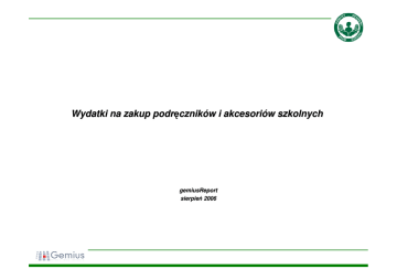 Wydatki na zakup podręczników i akcesoriów szkolnych gemiusReport sierpień sierpień 2006 Cel i metodologia • Badanie zostało zrealizowane za pomocą ankiet internetowych emitowanych na witrynach korzystających z bezpłatnego audytu site–centric stat.pl/PBI. • Ankiety emitowane były losowo w okresie od 10 do 24 sierpnia 2006 roku. Analizą objęto 985 internautów, rodziców dzieci w wieku do 12 lat, którzy wypełnili ankietę do końca. Na pytania dotyczące kupowania pomocy szkolnych oraz ponoszonych lub planowanych w związku z tym wydatków odpowiadali jedynie rodzice dzieci w wieku od 7 do 12 lat. • Celem badania było: - ocenienie, jaki odsetek rodziców posiadających dziecko (dzieci) w wieku 7-12 lat dokonał już zakupu podręczników i akcesoriów szkolnych; - oszacowanie skali wydatków poniesionych przez rodziców na zakup podręczników i akcesoriów szkolnych dla dziecka (dzieci) w wieku 7-12 lat; - oszacowanie planowanych wydatków związanych z zakupem podręczników i akcesoriów szkolnych dla dziecka (dzieci) w wieku 7-12 lat; - określenie średniej kwoty przeznaczonej na zakup podręczników i akcesoriów szkolnych oraz średniej kwoty planowanej na w/w cele; - poznanie ogólnej opinii rodziców odnośnie wielkości wydatków ponoszonych przez rodziny w Polsce na zakup podręczników i akcesoriów szkolnych. 2 Prezentacja wyników 3 • Ponad połowa rodziców (59%) kupiła już podręczniki i akcesoria szkolne dla swoich dzieci. 27% rodziców kupiło już wszystko co potrzeba, zaś kolejne 32% kupiło część potrzebnych rzeczy. • Co trzeci rodzic (33%), który na ten cel od 201 do 300 zł, 500 zł. 35% badanych, którzy do szkoły, łącznie na zakup do 100 zł. • Zdecydowana większość ankietowanych (95%) jest zdania, że w Polsce są rodziny, których nie stać na zakup pomocy szkolnych dla swoich dzieci. 36% respondentów twierdzi, że w naszym kraju jest od 21% do 40% takich rodzin, kolejne 29% uważa, że takich rodzin jest jeszcze więcej – od 41% do 60%. kupił swoim dzieciom już wszystko do szkoły, wydał co czwarty natomiast przeznaczył na zakupy powyżej nie kupili nic lub kupili tylko część rzeczy potrzebnych podręczników i akcesoriów szkolnych planuje wydać 4 Czy dokonał(a) Pan(i) zakupu podręczników i akcesoriów szkolnych dla dzieci na rok szkolny 2006/2007? Podstawą Podstawą oprocentowania są są badani posiadają posiadający dzieci w wieku szkolnym. 5 Źródło: gemiusReport, sierpień sierpień 2006 Czy dokonał(a) Pan(i) zakupu podręczników i akcesoriów szkolnych dla dzieci na rok szkolny 2006/2007? - podział według płci - Podstawą Podstawą oprocentowania są są badani posiadają posiadający dzieci w wieku szkolnym. 6 Źródło: gemiusReport, sierpień sierpień 2006 Czy dokonał(a) Pan(i) zakupu podręczników i akcesoriów szkolnych dla dzieci na rok szkolny 2006/2007? - podział według wykształcenia - 45% Nie 38% 32% Tak – kupiłem(am) już część potrzebnych rzeczy 32% 23% Tak – kupiłem(am) już wszystko co potrzeba 31% 0% 5% 10% Pozostałe / N = 249 15% 20% 25% 30% 35% 40% 45% 50% Wyższe magisterskie / licencjackie / inżynierskie / N = 237 Podstawą Podstawą oprocentowania są są badani posiadają posiadający dzieci w wieku szkolnym. 7 Źródło: gemiusReport, sierpień sierpień 2006 Czy dokonał(a) Pan(i) zakupu podręczników i akcesoriów szkolnych dla dzieci na rok szkolny 2006/2007? - podział według liczby dzieci w wieku do 12 lat - 35% Nie 34% 47% 17% Tak – kupiłem(am) już część potrzebnych rzeczy 40% 28% 28% 48% Tak – kupiłem(am) już wszystko co potrzeba 27% 25% 0% jedno dziecko / N = 256 10% 20% dwoje dzieci / N = 179 30% troje dzieci / N = 23 40% 50% 60% czworo dzieci i więcej / N = 18 Podstawą Podstawą oprocentowania są są badani posiadają posiadający dzieci w wieku szkolnym. 8 Źródło: gemiusReport, sierpień sierpień 2006 Czy dokonał(a) Pan(i) zakupu podręczników i akcesoriów szkolnych dla dzieci na rok szkolny 2006/2007? - podział według miesięcznego dochodu netto całego gospodarstwa domowego 44% 44% 50% 35% Nie 34% 40% 28% 27% 27% Tak – kupiłem(am) już część potrzebnych rzeczy 33% 41% 32% 29% 29% 21% Tak – kupiłem(am) już wszystko co potrzeba 32% 25% 28% 38% 0% poniżej 1000 zł / N=32 2501zł – 3000 zł / N=58 10% 20% 30% 1000 zł – 1500 zł / N=47 3001 zł – 4000 zł / N=66 1501 zł – 2000 zł / N=59 4001 zł i więcej / N=90 40% 50% 60% 2001 zł – 2500 zł / N=63 Podstawą Podstawą oprocentowania są są badani posiadają posiadający dzieci w wieku szkolnym. 9 Źródło: gemiusReport, sierpień sierpień 2006 Ile wydał(a) Pan(i) na zakup podręczników i akcesoriów szkolnych? Podstawą Podstawą oprocentowania są są badani, któ którzy zadeklarowali, że kupili już już wszystko do szkoł szkoły. 10 Źródło: gemiusReport, sierpień sierpień 2006 Ile wydał(a) Pan(i) na zakup podręczników i akcesoriów szkolnych? - podział według płci 5% do 100 zł 5% 13% od 100 zł do 200 zł 12% 33% od 201 zł do 300 zł 33% 5% od 301 zł do 400 zł 14% 10% od 401 zł do 500 zł 14% 35% powyżej 500 zł 21% 0% 5% 10% 15% 20% Kobiety / N = 91 25% 30% 35% 40% Mężczyźni / N = 40 Podstawą Podstawą oprocentowania są są badani, któ którzy zadeklarowali, że kupili już już wszystko do szkoł szkoły. 11 Źródło: gemiusReport, sierpień sierpień 2006 Ile wydał(a) Pan(i) na zakup podręczników i akcesoriów szkolnych? - podział według liczby dzieci w wieku do 12 lat - do 100 zł 6% 3% 9% od 100 zł do 200 zł 17% 11% 36% od 201 zł do 300 zł 27% 39% 9% od 301 zł do 400 zł 13% 13% 9% od 401 zł do 500 zł 15% 14% 100% 36% powyżej 500 zł 23% 20% 0% jedno dziecko / N = 64 20% 40% dwoje dzieci / N = 48 60% troje dzieci / N = 11 80% 100% 120% czworo dzieci i więcej / N = 5 Podstawą Podstawą oprocentowania są są badani, któ którzy zadeklarowali, że kupili już już wszystko do szkoł szkoły. 