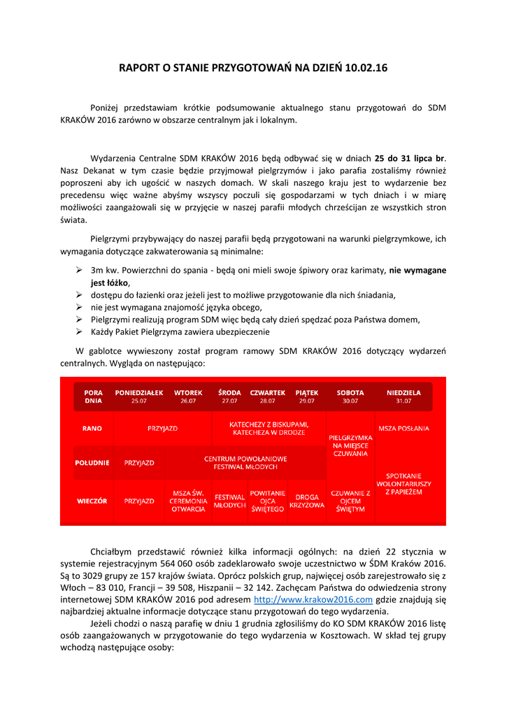 RAPORT O STANIE PRZYGOTOWAŃ NA DZIEŃ 10.02.16 Poniżej przedstawiam krótkie podsumowanie aktualnego stanu przygotowao do SDM KRAKÓW 2016 zarówno w obszarze centralnym jak i lokalnym. Wydarzenia Centralne SDM KRAKÓW 2016 będą odbywad się w dniach 25 do 31 lipca br. Nasz Dekanat w tym czasie będzie przyjmował pielgrzymów i jako parafia zostaliśmy również poproszeni aby ich ugościd w naszych domach. W skali naszego kraju jest to wydarzenie bez precedensu więc ważne abyśmy wszyscy poczuli się gospodarzami w tych dniach i w miarę możliwości zaangażowali się w przyjęcie w naszej parafii młodych chrześcijan ze wszystkich stron świata. Pielgrzymi przybywający do naszej parafii będą przygotowani na warunki pielgrzymkowe, ich wymagania dotyczące zakwaterowania są minimalne: 3m kw. Powierzchni do spania - będą oni mieli swoje śpiwory oraz karimaty, nie wymagane jest łóżko, dostępu do łazienki oraz jeżeli jest to możliwe przygotowanie dla nich śniadania, nie jest wymagana znajomośd języka obcego, Pielgrzymi realizują program SDM więc będą cały dzieo spędzad poza Paostwa domem, Każdy Pakiet Pielgrzyma zawiera ubezpieczenie W gablotce wywieszony został program ramowy SDM KRAKÓW 2016 dotyczący wydarzeo centralnych. Wygląda on następująco: Chciałbym przedstawid również kilka informacji ogólnych: na dzieo 22 stycznia w systemie rejestracyjnym 564 060 osób zadeklarowało swoje uczestnictwo w ŚDM Kraków 2016. Są to 3029 grupy ze 157 krajów świata. Oprócz polskich grup, najwięcej osób zarejestrowało się z Włoch – 83 010, Francji – 39 508, Hiszpanii – 32 142. Zachęcam Paostwa do odwiedzenia strony internetowej SDM KRAKÓW 2016 pod adresem http://www.krakow2016.com gdzie znajdują się najbardziej aktualne informacje dotyczące stanu przygotowao do tego wydarzenia. Jeżeli chodzi o naszą parafię w dniu 1 grudnia zgłosiliśmy do KO SDM KRAKÓW 2016 listę osób zaangażowanych w przygotowanie do tego wydarzenia w Kosztowach. W skład tej grupy wchodzą następujące osoby: Funkcja Imię i Nazwisko 1. PRZEWODNICZĄCY JACEK BROM 2. KAPŁAN Ks. JAN SOŁTYSIK 3. ODPOWIEDZIALNA ZA MIEJSCA KATECHEZ PLUS KONTAKT ZE SZKOŁAMI EWA ZAZULA 4. SZEF WYŻYWIENIA HALINA DREINERT 5. LIDER ANIMACJI DUSZPASTERSKIEJ ALEKSANDRA GĄSIORCZYK 6. SZEF TRANSPORTU I MIEJSC PARKINGOWYCH CZESŁAW JOCHEMCZYK 7. SZEF ZAKWATEROWANIA JACEK PYTEL 8. SZEF BEZPIECZEŃSTWA I ZABEZPIECZENIA MEDYCZNEGO PAWEŁ GĄSIORCZYK 9. KONTAKT Z KLUBEM SPORTOWYM GRZEGORZ PIECHOTA 10. SEKCJA WYŻYWIENIA PLUS PAKIETY PIELGRZYMA ANNA SUŚLIK 11. OSOBA ODPOWIEDZIALNA ZA GIMNAZJUM AGNIESZKA STANOSZEK 12. OSOBA ODPOWIEDZIALNA ZA SZKOŁĘ PODSTAWOWĄ ANNA BOK Lista ta została również wywieszona w gablotce parafialnej oraz opublikowana na naszej stronie internetowej. Zadaniem tych osób będzie zorganizowanie właściwego przebiegu SDM na terenie parafii Kosztowy. Praca tych osób musi byd wsparta pomocą wolontariuszy pełnoletnich, których listę musimy zgłosid do kooca lutego oraz wolontariuszy niepełnoletnich, którzy będą mieli status gospodarza. Jest to bardzo ważne ponieważ bez pomocy tych osób nie będziemy w stanie w godny sposób przyjąd pielgrzymów. Te osoby zostanę również zarejestrowane jako wolontariusze w watykaoskim systemie rejestracyjnym. Dodatkowo wysłaliśmy do Krakowa ankietę zabezpieczenia medycznego, gdzie jako osobę odpowiedzialną za ten obszar wskazaliśmy Pawła Gąsiorczyk. Została przesłana również ankieta dla PKO gdzie wyznaczyliśmy na obszarze naszej parafii 8 miejsc parkingowych dla autokarów. Lokalizacja tych parkingów jest następująca: Hurtownia Farmaceutyczna Medicare, Mysłowice Kosztowy ul. Białobrzeska 45 (wjazd od ulicy A. Dzióbka) 3 Gimnazjum Nr. 6, Mysłowice – Kosztowy, ul. Długa 3 Szkoła Podstawowa 16, Mysłowice – Kosztowy, ul. Kosztowska 2 Podaliśmy również nasz kościół parafialny jako ewentualne miejsce katechez w trakcie wydarzeo centralnych. Zgodnie z aktualnie obowiązującym planem pielgrzymi będą przybywad do naszej parafii w dniu 25 lipca 2016, w dniach 26 do 29 będą brali udział w programie ogólnym SDM a w dniu 30 lipca (sobota) udają się na miejsce czuwania gdzie w dniu 31 lipca (niedziela) będzie odprawiona Msza Św. Na terenie parafii zostanie utworzony punkt przyjęcia, gdzie pielgrzymi będą się rejestrowad, otrzymają pakiety pielgrzyma oraz program SDM. Następnie pielgrzymi będą udawad się w miejsca zakwaterowania. Na chwilę obecną mamy informacje, że głównymi środkami komunikacji pielgrzymów będzie komunikacja miejska oraz pociągi. Na potrzeby przyjęcia młodych pielgrzymów został utworzony adres e-mail, który służyd będzie do kontaktu z osobami odpowiedzialnymi za grupy przybywające do naszej parafii. Zgodnie z planem w najbliższych miesiącach mamy otrzymad już dane poszczególnych grup, które będą przebywad w naszej parafii. Na potrzeby tego wydarzenia do naszej strony internetowej została dodana nowa funkcjonalnośd pozwalająca wybrad odpowiednią wersję językową. Na dzieo dzisiejszy mamy deklaracje przyjęcia młodych od 47 rodzin, które w sumie mogą przyjąd 172 osoby. Oczywiście potrzeby są większe dlatego prosimy wszystkich, którzy mogą przyjąd młodych chrześcijan o zgłaszanie się do zakrystii lub kancelarii w celu wypełnienia deklaracji. W momencie pojawienia się nowych informacji będziemy je Paostwu przekazywad na bieżąco w formie ogłoszeo duszpasterskich oraz publikując je na stronie internetowej parafii www.parafiakosztowy.pl Jesteśmy również do Paostwa dyspozycji pod numerami telefonów podanymi w gablotce oraz na stronie internetowej parafii. Jacek Brom - 695 400 371 Ewa Zazula - 505 486 225 Jacek Pytel - 519 123 657 Prosimy również wszystkich parafian aby wsparli naszą pracę ponieważ bez Paostwa pomocy a w szczególności bez Paostwa modlitwy nie będziemy nic w stanie zrobid. Wszystkich, którzy pr