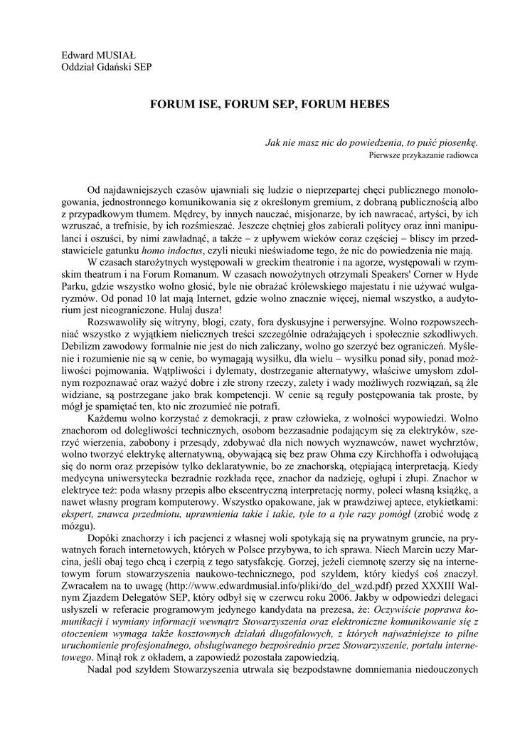 Edward MUSIAŁ Oddział Gdański SEP FORUM ISE, FORUM SEP, FORUM HEBES Jak nie masz nic do powiedzenia, to puść piosenkę. Pierwsze przykazanie radiowca Od najdawniejszych czasów ujawniali się ludzie o nieprzepartej chęci publicznego monologowania, jednostronnego komunikowania się z określonym gremium, z dobraną publicznością albo z przypadkowym tłumem. Mędrcy, by innych nauczać, misjonarze, by ich nawracać, artyści, by ich wzruszać, a trefnisie, by ich rozśmieszać. Jeszcze chętniej głos zabierali politycy oraz inni manipulanci i oszuści, by nimi zawładnąć, a także − z upływem wieków coraz częściej − bliscy im przedstawiciele gatunku homo indoctus, czyli nieuki nieświadome tego, że nic do powiedzenia nie mają. W czasach starożytnych występowali w greckim theatronie i na agorze, występowali w rzymskim theatrum i na Forum Romanum. W czasach nowożytnych otrzymali Speakers' Corner w Hyde Parku, gdzie wszystko wolno głosić, byle nie obrażać królewskiego majestatu i nie używać wulgaryzmów. Od ponad 10 lat mają Internet, gdzie wolno znacznie więcej, niemal wszystko, a audytorium jest nieograniczone. Hulaj dusza! Rozswawoliły się witryny, blogi, czaty, fora dyskusyjne i perwersyjne. Wolno rozpowszechniać wszystko z wyjątkiem nielicznych treści szczególnie odrażających i społecznie szkodliwych. Debilizm zawodowy formalnie nie jest do nich zaliczany, wolno go szerzyć bez ograniczeń. Myślenie i rozumienie nie są w cenie, bo wymagają wysiłku, dla wielu − wysiłku ponad siły, ponad możliwości pojmowania. Wątpliwości i dylematy, dostrzeganie alternatywy, właściwe umysłom zdolnym rozpoznawać oraz ważyć dobre i złe strony rzeczy, zalety i wady możliwych rozwiązań, są źle widziane, są postrzegane jako brak kompetencji. W cenie są reguły postępowania tak proste, by mógł je spamiętać ten, kto nic zrozumieć nie potrafi. Każdemu wolno korzystać z demokracji, z praw człowieka, z wolności wypowiedzi. Wolno znachorom od dolegliwości technicznych, osobom bezzasadnie podającym się za elektryków, szerzyć wierzenia, zabobony i przesądy, zdobywać dla nich nowych wyznawców, nawet wychrztów, wolno tworzyć elektrykę alternatywną, obywającą się bez praw Ohma czy Kirchhoffa i odwołującą się do norm oraz przepisów tylko deklaratywnie, bo ze znachorską, otępiającą interpretacją. Kiedy medycyna uniwersytecka bezradnie rozkłada ręce, znachor da nadzieję, ogłupi i złupi. Znachor w elektryce też: poda własny przepis albo ekscentryczną interpretację normy, poleci własną książkę, a nawet własny program komputerowy. Wszystko opakowane, jak w prawdziwej aptece, etykietkami: ekspert, znawca przedmiotu, uprawnienia takie i takie, tyle to a tyle razy pomógł (zrobić wodę z mózgu). Dopóki znachorzy i ich pacjenci z własnej woli spotykają się na prywatnym gruncie, na prywatnych forach internetowych, których w Polsce przybywa, to ich sprawa. Niech Marcin uczy Marcina, jeśli obaj tego chcą i czerpią z tego satysfakcję. Gorzej, jeżeli ciemnotę szerzy się na internetowym forum stowarzyszenia naukowo-technicznego, pod szyldem, który kiedyś coś znaczył. Zwracałem na to uwagę (http://www.edwardmusial.info/pliki/do_del_wzd.pdf) przed XXXIII Walnym Zjazdem Delegatów SEP, który odbył się w czerwcu roku 2006. Jakby w odpowiedzi delegaci usłyszeli w referacie programowym jedynego kandydata na prezesa, że: Oczywiście poprawa komunikacji i wymiany informacji wewnątrz Stowarzyszenia oraz elektroniczne komunikowanie się z otoczeniem wymaga także kosztownych działań długofalowych, z których najważniejsze to pilne uruchomienie profesjonalnego, obsługiwanego bezpośrednio przez Stowarzyszenie, portalu internetowego. Minął rok z okładem, a zapowiedź pozostała zapowiedzią. Nadal pod szyldem Stowarzyszenia utrwala się bezpodstawne domniemania niedouczonych elektryków, a prawdę ostateczną ustala się przewagą głosów opowiadających się nawet za największą bzdurą. Wystarczy spojrzeć choćby na ostatnio podjęte tematy: prąd zwarciowy udarowy ogniwa pierwotnego albo „który bezpiecznik mocniejszy?” (z nonsensownymi wyjaśnieniami o zwłoczności zwykłych nadprądowych wyłączników instalacyjnych). Wcześniej można było czytać najdziwniejsze rewelacje o wyłącznikach różnicowoprądowych, o doborze ich znamionowego różnicowego prądu zadziałania do zadań ochronnych: ochrony przy uszkodzeniu (ochrony dodatkowej), ochrony uzupełniającej (ochronę podstawową) i ochrony od pożarów wywołanych prądami doziemnymi. Bywały niemądre wyjaśnienia zapewniające o wielkiej niezawodności wyłączników różnicowoprądowych, a także o ich przydatności w instalacjach o układzie TN-C. Wbrew uznanym regułom techniki systematycznie ponawia się przesąd, że nie ma ochrony przeciwporażeniowej bez wyłącznika różnicowoprądowego, gorzej – bez wyłącznika różnicowoprądowego o znamionowym różnicowym prądzie zadziałania nie większym niż 30 mA. Autorzy takich przykazań nie zastanawiają się, dlaczego nie wyginęli użytkownicy elektryczności w czasach, kiedy wyłączników różnicowoprądowych nie było ani jak działa ochrona przeciwporażeniowa w urządzeniach wysokonapięciowych, dla których takich wyłączników nie ma. Zamiast z wyprzedzeniem informować polskich elektryków o już zdecydowanych i w najbliższym czasie wprowadzanych nowelizacjach norm PN-EN bądź PN-HD, uparcie podtrzymuje się postanowienia przestarzałe, zwłaszcza jeżeli ma w tym interes sitwa działaczy przylepionych do SEP-owskich foteli. Na przykład wiele lat temu normy międzynarodowe i zagraniczne (VDE) zrezygnowały z wyodrębniania przestrzeni ochronnej 3 (strefy 3) w pomieszczeniach kąpielowych; są tylko przestrzenie 0, 1 i 2. Pozostałe powierzchnie ścian i ścianek z przyległościami nie są formalnie zaliczane do żadnej przestrzeni ochronnej, ale obo