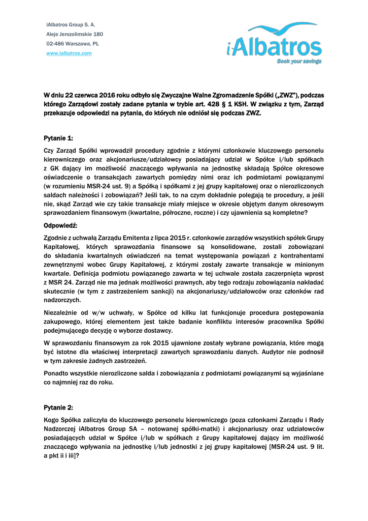 iAlbatros Group S. A. Aleje Jerozolimskie 180 02-486 Warszawa, PL www.ialbatros.com W dniu 22 czerwca 2016 roku odbyło się Zwyczajne Walne Zgromadzenie Spółki („ZWZ”), podczas którego Zarządowi zostały zadane pytania w trybie art. 428 § 1 KSH. W związku z tym, Zarząd przekazuje odpowiedzi na pytania, do których nie odniósł się podczas ZWZ. Pytanie 1: Czy Zarząd Spółki wprowadził procedury zgodnie z którymi członkowie kluczowego personelu kierowniczego oraz akcjonariusze/udziałowcy posiadający udział w Spółce i/lub spółkach z GK dający im możliwość znaczącego wpływania na jednostkę składają Spółce okresowe oświadczenie o transakcjach zawartych pomiędzy nimi oraz ich podmiotami powiązanymi (w rozumieniu MSR-24 ust. 9) a Spółką i spółkami z jej grupy kapitałowej oraz o nierozliczonych saldach należności i zobowiązań? Jeśli tak, to na czym dokładnie polegają te procedury, a jeśli nie, skąd Zarząd wie czy takie transakcje miały miejsce w okresie objętym danym okresowym sprawozdaniem finansowym (kwartalne, półroczne, roczne) i czy ujawnienia są kompletne? Odpowiedź: Zgodnie z uchwałą Zarządu Emitenta z lipca 2015 r. członkowie zarządów wszystkich spółek Grupy Kapitałowej, których sprawozdania finansowe są konsolidowane, zostali zobowiązani do składania kwartalnych oświadczeń na temat występowania powiązań z kontrahentami zewnętrznymi wobec Grupy Kapitałowej, z którymi zostały zawarte transakcje w minionym kwartale. Definicja podmiotu powiązanego zawarta w tej uchwale została zaczerpnięta wprost z MSR 24. Zarząd nie ma jednak możliwości prawnych, aby tego rodzaju zobowiązania nakładać skutecznie (w tym z zastrzeżeniem sankcji) na akcjonariuszy/udziałowców oraz członków rad nadzorczych. Niezależnie od w/w uchwały, w Spółce od kilku lat funkcjonuje procedura postępowania zakupowego, której elementem jest także badanie konfliktu interesów pracownika Spółki podejmującego decyzję o wyborze dostawcy. W sprawozdaniu finansowym za rok 2015 ujawnione zostały wybrane powiązania, które mogą być istotne dla właściwej interpretacji zawartych sprawozdaniu danych. Audytor nie podnosił w tym zakresie żadnych zastrzeżeń. Ponadto wszystkie nierozliczone salda i zobowiązania z podmiotami powiązanymi są wyjaśniane co najmniej raz do roku. Pytanie 2: Kogo Spółka zaliczyła do kluczowego personelu kierowniczego (poza członkami Zarządu i Rady Nadzorczej iAlbatros Group SA – notowanej spółki-matki) i akcjonariuszy oraz udziałowców posiadających udział w Spółce i/lub w spółkach z Grupy kapitałowej dający im możliwość znaczącego wpływania na jednostkę i/lub jednostki z jej grupy kapitałowej [MSR-24 ust. 9 lit. a pkt ii i iii]? iAlbatros Group S. A. Aleje Jerozolimskie 180 02-486 Warszawa, PL www.ialbatros.com Odpowiedź: Poza członkami zarządów/rad nadzorczych nie ma, według naszej najlepszej wiedzy, pracowników Grupy Kapitałowej spełniających ust. 9 lit. a pkt ii lub iii. MSR. Ponadto, w trakcie ZWZ, pełnomocnik jednego z akcjonariuszy zadał pytanie o strukturę przychodów z eksportu w Spółce oraz o plany i kierunki dalszego rozwoju eksportu, na które Zarząd zobowiązał się doprecyzować odpowiedź. Odpowiedź: Aktualnie kluczowym rynkiem jest Francja (obecnie ponad 80% udziału w eksporcie), a drugim w kolejności rynkiem są Włochy (według szacunków na 2016: nieco ponad 15% udziału w eksporcie), ponadto Spółka zakłada rozpoczęcie działalności na innych rynkach. Szacujemy, że w ciągu najbliższych lat udział rynku francuskiego w eksporcie będzie malał i do roku 2019 osiągnie wartość około 60%. Uzasadnieniem takiego stanowiska jest rosnący udział przychodów z rynku włoskiego oraz aktywne prace mające na celu uruchomienie sprzedaży na kolejnych rynkach w Europie. O zawarciu istotnych umów z klientami na każdym z rynków, spółka będzie informowała za pośrednictwem komunikatów giełdowych.