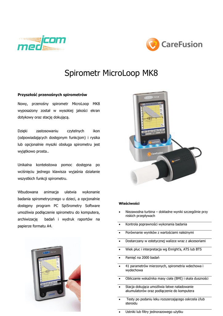 Spirometr MicroLoop MK8 Przyszłość przenośnych spirometrów Nowy, przenośny spirometr MicroLoop MK8 wyposażony został w wysokiej jakości ekran dotykowy oraz stację dokującą. Dzięki zastosowaniu czytelnych ikon (odpowiadających dostępnym funkcjom) i rysika lub opcjonalnie myszki obsługa spirometru jest wyjątkowo prosta.. Unikalna kontekstowa pomoc dostępna po wciśnięciu jednego klawisza wyjaśnia działanie wszystkich funkcji spirometru. Wbudowana animacja ułatwia wykonanie badania spirometrycznego u dzieci, a opcjonalnie dostępny program PC Spi5rometry Software umożliwia podłączenie spirometru do komputera, archiwizację Właściwości Niezawodna turbina – dokładne wyniki szczególnie przy niskich przepływach Kontrola poprawności wykonania badania Porównanie wyników z wartościami należnymi Dostarczany w estetycznej walizce wraz z akcesoriami Wiek płuc i interpretacja wg Enright’a, ATS lub BTS Pamięć na 2000 badań 41 parametrów mierzonych, spirometria wdechowa i wydechowa Obliczanie wskaźnika masy ciała (BMI) i skala duszności Stacja dokująca umożliwia łatwe naładowanie akumulatorów oraz podłączenie do komputera Testy po podaniu leku rozszerzającego oskrzela i/lub steroidu Ustniki lub filtry jednorazowego użytku badań i wydruk raportów na papierze formatu A4. MicroLoop MK8 Parametry techniczne Parametry mierzone VC, FEV0.75, FEV1, FEV3, FEV6, FVC, PEF, FEV0.75/VC, FEV0.75/FVC, FEV1/VC, FEV1/FVC, FEV3/VC, FEV3/FVC, FEV0.75/FEV6, FEV1/FEV6, MEF75, MEF50, MEF25, MEF25-75, FEF50/VC, FEF50/FVC, MMEF/FVC, FIV1, FIVC, PIF, FIV1/FIVC, MIF75, FIF50, MIF25, R50, MET25-75, FET, MVV (ind), EVC, IVC, IC, VT, Ti, Te, Ti/Ttot, VT/Ti, IRV, ERV, FR Ilość prób dla badania 5 dla badania swobodnego VC, 8 dla badania natężonego, 2 badania po podaniu leku Wartości przewidywane Ustawiane zależnie od preferencji narodowych Przetwornik Dwukierunkowy cyfrowy przetwornik objętości - złota turbina Rozdzielczość 10ml objętość, 0,03l/s przepływ Dokładność +/-3% zgodnie ze standardami ATS 1994 w zakresie przepływów i objętości Pamięć do 2000 pacjentów włączając krzywe Przepływ/Objętość i Objętość/Czas Drukarka Możliwość podłączenia zewnętrznej drukarki Wyświetlacz Graficzny, dotykowy Zasilanie 100-240V, 50-60Hz i akumulatory NiMH 8,4V, 1Ah Wymiary Spirometr: 25,5x12x3,5cm, przetwornik 50x60x90mm Waga Spirometr wraz z przetwornikiem: 630g Warunki magazynowania temp. 0-70st. C wilgotność: od 10% do 90%RH Warunki pracy temp. 0-40st. C (należy unikać bezpośredniego nasłonecznienia) wilgotność: od 30% do 90% RH (bez kondensacji) Wyjście RS232 i USB 1,1 Informacje i sprzedaż: Wyłączny importer na Polskę 41-819 Zabrze ul. M. Skłodowskiej Curie 34 tel.: (32) 271 76 66, fax: (32) 273 22 19 strona www: www.medicom.com.pl email: [email protected]