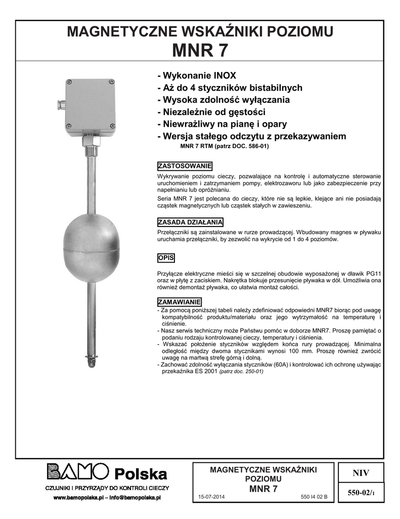 MAGNETYCZNE WSKAŹNIKI POZIOMU MNR 7 - Wykonanie INOX - Aż do 4 styczników bistabilnych - Wysoka zdolność wyłączania - Niezależnie od gęstości - Niewrażliwy na pianę i opary - Wersja stałego odczytu z przekazywaniem MNR 7 RTM (patrz DOC. 586-01) ZASTOSOWANIE Wykrywanie poziomu cieczy, pozwalające na kontrolę i automatyczne sterowanie uruchomieniem i zatrzymaniem pompy, elektrozaworu lub jako zabezpieczenie przy napełnianiu lub opróżnianiu. Seria MNR 7 jest polecana do cieczy, które nie są lepkie, klejące ani nie posiadają cząstek magnetycznych lub cząstek stałych w zawieszeniu. ZASADA DZIAŁANIA Przełączniki są zainstalowane w rurze prowadzącej. Wbudowany magnes w pływaku uruchamia przełączniki, by zezwolić na wykrycie od 1 do 4 poziomów. OPIS Przyłącze elektryczne mieści się w szczelnej obudowie wyposażonej w dławik PG11 oraz w płytę z zaciskiem. Nakrętka blokuje przesunięcie pływaka w dół. Umożliwia ona również demontaż pływaka, co ułatwia montaż całości. ZAMAWIANIE - Za pomocą poniższej tabeli należy zdefiniować odpowiedni MNR7 biorąc pod uwagę kompatybilność produktu/materiału oraz jego wytrzymałość na temperaturę i ciśnienie. - Nasz serwis techniczny może Państwu pomóc w doborze MNR7. Proszę pamiętać o podaniu rodzaju kontrolowanej cieczy, temperatury i ciśnienia. - Wskazać położenie styczników względem końca rury prowadzącej. Minimalna odległość między dwoma stycznikami wynosi 100 mm. Proszę również zwrócić uwagę na martwą strefę górną i dolną. - Zachować zdolność wyłączania styczników (60A) i kontrolować ich ochronę używając przekaźnika ES 2001 (patrz doc. 250-01) MAGNETYCZNE WSKAŹNIKI POZIOMU NIV MNR 7 550-02/1 15-07-2014 550 I4 02 B CHARAKTERYSTYKA TECHNICZNA Obudowa przyłączeniowa Materiał rury Materiał pływaka (1) Ø pływaka (1) Wysokość pływaka (1) Przyłącze Kołnierz PN 10 (opcja) Długość maks. Długość min. Gęstość min. Ciśnienie maks. Temperatura graniczna Zdolność wyłączania Minimalna odległość Precyzja Histereza Strefa martwa wysoka Strefa martwa niska : Malowane aluminium – IP 65 : SS / DIN 1.4404 (AISI 316 L) : SS / DIN 1.4571 (AISI 316 Ti) : 91 mm : 110 mm : R ½” MG : DN 100 (kod: 550 420) : 3 000 : 250 : 0,75 g /cm3 : 25 bar : -20…+110 °C : 60 VA : 100 mm : ± 2 mm : 8 mm : 75 mm : 75 mm KODY I CHARAKTERYSTYKI STYCZNIKI – PRZYŁĄCZE Styczniki mają zdolność wyłączania 60 VA / 220 V / 0,5 A i są bistabilne (jedynie przepłynięcie pływaka może zmienić położenie stycznika). Przyłącze elektryczne odbywa się na zaciskach. Opcjonalnie, kołnierz DN100 umożliwia instalację bez demontażu pływaka. MAGNETYCZNE WSKAŹNIKI POZIOMU NIV MNR 7 550-02/2 15-07-2014 550 I4 02 B