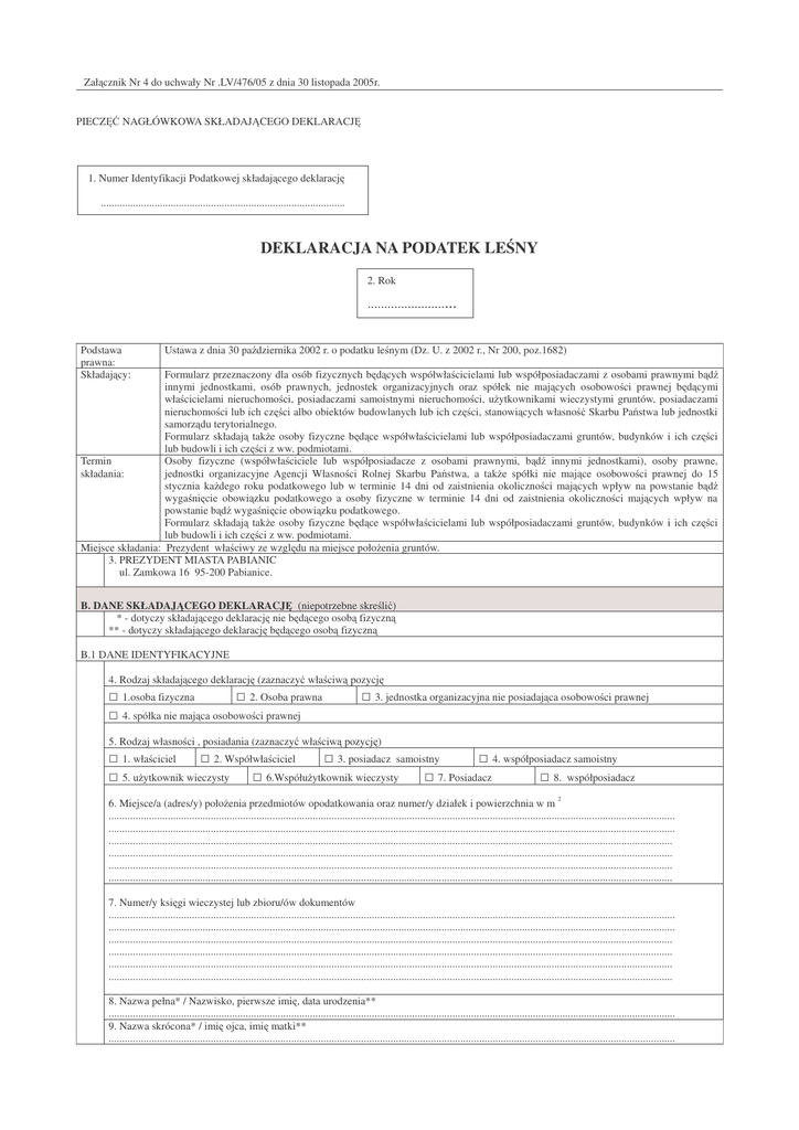 Zał cznik Nr 4 do uchwały Nr .LV/476/05 z dnia 30 listopada 2005r. PIECZ NAGŁÓWKOWA SKŁADAJ CEGO DEKLARACJ 1. Numer Identyfikacji Podatkowej składaj cego deklaracj ........................................................................................... DEKLARACJA NA PODATEK LE NY 2. Rok .......................... Podstawa prawna: Składaj cy: Ustawa z dnia 30 pa dziernika 2002 r. o podatku le nym (Dz. U. z 2002 r., Nr 200, poz.1682) Formularz przeznaczony dla osób fizycznych b d cych współwła cicielami lub współposiadaczami z osobami prawnymi b d innymi jednostkami, osób prawnych, jednostek organizacyjnych oraz spółek nie maj cych osobowo ci prawnej b d cymi wła cicielami nieruchomo ci, posiadaczami samoistnymi nieruchomo ci, u ytkownikami wieczystymi gruntów, posiadaczami nieruchomo ci lub ich cz ci albo obiektów budowlanych lub ich cz ci, stanowi cych własno Skarbu Pa stwa lub jednostki samorz du terytorialnego. Formularz składaj tak e osoby fizyczne b d ce współwła cicielami lub współposiadaczami gruntów, budynków i ich cz ci lub budowli i ich cz ci z ww. podmiotami. Termin Osoby fizyczne (współwła ciciele lub współposiadacze z osobami prawnymi, b d innymi jednostkami), osoby prawne, składania: jednostki organizacyjne Agencji Własno ci Rolnej Skarbu Pa stwa, a tak e spółki nie maj ce osobowo ci prawnej do 15 stycznia ka dego roku podatkowego lub w terminie 14 dni od zaistnienia okoliczno ci maj cych wpływ na powstanie b d wyga ni cie obowi zku podatkowego a osoby fizyczne w terminie 14 dni od zaistnienia okoliczno ci maj cych wpływ na powstanie b d wyga ni cie obowi zku podatkowego. Formularz składaj tak e osoby fizyczne b d ce współwła cicielami lub współposiadaczami gruntów, budynków i ich cz ci lub budowli i ich cz ci z ww. podmiotami. Miejsce składania: Prezydent wła ciwy ze wzgl du na miejsce poło enia gruntów. 3. PREZYDENT MIASTA PABIANIC ul. Zamkowa 16 95-200 Pabianice. B. DANE SKŁADAJ CEGO DEKLARACJ (niepotrzebne skre li ) * - dotyczy składaj cego deklaracj nie b d cego osob fizyczn ** - dotyczy składaj cego deklaracj b d cego osob fizyczn B.1 DANE IDENTYFIKACYJNE 4. Rodzaj składaj cego deklaracj (zaznaczy wła ciw pozycj 1.osoba fizyczna 2. Osoba prawna 3. jednostka organizacyjna nie posiadaj ca osobowo ci prawnej 4. spółka nie maj ca osobowo ci prawnej 5. Rodzaj własno ci , posiadania (zaznaczy wła ciw pozycj ) 1. wła ciciel 2. Współwła ciciel 5. u ytkownik wieczysty 3. posiadacz samoistny 6.Współu ytkownik wieczysty 7. Posiadacz 4. współposiadacz samoistny 8. współposiadacz 2 6. Miejsce/a (adres/y) poło enia przedmiotów opodatkowania oraz numer/y działek i powierzchnia w m ................................................................................................................................................................................................................... ................................................................................................................................................................................................................... .................................................................................................................................................................................................................. .................................................................................................................................................................................................................. .................................................................................................................................................................................................................. .................................................................................................................................................................................................................. 7. Numer/y ksi gi wieczystej lub zbioru/ów dokumentów ................................................................................................................................................................................................................... ................................................................................................................................................................................................................... .................................................................................................................................................................................................................. .................................................................................................................................................................................................................. .................................................................................................................................................................................................................. .................................................................................................................................................................................................................. 8. Nazwa pełna* / Nazwisko, pierwsze imi , data urodzenia** ................................................................................................................................................................................................................... 9. Nazwa skrócona* / imi ojca, imi matki** ................................................................................................................................................................................................................... 10. Identyfikator REGON* / Numer PESEL** ..................................................................................................................................