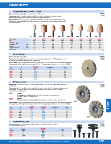 Tarcze filcowe Trzpienie filcowe, trzonek l 6 mm Wykonanie: Z trwa∏ego filcu, z trzpieniem metalowym. Przeznaczenie: Do obróbki wczeÊniej szlifowanych powierzchni, do polerowania powierzchni, elementów drà˝onych i powierzchni kszta∏towych. Wskazówka: W celu uzyskania optymalnych efektów podczas polerowania zaleca si´ stosowanie wraz z pastà szlifierskà i polerskà (nr zamów. 8611) lub pastà do docierania (nr zamów. 8608). ZYA Nr. zamów typ 8602 g∏ówka l d∏ugoÊç d∏ugoÊç trzonka pakowane mm mm mm ZYA SPK WRC TRE KEL KEL KEL 0010 ZYA 0020 ZYA 0030 SPK 0040 WRC 0050 TRE 0060 KEL 0070 KEL 0080 KEL 2,84 10 14 40 10 4,91 20 25 40 10 3,51 15 20 40 10 4,53 20 25 40 10 2,89 10 14 40 10 4,53 20 25 40 10 5,67 25 30 40 10 7,67 30 35 40 10 (868) Tarcze filcowe Wykonanie: Z trwa∏ego filcu. Przeznaczenie: W po∏àczeniu z trzpieniem mocujàcym (nr zamów. 8600) do polerowania wczeÊniej szlifowanych powierzchni elementów. Wskazówka: W celu uzyskania optymalnych efektów podczas polerowania zaleca si´ stosowanie wraz z pastà szlifierskà i polerskà (nr zamów. 8611) lub pastà do docierania (nr zamów. 8608). Nr. zamów l mm 8599 szerokoÊç mm otwór mm 0080 0100 0125 0150 0200 180 100 125 150 200 16,51 19,01 26,15 39,38 80,22 10 20 20 25 30 10 10 20 20 20 (868) Tarcze z sukna Wykonanie: Z falistego sukna o ró˝nych twardoÊciach, mocno osadzone w pierÊcieniach metalowych. Przeznaczenie: Do obróbki wczeÊniej szlifowanych elementów. W po∏àczeniu z trzpieniem mocujàcym (nr zamów. 8600) do polerowania powierzchni, elementów drà˝onych i powierzchni kszta∏towych. Wskazówka: W celu uzyskania optymalnych efektów podczas polerowania zaleca si´ stosowanie wraz z pastà szlifierskà i polerskà (nr zamów. 8611) lub pastà do docierania (nr zamów. 8608). Nr. zamów l mm 8597 8596 szerokoÊç mm otwór mm 0080 0100 0125 0150 0200 180 100 125 150 200 2,76 3,09 3,94 5,57 9,71 2,31 2,58 3,37 3,94 7,14 10 10 10 10 10 10 10 20 20 20 (868) (868) 8597 Narz´dzia Êcierne 8596 Twarde. Do wst´pnego polerowania stali, stali nierdzewnych, aluminium, mosiàdzu i metali nie˝elaznych. Mi´kkie. Do polerowania na wysoki po∏ysk wszystkich metali i tworzyw sztucznych. 8 8597 8596 Trzpienie mocujàce Przeznaczenie: Do mocowania tarcz filcowych (nr zamów. 8599) i z sukna (nr zamów. 8596 i 8597). Nr. zamów 0010 0020 0030 trzpieƒ l mm 8600 otwór mm 18 12 MK1 17,40 20,27 30,56 10 20 20 (868) Sta∏e stany magazynowe nie obejmujà artyku∏ów oznaczonych znakiem ◊. Wyd∏u˝ony czas oczekiwania. 8/55
