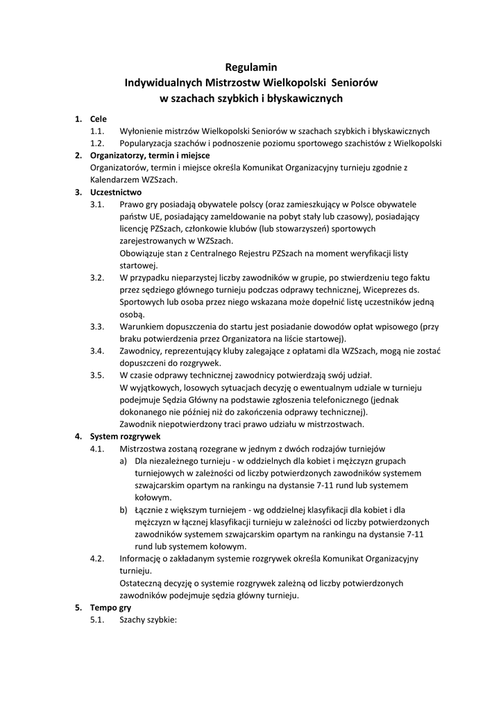 Regulamin Indywidualnych Mistrzostw Wielkopolski Seniorów w szachach szybkich i błyskawicznych 1. Cele 1.1. Wyłonienie mistrzów Wielkopolski Seniorów w szachach szybkich i błyskawicznych 1.2. Popularyzacja szachów i podnoszenie poziomu sportowego szachistów z Wielkopolski 2. Organizatorzy, termin i miejsce Organizatorów, termin i miejsce określa Komunikat Organizacyjny turnieju zgodnie z Kalendarzem WZSzach. 3. Uczestnictwo 3.1. Prawo gry posiadają obywatele polscy (oraz zamieszkujący w Polsce obywatele państw UE, posiadający zameldowanie na pobyt stały lub czasowy), posiadający licencję PZSzach, członkowie klubów (lub stowarzyszeń) sportowych zarejestrowanych w WZSzach. Obowiązuje stan z Centralnego Rejestru PZSzach na moment weryfikacji listy startowej. 3.2. W przypadku nieparzystej liczby zawodników w grupie, po stwierdzeniu tego faktu przez sędziego głównego turnieju podczas odprawy technicznej, Wiceprezes ds. Sportowych lub osoba przez niego wskazana może dopełnić listę uczestników jedną osobą. 3.3. Warunkiem dopuszczenia do startu jest posiadanie dowodów opłat wpisowego (przy braku potwierdzenia przez Organizatora na liście startowej). 3.4. Zawodnicy, reprezentujący kluby zalegające z opłatami dla WZSzach, mogą nie zostać dopuszczeni do rozgrywek. 3.5. W czasie odprawy technicznej zawodnicy potwierdzają swój udział. W wyjątkowych, losowych sytuacjach decyzję o ewentualnym udziale w turnieju podejmuje Sędzia Główny na podstawie zgłoszenia telefonicznego (jednak dokonanego nie później niż do zakończenia odprawy technicznej). Zawodnik niepotwierdzony traci prawo udziału w mistrzostwach. 4. System rozgrywek 4.1. Mistrzostwa zostaną rozegrane w jednym z dwóch rodzajów turniejów a) Dla niezależnego turnieju - w oddzielnych dla kobiet i mężczyzn grupach turniejowych w zależności od liczby potwierdzonych zawodników systemem szwajcarskim opartym na rankingu na dystansie 7-11 rund lub systemem kołowym. b) Łącznie z większym turniejem - wg oddzielnej klasyfikacji dla kobiet i dla mężczyzn w łącznej klasyfikacji turnieju w zależności od liczby potwierdzonych zawodników systemem szwajcarskim opartym na rankingu na dystansie 7-11 rund lub systemem kołowym. 4.2. Informację o zakładanym systemie rozgrywek określa Komunikat Organizacyjny turnieju. Ostateczną decyzję o systemie rozgrywek zależną od liczby potwierdzonych zawodników podejmuje sędzia główny turnieju. 5. Tempo gry 5.1. Szachy szybkie: 10 minut dla zawodnika oraz 5 sekund na każde posunięcie od początku partii albo 15 minut dla zawodnika na partię. Szachy błyskawiczne: 3 minuty dla zawodnika oraz 2 sekundy na każde posunięcie od początku partii albo 5 minut dla zawodnika na partię. 5.2. Ostateczne tempo gry określa Komunikat Organizacyjny turnieju. 6. Zgłoszenia 6.1. Organizator zobowiązany jest przesłać Komunikat Organizacyjny turnieju w formie elektronicznej na adres [email protected] przynajmniej 40 dni przed ich rozpoczęciem. 6.2. Komunikat Organizacyjny powinien zostać opublikowany na stronie WZSzach niezwłocznie po zatwierdzeniu przez Wiceprezesa ds. Sportowych. 6.3. Potwierdzenia udziału zawodników dokonują zawodnicy w sposób i w terminach określonych przez Organizatora w Komunikacie Organizacyjnym turnieju. 6.4. Jeżeli Organizatorem jest WZSzach to obowiązki Organizatora realizuje Wiceprezes ds. Sportowych lub osoba przez niego wyznaczona. 7. Finansowanie 7.1. Koszty organizacji ponosi Organizator. 7.2. Koszty udziału zawodników w mistrzostwach pokrywają delegujące zawodników kluby lub zawodnicy. 7.3. Wpisowe składa się z: a) Opłaty startowej zgodnej z Komunikatem Organizacyjno-Finansowym WZSZach, b) Opłaty organizacyjnej, c) Opłaty klasyfikacyjno-rankingowej zgodnej z Komunikatem OrganizacyjnoFinansowym WZSZach. Szczegółowe informacje o wysokości opłat oraz terminach i sposobach ich regulowania określa Komunikat Organizacyjny turnieju. 7.4. W przypadku wycofania się z rozgrywek po uprzednim potwierdzeniu udziału wpisowe nie jest zwracane. 8. Ocena wyników 8.1. Dla turniejów organizowanych systemem szwajcarskim klasyfikacja końcowa ustalana jest z uwzględnieniem następujących, kolejno stosowanych kryteriów: a) suma zdobytych punktów, b) wartościowanie średnie Buchholza, c) wartościowanie pełne Buchholza, d) liczba zwycięstw, e) liczba partii rozegranych czarnymi, f) wynik bezpośredniej partii między zainteresowanymi zawodnikami, g) średni ranking krajowy przeciwników. 8.2. Dla turniejów organizowanych systemem kołowym klasyfikacja końcowa ustalana jest z uwzględnieniem następujących, kolejno stosowanych kryteriów: a) suma zdobytych punktów, b) system Sonnenberga-Bergera, c) system Koyi, d) wynik bezpośredniej partii, e) liczba zwycięstw. 8.3. W przypadku braku rozstrzygnięcia na podstawie powyższych kryteriów o tytule mistrza Wielkopolski zadecyduje dogrywka na zasadach ustalonych przez sędziego głównego (dalsze lokaty będą dzielone). 9. Nagrody i wyróżnienia 9.1. Zwycięzca w każdej grupie wiekowej otrzymuje tytuł Mistrza Wielkopolski. 9.2. Zawodnicy, którzy zajmą miejsca 1-3 otrzymują puchary, a miejsca 4-6 dyplomy. 9.3. Komunikat Organizacyjny turnieju może określać dodatkowe nagrody. 10. Sędziowanie 10.1. Mistrzostwa zostaną przeprowadzone zgodnie z obowiązującymi przepisami gry FIDE oraz Kodeksem Szachowym. 10.2. Zawody prowadzi sędzia główny, posiadający co najmniej klasę państwową przy pomocy sędziów asystentów, posiadających co najmniej II klasę sędziowską. Wszyscy sędziowie muszą posiadać aktualną licencję sędziowską oraz mieć uiszczoną roczną opłatę uprawniającą do sędziowania zawodów w danym roku. Dotyczy to również opłat i licencji FIDE jeżeli dany turniej ma być zgłoszony do FIDE. 10.3. Za terminowe i prawidłowe zgłoszenie turnieju (KKiE, PZSzach, CR, FIDE) oraz jego sklasyfikowanie (sprawozdanie) odpowiad