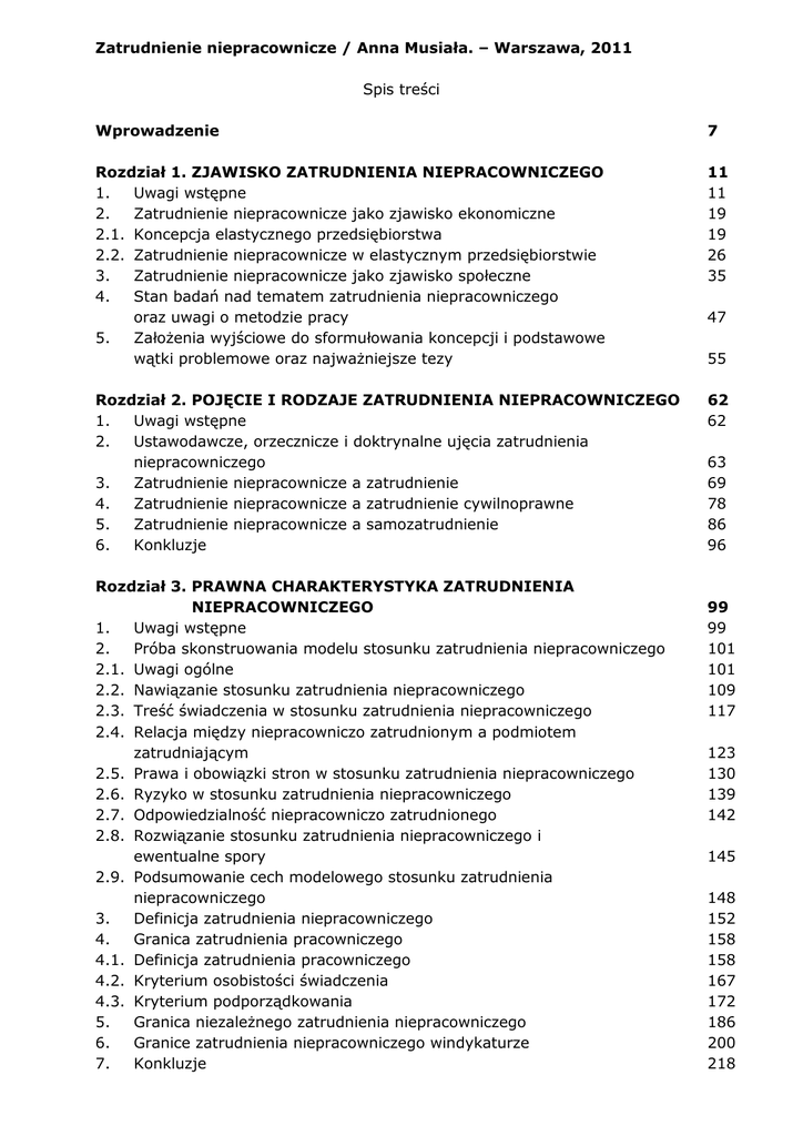 Zatrudnienie niepracownicze / Anna Musiała. – Warszawa, 2011 Spis treści Wprowadzenie 7 Rozdział 1. ZJAWISKO ZATRUDNIENIA NIEPRACOWNICZEGO 1. Uwagi wstępne 2. Zatrudnienie niepracownicze jako zjawisko ekonomiczne 2.1. Koncepcja elastycznego przedsiębiorstwa 2.2. Zatrudnienie niepracownicze w elastycznym przedsiębiorstwie 3. Zatrudnienie niepracownicze jako zjawisko społeczne 4. Stan badań nad tematem zatrudnienia niepracowniczego oraz uwagi o metodzie pracy 5. ZałoŜenia wyjściowe do sformułowania koncepcji i podstawowe wątki problemowe oraz najwaŜniejsze tezy 11 11 19 19 26 35 Rozdział 2. POJĘCIE I RODZAJE ZATRUDNIENIA NIEPRACOWNICZEGO 1. Uwagi wstępne 2. Ustawodawcze, orzecznicze i doktrynalne ujęcia zatrudnienia niepracowniczego 3. Zatrudnienie niepracownicze a zatrudnienie 4. Zatrudnienie niepracownicze a zatrudnienie cywilnoprawne 5. Zatrudnienie niepracownicze a samozatrudnienie 6. Konkluzje 62 62 Rozdział 3. PRAWNA CHARAKTERYSTYKA ZATRUDNIENIA NIEPRACOWNICZEGO 1. Uwagi wstępne 2. Próba skonstruowania modelu stosunku zatrudnienia niepracowniczego 2.1. Uwagi ogólne 2.2. Nawiązanie stosunku zatrudnienia niepracowniczego 2.3. Treść świadczenia w stosunku zatrudnienia niepracowniczego 2.4. Relacja między niepracowniczo zatrudnionym a podmiotem zatrudniającym 2.5. Prawa i obowiązki stron w stosunku zatrudnienia niepracowniczego 2.6. Ryzyko w stosunku zatrudnienia niepracowniczego 2.7. Odpowiedzialność niepracowniczo zatrudnionego 2.8. Rozwiązanie stosunku zatrudnienia niepracowniczego i ewentualne spory 2.9. Podsumowanie cech modelowego stosunku zatrudnienia niepracowniczego 3. Definicja zatrudnienia niepracowniczego 4. Granica zatrudnienia pracowniczego 4.1. Definicja zatrudnienia pracowniczego 4.2. Kryterium osobistości świadczenia 4.3. Kryterium podporządkowania 5. Granica niezaleŜnego zatrudnienia niepracowniczego 6. Granice zatrudnienia niepracowniczego windykaturze 7. Konkluzje 47 55 63 69 78 86 96 99 99 101 101 109 117 123 130 139 142 145 148 152 158 158 167 172 186 200 218 Rozdział 4. PRAWNA OCHRONA ZATRUDNIENIA NIEPRACOWNICZEGO 1. Uwagi wstępne 2. Zasada swobody umów a zatrudnienie niepracowniczo 3. Zatrudnienie niepracownicze w kontekście podstawowych praw społecznych 4. Propozycja Międzynarodowej Organizacji Pracy contract labour 5. Metoda i zakres ochrony stosunku zatrudnienia niepracowniczego 5.1. Metoda 5.2. Zakres 6. Konkluzje 223 223 224 228 236 242 242 250 262 Wnioski 265 Bibliografia 276 oprac. BPK