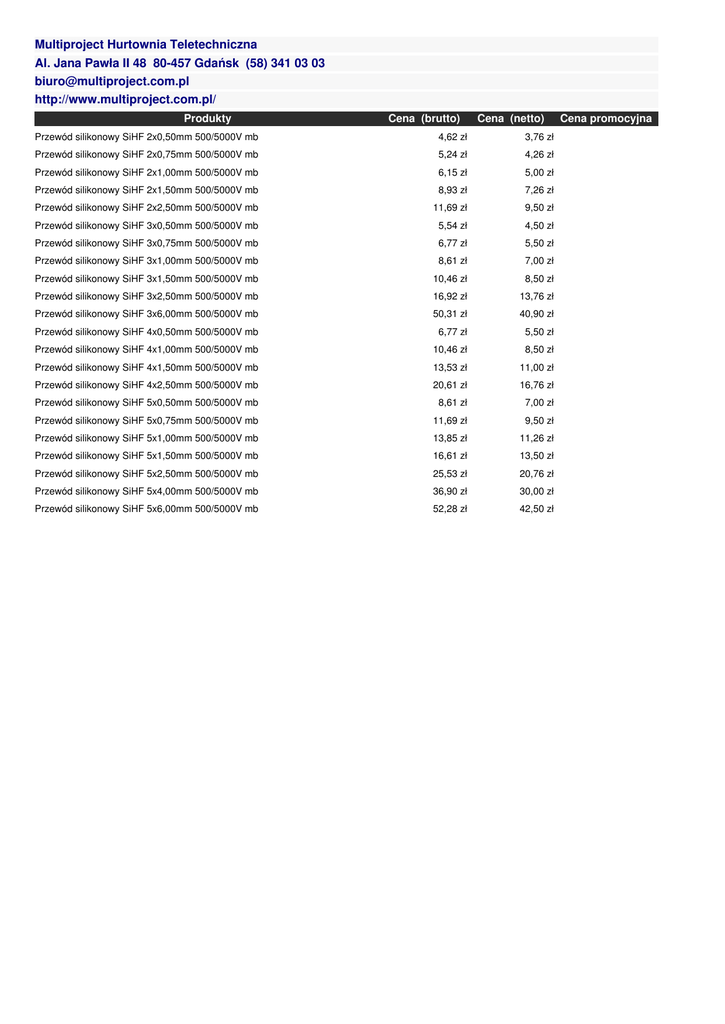 Multiproject Hurtownia Teletechniczna Al. Jana Pawła II 48 80-457 Gdańsk (58) 341 03 03 [email protected] http://www.multiproject.com.pl/ Produkty Cena (brutto) Cena (netto) Przewód silikonowy SiHF 2x0,50mm 500/5000V mb 4,62 zł 3,76 zł Przewód silikonowy SiHF 2x0,75mm 500/5000V mb 5,24 zł 4,26 zł Przewód silikonowy SiHF 2x1,00mm 500/5000V mb 6,15 zł 5,00 zł Przewód silikonowy SiHF 2x1,50mm 500/5000V mb 8,93 zł 7,26 zł Przewód silikonowy SiHF 2x2,50mm 500/5000V mb 11,69 zł 9,50 zł Przewód silikonowy SiHF 3x0,50mm 500/5000V mb 5,54 zł 4,50 zł Przewód silikonowy SiHF 3x0,75mm 500/5000V mb 6,77 zł 5,50 zł Przewód silikonowy SiHF 3x1,00mm 500/5000V mb 8,61 zł 7,00 zł Przewód silikonowy SiHF 3x1,50mm 500/5000V mb 10,46 zł 8,50 zł Przewód silikonowy SiHF 3x2,50mm 500/5000V mb 16,92 zł 13,76 zł Przewód silikonowy SiHF 3x6,00mm 500/5000V mb 50,31 zł 40,90 zł Przewód silikonowy SiHF 4x0,50mm 500/5000V mb 6,77 zł 5,50 zł Przewód silikonowy SiHF 4x1,00mm 500/5000V mb 10,46 zł 8,50 zł Przewód silikonowy SiHF 4x1,50mm 500/5000V mb 13,53 zł 11,00 zł Przewód silikonowy SiHF 4x2,50mm 500/5000V mb 20,61 zł 16,76 zł Przewód silikonowy SiHF 5x0,50mm 500/5000V mb 8,61 zł 7,00 zł Przewód silikonowy SiHF 5x0,75mm 500/5000V mb 11,69 zł 9,50 zł Przewód silikonowy SiHF 5x1,00mm 500/5000V mb 13,85 zł 11,26 zł Przewód silikonowy SiHF 5x1,50mm 500/5000V mb 16,61 zł 13,50 zł Przewód silikonowy SiHF 5x2,50mm 500/5000V mb 25,53 zł 20,76 zł Przewód silikonowy SiHF 5x4,00mm 500/5000V mb 36,90 zł 30,00 zł Przewód silikonowy SiHF 5x6,00mm 500/5000V mb 52,28 zł 42,50 zł Cena promocyjna