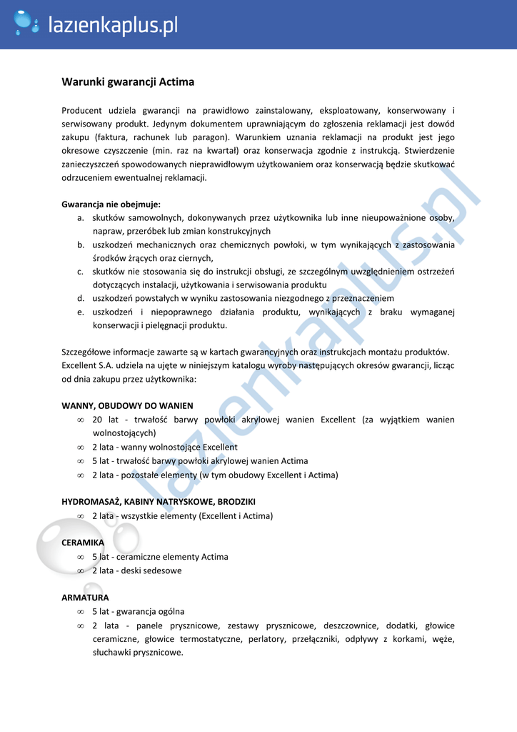 Warunki gwarancji Actima Producent udziela gwarancji na prawidłowo zainstalowany, eksploatowany, konserwowany i serwisowany produkt. Jedynym dokumentem uprawniającym do zgłoszenia reklamacji jest dowód zakupu (faktura, rachunek lub paragon). Warunkiem uznania reklamacji na produkt jest jego okresowe czyszczenie (min. raz na kwartał) oraz konserwacja zgodnie z instrukcją. Stwierdzenie zanieczyszczeń spowodowanych nieprawidłowym użytkowaniem oraz konserwacją będzie skutkować odrzuceniem ewentualnej reklamacji. Gwarancja nie obejmuje: a. skutków samowolnych, dokonywanych przez użytkownika lub inne nieupoważnione osoby, napraw, przeróbek lub zmian konstrukcyjnych b. uszkodzeń mechanicznych oraz chemicznych powłoki, w tym wynikających z zastosowania środków żrących oraz ciernych, c. skutków nie stosowania się do instrukcji obsługi, ze szczególnym uwzględnieniem ostrzeżeń dotyczących instalacji, użytkowania i serwisowania produktu d. uszkodzeń powstałych w wyniku zastosowania niezgodnego z przeznaczeniem e. uszkodzeń i niepoprawnego działania produktu, wynikających z braku wymaganej konserwacji i pielęgnacji produktu. Szczegółowe informacje zawarte są w kartach gwarancyjnych oraz instrukcjach montażu produktów. Excellent S.A. udziela na ujęte w niniejszym katalogu wyroby następujących okresów gwarancji, licząc od dnia zakupu przez użytkownika: WANNY, OBUDOWY DO WANIEN • 20 lat - trwałość barwy powłoki akrylowej wanien Excellent (za wyjątkiem wanien wolnostojących) • 2 lata - wanny wolnostojące Excellent • 5 lat - trwałość barwy powłoki akrylowej wanien Actima • 2 lata - pozostałe elementy (w tym obudowy Excellent i Actima) HYDROMASAŻ, KABINY NATRYSKOWE, BRODZIKI • 2 lata - wszystkie elementy (Excellent i Actima) CERAMIKA • 5 lat - ceramiczne elementy Actima • 2 lata - deski sedesowe ARMATURA • 5 lat - gwarancja ogólna • 2 lata - panele prysznicowe, zestawy prysznicowe, deszczownice, dodatki, głowice ceramiczne, głowice termostatyczne, perlatory, przełączniki, odpływy z korkami, węże, słuchawki prysznicowe. Zasady składania reklamacji Podstawę złożenia reklamacji stanowi dowód zakupu (faktura, rachunek, paragon), a w przypadku wanien z hydromasażem także podbita karta gwarancyjna oraz świadectwo podłączenia elektrycznego. Reklamację można zgłaszać w miejscu zakupu produktu lub bezpośrednio u producenta. Sprzedawca ma obowiązek ustosunkowania się do żądania Klienta i poinformowania go o tym fakcie w terminie nie dłuższym niż 14 dni od dnia zgłoszenia reklamacji przez Klienta. Gwarancja obejmuje produkty sprzedane i zainstalowane na terenie Rzeczypospolitej Polskiej. Excellent S.A. zastrzega sobie prawo do zmian produkcyjnych i modyfikacji wyrobów, podyktowanych postępem technicznym, bez uprzedniego zawiadomienia; w tym w trybie reklamacji elementy mogą zostać wymienione na odpowiedniki o tych samych właściwościach i walorach użytkowych, ale zgodne z obecnie wprowadzonym standardem technicznym i technologicznym w budowie produktów.