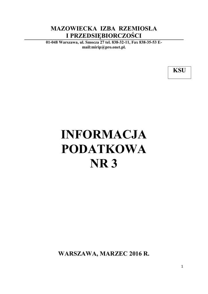 MAZOWIECKA IZBA RZEMIOSŁA I PRZEDSIĘBIORCZOŚCI 01-048 Warszawa, ul. Smocza 27 tel. 838-32-11, Fax 838-35-53 Email:[email protected]. KSU INFORMACJA PODATKOWA NR 3 WARSZAWA, MARZEC 2016 R. 1 MINISTERSTWO FINANSÓW UDOSTĘPNIŁO WYPEŁNIONE ZEZNANIA PODATKOWE PIT WSTĘPNIE Od 18 marca br. dostępne są wstępnie wypełnione roczne zeznania podatkowe (tzw. usługa PFR – pre-filled tax return) za rok 2015 – poinformowało Ministerstwo Finansów. W obecnym roku usługa obejmuje zarówno zeznanie PIT-37, jak i PIT-38. Usługa PFR to ułatwienie dla składających roczne zeznania podatkowe. Podatnik, który rozlicza się drogą elektroniczną, może otrzymać od administracji podatkowej propozycję częściowo wypełnionego rozliczenia rocznego. W efekcie podatnik może wyraźnie ograniczyć czas konieczny do rozliczenia się z urzędem skarbowym. Jednocześnie pozwalać ma to na uniknięcie błędów, które mogą pojawiać się przy tradycyjnym przepisywaniu danych z informacji pochodzących od płatników podatku dochodowego PIT. Jak wskazuje Ministerstwo Finansów, osoby korzystające z usługi PFR powinny sprawdzać poprawność danych, które zawarto w udostępnionym przez urząd zeznaniu. Następnym krokiem powinno być złożenie podpisu i wysłanie zeznania. Co istotne, podatnicy mają również możliwość uzupełnienia takiego wstępnie wypełnionego zeznania np. o ulgi na dzieci, odliczenia oraz kwotę 1 proc. podatku dla wybranej organizacji pożytku publicznego (OPP). Oczywiście nadal można składać deklaracje PIT-37 i PIT-38 na dotychczasowych zasadach, czyli drogą elektroniczną do systemu e-Deklaracje lub w formie papierowej”. Więcej informacji nt. usługi wstępnie wypełnionego zeznania podatkowego (PFR) można znaleźć pod adresem: http://www.finanse.mf.gov.pl/pp/wstepnie-wypelnione-zeznaniepodatkowe-pfr KOSZTY UPOMNIENIA – NOWE ZASADY ZALICZANIA WPŁAT Z dniem 1 stycznia 2016 r. nastąpiła zmiana zasad dotyczących kolejności zaliczania wpłat dokonanych przez podatnika. Zgodnie z nowym brzmieniem art. 62 § 1a ustawy z 29 sierpnia 1997 r. – Ordynacja podatkowa: (...) jeżeli na podatniku ciążą koszty doręczonego upomnienia, dokonaną wpłatę zalicza się w pierwszej kolejności na poczet tych kosztów. Zgodnie z zapisami uzasadnienia do projektu zmiany ustawy – Ordynacja podatkowa oraz niektórych innych ustaw projektodawca wskazał, że obecne rozwiązanie polegające na konieczności egzekwowania samych kosztów upomnienia jest uciążliwe dla podatnika i nieekonomiczne. Wszczęcie postępowania egzekucyjnego na same koszty upomnienia generuje dalsze koszty egzekucyjne, dlatego właściwsze jest zaspokajanie tych kosztów wraz z wpłatą na należność główną. Wobec tego proponuje się wprowadzenie obowiązku zaliczania przez organy podatkowe dokonanej wpłaty w pierwszej kolejności na poczet kosztów doręczonego upomnienia. W brzmieniu obowiązującym do 31 grudnia 2015 r. organ podatkowy nie miał prawa zaliczyć w pierwszej kolejności wpłaty dokonanej przez podatnika na poczet kosztów upomnienia. Z 2 uwagi na to powstawały sytuacje, w których wierzyciel podatkowy, po dokonaniu przez podatnika wpłaty na poczet zaległości podatkowej (po uprzednim doręczeniu upomnienia), nie mógł jej zaliczyć w pierwszej kolejności na koszty upomnienia. Stąd w wielu gminach i urzędach skarbowych istniał problem egzekwowania samych kosztów upomnienia, co wiązało się z generowaniem dalszych kosztów egzekucyjnych, co w dalszej kolejności wiązało się z licznymi sporami między organami podatkowymi a dłużnikami. Ponadto ustawodawca wprowadził przepis, zgodnie z którym w określonych przypadkach nie ma konieczności wydawania postanowień w razie zaliczenia wpłaty na poczet zaległości podatkowej, odsetek za zwłokę lub kosztów upomnienia (art. 62 § 4a). Są to przypadki następujące: a. wpłata w całości pokrywa kwotę główną zaległości wraz z odsetkami za zwłokę, b. zaliczenie wpłaty następuje w całości zgodnie z żądaniem podatnika, c. kwota wpłaty podlegającej zaliczeniu na poczet zaległości podatkowej, odsetek za zwłokę lub kosztów upomnienia nie przekracza pięciokrotności kosztów upomnienia, d. od wpłat dokonanych po terminie płatności nie naliczono odsetek za zwłokę zgodnie z art. 54 § 1 pkt 5. Konsekwencją częściowego zaliczenia wpłat na poczet zaległości podatkowych może być sytuacja, w której dokonana wpłata spowoduje, że do zapłaty pozostanie tzw. reszta w groszach, co będzie skutkowało brakiem zastosowania regulacji zawartej w art. 63 § 1 Ordynacji podatkowej dotyczącej zaokrągleń. Zgodnie bowiem z art. 63 § 3 cytowanej powyżej ustawy przepis ten nie ma zastosowania w sytuacji zaliczenia wpłaty, zaliczenia nadpłaty lub zaliczenia zwrotu podatku. JEDNOLITY PLIK KONTROLNY Resort finansów opublikował projekt kolejnego rozporządzenia dotyczącego Jednolitego Pliku Kontrolnego (JPK), którego wprowadzenie umożliwić ma prowadzenie e-kontroli i zwiększyć efektywność organów podatkowych. W nowym rozporządzeniu określono m.in. szczegóły dotyczące sposobu przesyłania ksiąg podatkowych oraz wymagania techniczne dla nośników danych, na których zapisywane i przekazywane mają być księgi podatkowe. Początkowo nowy obowiązek przekazywania danych w formie JPK obowiązywać ma firmy, które zatrudniają ponad 250 osób albo mają obroty na poziomie ponad 50 mln euro (lub sumę aktywów na poziomie 43 mln euro). Dla tych podatników obowiązek wprowadzony zostanie już 1 lipca 2016 r. Dla pozostałych ma to być lipiec 2018 r. Nowy projekt zakłada, że księgi podatkowe, części tych ksiąg i dowody księgowe w postaci elektronicznej będą mogły być przesyłane za pomocą „oprogramowania interfejsowego dostępnego na stronie, której adres jest podany w Biuletynie Informacji Publicznej na stronie podmiotowej urzędu obsługującego ministra właści