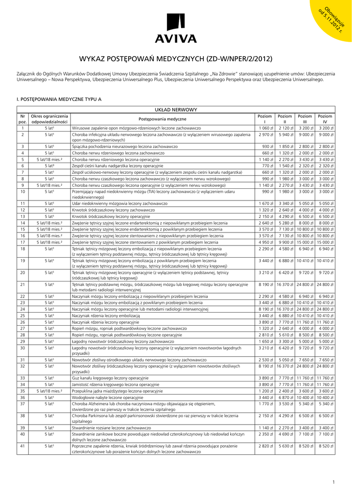 je r. zu 2 ią 1 w .20 bo 1 O 5.1 od Wykaz postępowań medycznych (ZD-W/NPER/2/2012) Załącznik do Ogólnych Warunków Dodatkowej Umowy Ubezpieczenia Świadczenia Szpitalnego „Na Zdrowie” stanowiącej uzupełnienie umów: Ubezpieczenia Uniwersalnego – Nowa Perspektywa, Ubezpieczenia Uniwersalnego Plus, Ubezpieczenia Uniwersalnego Perspektywa oraz Ubezpieczenia Uniwersalnego. I. Postępowania medyczne typu A UKŁAD nerwowy Nr poz. Okres ograniczenia odpowiedzialności Postępowania medyczne Poziom I Poziom II Poziom III Poziom IV 1 5 lat¹ Wirusowe zapalenie opon mózgowo-rdzeniowych leczone zachowawczo 1 060 zł 2 120 zł 3 200 zł 3 200 zł 2 5 lat¹ Choroba infekcyjna układu nerwowego leczona zachowawczo (z wyłączeniem wirusowego zapalenia opon mózgowo-rdzeniowych) 2 970 zł 5 940 zł 9 000 zł 9 000 zł 3 5 lat¹ Śpiączka pochodzenia nieurazowego leczona zachowawczo 930 zł 1 850 zł 2 800 zł 2 800 zł 4 5 lat¹ Choroba nerwu rdzeniowego leczona zachowawczo 660 zł 1 320 zł 2 000 zł 2 000 zł 5 5 lat/18 mies.² 6 5 lat³ Choroba nerwu rdzeniowego leczona operacyjnie Zespół cieśni kanału nadgarstka leczony operacyjnie 1 140 zł 2 270 zł 3 430 zł 3 430 zł 770 zł 1 540 zł 2 320 zł 2 320 zł 7 5 lat¹ Zespół uciskowo-nerwowy leczony operacyjnie (z wyłączeniem zespołu cieśni kanału nadgarstka) 660 zł 1 320 zł 2 000 zł 2 000 zł 8 5 lat¹ Choroba nerwu czaszkowego leczona zachowawczo (z wyłączeniem nerwu wzrokowego) 990 zł 1 980 zł 3 000 zł 3 000 zł 9 5 lat/18 mies.² 10 5 lat¹ Choroba nerwu czaszkowego leczona operacyjnie (z wyłączeniem nerwu wzrokowego) Przemijający napad niedokrwienny mózgu (TIA) leczony zachowawczo (z wyłączeniem udaru niedokrwiennego) 1 140 zł 2 270 zł 3 430 zł 3 430 zł 990 zł 1 980 zł 3 000 zł 3 000 zł 11 5 lat¹ Udar niedokrwienny mózgowia leczony zachowawczo 1 670 zł 3 340 zł 5 050 zł 5 050 zł 12 5 lat¹ Krwotok śródczaszkowy leczony zachowawczo 1 320 zł 2 640 zł 4 000 zł 4 000 zł 13 5 lat¹ 14 5 lat/18 mies.² Krwotok śródczaszkowy leczony operacyjnie 2 150 zł 4 290 zł 6 500 zł 6 500 zł Zwężenie tętnicy szyjnej leczone endarterektomią z niepowikłanym przebiegiem leczenia 2 640 zł 5 280 zł 8 000 zł 8 000 zł 15 5 lat/18 mies.² Zwężenie tętnicy szyjnej leczone endarterektomią z powikłanym przebiegiem leczenia 3 570 zł 7 130 zł 10 800 zł 10 800 zł 16 5 lat/18 mies.² Zwężenie tętnicy szyjnej leczone stentowaniem z niepowikłanym przebiegiem leczenia 3 570 zł 7 130 zł 10 800 zł 10 800 zł 17 5 lat/18 mies.² Zwężenie tętnicy szyjnej leczone stentowaniem z powikłanym przebiegiem leczenia 4 950 zł 9 900 zł 15 000 zł 15 000 zł 18 5 lat¹ Tętniak tętnicy mózgowej leczony embolizacją z niepowikłanym przebiegiem leczenia (z wyłączeniem tętnicy podstawnej mózgu, tętnicy śródczaszkowej lub tętnicy kręgowej) 2 290 zł 4 580 zł 19 5 lat¹ Tętniak tętnicy mózgowej leczony embolizacją z powikłanym przebiegiem leczenia (z wyłączeniem tętnicy podstawnej mózgu, tętnicy śródczaszkowej lub tętnicy kręgowej) 3 440 zł 6 880 zł 10 410 zł 10 410 zł 20 5 lat¹ Tętniak tętnicy mózgowej leczony operacyjnie (z wyłączeniem tętnicy podstawnej, tętnicy śródczaszkowej lub tętnicy kręgowej) 3 210 zł 6 420 zł 21 5 lat¹ Tętniak tętnicy podstawnej mózgu, śródczaszkowej mózgu lub kręgowej mózgu leczony operacyjnie lub metodami radiologii interwencyjnej 8 190 zł 16 370 zł 24 800 zł 24 800 zł 6 940 zł 9 720 zł 6 940 zł 6 940 zł 9 720 zł 22 5 lat¹ Naczyniak mózgu leczony embolizacją z niepowikłanym przebiegiem leczenia 2 290 zł 4 580 zł 23 5 lat¹ Naczyniak mózgu leczony embolizacją z powikłanym przebiegiem leczenia 3 440 zł 6 880 zł 10 410 zł 10 410 zł 6 940 zł 24 5 lat¹ Naczyniak mózgu leczony operacyjnie lub metodami radiologii interwencyjnej 8 190 zł 16 370 zł 24 800 zł 24 800 zł 25 5 lat¹ Naczyniak rdzenia leczony embolizacją 3 440 zł 6 880 zł 10 410 zł 10 410 zł 26 5 lat¹ Naczyniak rdzenia leczony operacyjnie 3 890 zł 7 770 zł 11 760 zł 11 760 zł 27 5 lat¹ Ropień mózgu, ropniak podtwardówkowy leczone zachowawczo 1 320 zł 2 640 zł 4 000 zł 4 000 zł 28 5 lat¹ Ropień mózgu, ropniak podtwardówkowy leczone operacyjnie 2 810 zł 5 610 zł 8 500 zł 8 500 zł 29 5 lat¹ Łagodny nowotwór śródczaszkowy leczony zachowawczo 1 650 zł 3 300 zł 5 000 zł 5 000 zł 30 5 lat¹ Łagodny nowotwór śródczaszkowy leczony operacyjnie (z wyłączeniem nowotworów łagodnych przysadki) 3 210 zł 6 420 zł 9 720 zł 9 720 zł 5 050 zł 7 650 zł 7 650 zł 31 5 lat¹ Nowotwór złośliwy ośrodkowego układu nerwowego leczony zachowawczo 2 530 zł 32 5 lat¹ Nowotwór złośliwy śródczaszkowy leczony operacyjnie (z wyłączeniem nowotworów złośliwych przysadki) 8 190 zł 16 370 zł 24 800 zł 24 800 zł 33 5 lat¹ Guz kanału kręgowego leczony operacyjnie 3 890 zł 7 770 zł 11 760 zł 11 760 zł 34 5 lat¹ Jamistość rdzenia kręgowego leczona operacyjnie 3 890 zł 7 770 zł 11 760 zł 11 760 zł 35 5 lat/18 mies.² Przepuklina jądra miażdżystego leczona operacyjnie 1 200 zł 2 400 zł 36 5 lat¹ Wodogłowie nabyte leczone operacyjnie 3 440 zł 6 870 zł 10 400 zł 10 400 zł 3 600 zł 3 600 zł 37 5 lat¹ Choroba Alzheimera lub choroba naczyniowa mózgu objawiająca się otępieniem, stwierdzone po raz pierwszy w trakcie leczenia szpitalnego 1 770 zł 3 530 zł 5 340 zł 5 340 zł 38 5 lat¹ Choroba Parkinsona lub zespół parkinsonowski stwierdzone po raz pierwszy w trakcie leczenia szpitalnego 2 150 zł 4 290 zł 6 500 zł 6 500 zł 39 5 lat¹ Stwardnienie rozsiane leczone zachowawczo 1 140 zł 2 270 zł 3 400 zł 3 400 zł 40 5 lat¹ Stwardnienie zanikowe boczne powodujące niedowład czterokończynowy lub niedowład kończyn dolnych leczone zachowawczo 2 350 zł 4 690 zł 7 100 zł 7 100 zł 41 5 lat¹ Poprzeczne zapalenie rdzenia, krwiak śródrdzeniowy lub zawał rdzenia powodujące pora