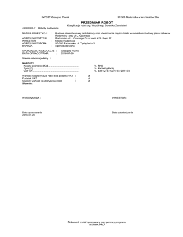 INVEST Grzegorz Piwnik 97-500 Radomsko ul Architektów 26a PRZEDMIAR ROBÓT Klasyfikacja robót wg. Wspólnego Słownika Zamówień 45000000-7 Roboty budowlane NAZWA INWESTYCJI : ADRES INWESTYCJI INWESTOR ADRES INWESTORA BRANŻA : : : : Budowa obiektów małej architektury oraz utwardzenia części działki w ramach rozbudowy placu zabaw w Radomsku przy ul L. Czarnego Radomsko ul L. Czarnego Dz nr ewid 429 obręb 27 Miasto Radomsko 97-500 Radomsko, ul. Tysiąclecia 5 ogólnobudowlana SPORZĄDZIŁ KALKULACJE : DATA OPRACOWANIA : Grzegorz Piwnik 2016-07-20 Stawka roboczogodziny : NARZUTY Koszty pośrednie [Kp] ............................................ Zysk [Z] .................................................................. VAT [V] .................................................................. Wartość kosztorysowa robót bez podatku VAT : Podatek VAT : Ogółem wartość kosztorysowa robót : Słownie: % R+S % R+S+Kp(R+S) % Σ(R+M+S+Kp(R+S)+Z(R+S)) zł zł zł WYKONAWCA : INWESTOR : Data opracowania 2016-07-20 Data zatwierdzenia Dokument został opracowany przy pomocy programu NORMA PRO ^ TABELA WARTOŚĆI ELEMENTÓW Lp. Podstawa wyceny 1 2 1 1 d.1 2 d.1 3 d.1 4 d.1 5 d.1 6 d.1 7 d.1 2 8 d.2 9 d.2 10 d.2 11 d.2 12 d.2 3 13 d.3 14 d.3 4 15 d.4 16 d.4 17 d.4 5 18 d.5 19 d.5 20 d.5 6 21 d.6 22 d.6 7 23 d.7 Opis 3 Roboty rozbiórkowe KNR 2-25 0307- Ogrodzenia z siatki na słupkach stalowych obetonowa03 nych - rozebranie KNR 2-31 0814- Rozebranie obrzeży 6x20 cm na podsypce piaskowej 01 KNR 2-31 0810- Rozebranie nawierzchni z kostki na podsypce cemento02 wo-piaskowej analogia KNR 4-04 1101- Transport materiałów brukarskich i ogrodzenia z terenu 02 1101-05 rozbiórki przy ręcznym załadowaniu i wyładowaniu saanalogia mochodem skrzyniowym na odległość 10 km KNR 2-21 0607- Ławki parkowe , zakotwione w fundamentach betono02 wych- przestawienie ławki analogia KNR 2-21 0607- Kosze - przestawienie kosza 02 analogia KNR 2-21 0607- Przestawienie tablicy do rysowania 02 analogia Roboty ziemne KNR 2-01 0206- Roboty ziemne wykonywane koparkami podsiębiernymi 01 o poj. łyżki 0.40 m3 w gruncie kat. I-II z transportem urobku samochodami samowyładowczymi na odległość do 1 km - zebranie humusu , fitnesy , dojazd pod bramę 30 cm , urządzenia zabawowe 30 cm i 40 cm kalkulacja włas- Koszt składowania i utylizacji ziemi (Określenie miejsca na wywozu, składowania i utylizacji jest zadaniem Wykonawcy) KNR 2-31 0401- Rowki pod krawężniki i ławy krawężnikowe o wymiarach 01 20x20 cm w gruncie kat.I-II KNR 2-01 0510- Humusowanie skarp z obsianiem przy grubości warstwy 01 0510-02 humusu 10 cm (po usuniętym chodniku) KNR 2-01 0510- Humusowanie skarp z obsianiem przy grubości warstwy 01 humusu 5 cm - naprawa nawierzchni trawiastej po robotach Nawierzchnie piaskowe KNR 2-31 0202- Nawierzchnia piaskowa rozścielana mechanicznie - gru07 0202-08 bość po zagęszczeniu 30 cm analogia KNR 2-31 0202- Nawierzchnia piaszczysta rozścielana mechanicznie 07 0202-08 grubość po zagęszczeniu 40 cm analogia Utwardzenie pod fitnesy KNNR 6 0104- Warstwy odsączające wykonane i zagęszczane mecha03 nicznie o gr.10 cm KNNR 6 0113- Warstwa górna podbudowy z kruszyw łamanych o gru05 bości po zagęszczeniu 10 cm KNNR 6 0502- Chodniki z kostki brukowej betonowej grubości 6 cm na 02 podsypce cementowo-piaskowej z wypełnieniem spoin piaskiem Utwardzenie pod dojazd do bramy KNNR 6 0104- Warstwy odsączające wykonane i zagęszczane mecha04 nicznie o gr.15 cm analogia Krotność = 0.75 KNNR 6 0113- Warstwa górna podbudowy z kruszyw łamanych o gru05 bości po zagęszczeniu 10 cm KNNR 6 0502- Chodniki z kostki brukowej betonowej grubości 8 cm na 03 podsypce cementowo-piaskowej z wypełnieniem spoin piaskiem Obrzeża KNNR 6 0404- Obrzeża betonowe o wymiarach 30x8 cm na podsypce 05 cementowo-piaskowej, spoiny wypełnione zaprawą cementową KNR 2-31 0402- Ława pod krawężniki betonowa z oporem 04 Ogrodzenia KNR 2-23 0401- Ogrodzenie z paneli na słupkach z rur stalowych o roz01 stawie 2,5 m i wysokości 1,23 zgodnie z PT analogia -2- Norma PRO Wersja 4.54 Nr seryjny: 3780 Jedn. miary Ilość Cena zł 4 5 6 m2 28.93 m 27.60 m2 21.30 m3 17.69 szt 1.00 szt 1.00 szt 1.00 m3 117.65 m3 117.65 m 74.00 m2 21.30 m2 150.00 m2 168.50 m2 65.00 m2 58.40 m2 58.40 m2 58.40 m2 50.50 m2 50.50 m2 50.50 m 74.00 m3 2.70 m 43.00 Wartość zł (5 x 6) 7 ^ Lp. TABELA WARTOŚĆI ELEMENTÓW Podstawa wyceny Opis 1 2 3 24 KNR-W 2-02 Brama z furtką ze słupkami zgodnie z pt d.7 1808-06 analogia 8 Urządzenia zabawowe 25 Zestaw zabawowy nr 1 dostawa i montaż d.8 kalk. własna 26 Zestaw zabawowy nr 2 dostawa i montaż d.8 kalk. własna 27 Hustawka wagowa nr 3 dostawa i montaż d.8 kalk. własna 28 Zestaw zabawowy nr 4 dostawa i montaż d.8 kalk. własna 29 Huśtawka podwójna nr 5 dostawa i montaż d.8 kalk. własna 9 Siłownie zewnętrzne 30 Siłownia rower podwójny dostawa i montaż d.9 kalk. własna 31 Siłownia prasa nożna i jeździec dostawa i montaż d.9 kalk. własna 32 Siłownia wyciąg górny i motyl klasyczny dostawa i mond.9 kalk. własna taż 33 Siłownia wioślarz podwójny dostawa i montaż d.9 kalk. własna 10 Ławki i kosze 34 KNR 2-21 0607- Ławki parkowe , zakotwione w fundamentach betonod.10 02 wych analogia 35 KNR 2-21 0607- Kosze d.10 02 analogia Wartość kosztorysowa robót bez podatku VAT Podatek VAT Ogółem wartość kosztorysowa robót Słownie: -3- Norma PRO Wersja 4.54 Nr seryjny: 3780 Jedn. miary Ilość Cena zł 4 5 6 kpl. 1.00 kpl. 1.00 kpl. 1.00 kpl. 1.00 kpl. 1.00 kpl. 1.00 kpl. 1.00 kpl. 1.00 kpl. 1.00 kpl. 1.00 szt 8.00 szt 8.00 Wartość zł (5 x 6) 7