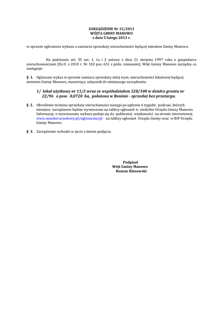 ZARZĄDZENIE Nr 15/2013 WÓJTA GMINY MANOWO z dnia 5 lutego 2013 r. w sprawie ogłoszenia wykazu o zamiarze sprzedaży nieruchomości będącej mieniem Gminy Manowo. Na podstawie art. 35 ust. 1, 1a i 2 ustawy z dnia 21 sierpnia 1997 roku o gospodarce nieruchomościami (Dz.U. z 2010 r. Nr 102 poz. 651 z późn. zmianami), Wójt Gminy Manowo zarządza co następuje: § 1. Ogłaszam wykaz w sprawie zamiaru sprzedaży niżej wym. nieruchomości lokalowej będącej mieniem Gminy Manowo, stanowiący załącznik do niniejszego zarządzenia: 1/ lokal użytkowy nr 11/2 wraz ze współudziałem 328/100 w działce gruntu nr 22/96 o pow. 0,0720 ha, położona w Boninie - sprzedaż bez przetargu. § 2. Określenie terminu sprzedaży nieruchomości nastąpi po upływie 6 tygodni podczas, których niniejsze zarządzenie będzie wywieszone na tablicy ogłoszeń w siedzibie Urzędu Gminy Manowo. Informację o wywieszeniu wykazu podaje się do publicznej wiadomości na stronie internetowej www.monitorurzedowy.pl/ogloszenia/pl na tablicy ogłoszeń Urzędu Gminy oraz w BIP Urzędu Gminy Manowo. § 3. Zarządzenie wchodzi w życie z dniem podjęcia. Podpisał Wójt Gminy Manowo Roman Kłosowski WYKAZ NIERUCHOMOŚCI DO SPRZEDAŻY Wójt Gminy Manowo podaje do publicznej wiadomości wykaz o zamiarze sprzedaży zamiarze sprzedaży nieruchomości lokalowej będącej mieniem Gminy Manowo. Przedmiotem sprzedaży jest: 1/ lokal użytkowy nr 11/2 wraz ze współudziałem 328/1000 w działce gruntu nr 22/96 o pow. 0,0720 ha, położony w Boninie - sprzedaż bez przetargu dla współwłaściciela nieruchomości. Księga wieczysta KW Nr KO1K/00071857/4 urządzona w Sądzie Rejonowym w Koszalinie. Wartość prawa własności nieruchomości lokalowej wynosi 188.200 zł., natomiast wartość rynkowa poniesionych nakładów przez najemcę w związku z remontem kapitalnym lokalu użytkowego wynosi 147.200 zł. Kwota do zapłaty wynosi 50.430 zł. (słownie: pięćdziesiąt tysięcy czterysta trzydzieści złotych 00/100). Do kwoty zakupu lokalu użytkowego tj. 41.000 zł. doliczono podatek VAT w wysokości 23 % tj. 9.430 zł. (słownie: dziewięć tysięcy czterysta trzydzieści złotych 00/100) Nieruchomość lokalowa nr 2 stanowi część składową budynku użytkowego nr 11 położonego w miejscowości Bonin, gmina Manowo. Zbywany lokal użytkowy składa się z 4 pokoi, korytarza, przedsionka, łazienki z ubikacją o pow. użytkowej 112,41 m2 i zaopatrzony jest w sieci: wodociągową, elektryczną, kanalizacyjną, częściowo gazową i telefoniczną. Otoczenie stanowi zabudowa mieszkalna i usługowa. Rok budowy ok. 1970, remont kapitalny 2008/2009 r. Stosownie do art. 34 ust. 1 i 2 ustawy z dnia 21 sierpnia 1997 roku o gospodarce nieruchomościami (Dz.U. z 2010 r. Nr 102 poz. 651) w z y w a się poprzednich właścicieli pozbawionych praw własnościowych tej nieruchomości przed 5 grudnia 1990 r. oraz osoby, którym przysługuje roszczenie z mocy niniejszej ustawy do złożenia wniosków o nabycie nieruchomości w terminie 6 tygodni, licząc od dnia wywieszenia wykazu. W przypadku stwierdzenia braku wpływu oświadczeń w podanym terminie w/w nieruchomość zostanie sprzedana. Dodatkowych informacji o przedmiotowych nieruchomościach można uzyskać w Urzędzie Gminy p. nr 17 – I piętro. Do wiadomości : 1. Tablica ogłoszeń U.Gm. 2. a/akta Podpisał Wójt Gminy Manowo Roman Kłosowski Manowo, dnia 5 luty 2013 r.