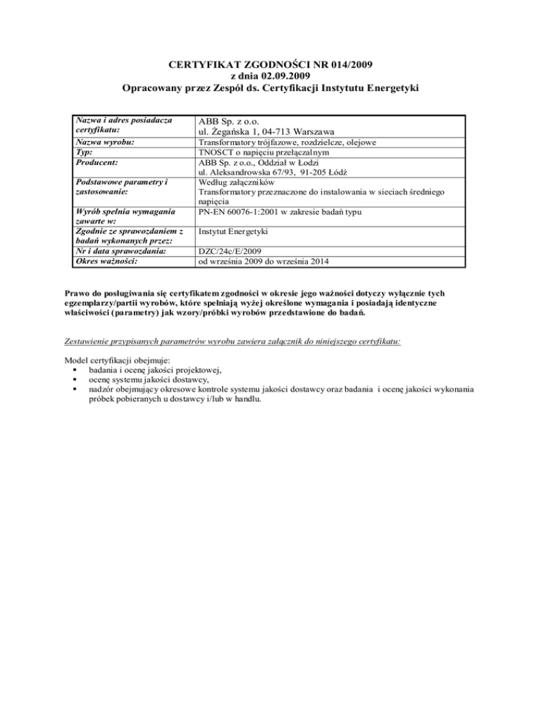 CERTYFIKAT ZGODNOŚCI NR 014/2009 z dnia