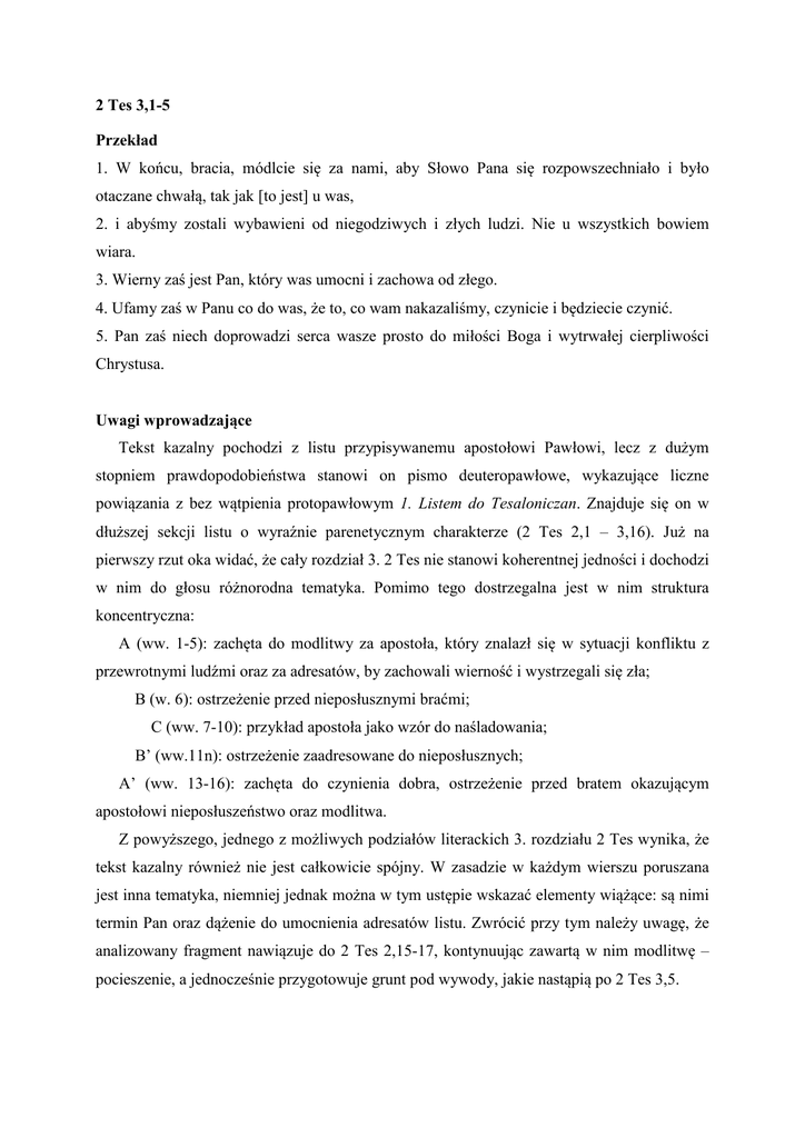 2 Tes 3,1-5 Przekład 1. W końcu, bracia, módlcie się za nami, aby Słowo Pana się rozpowszechniało i było otaczane chwałą, tak jak [to jest] u was, 2. i abyśmy zostali wybawieni od niegodziwych i złych ludzi. Nie u wszystkich bowiem wiara. 3. Wierny zaś jest Pan, który was umocni i zachowa od złego. 4. Ufamy zaś w Panu co do was, że to, co wam nakazaliśmy, czynicie i będziecie czynić. 5. Pan zaś niech doprowadzi serca wasze prosto do miłości Boga i wytrwałej cierpliwości Chrystusa. Uwagi wprowadzające Tekst kazalny pochodzi z listu przypisywanemu apostołowi Pawłowi, lecz z dużym stopniem prawdopodobieństwa stanowi on pismo deuteropawłowe, wykazujące liczne powiązania z bez wątpienia protopawłowym 1. Listem do Tesaloniczan. Znajduje się on w dłuższej sekcji listu o wyraźnie parenetycznym charakterze (2 Tes 2,1 – 3,16). Już na pierwszy rzut oka widać, że cały rozdział 3. 2 Tes nie stanowi koherentnej jedności i dochodzi w nim do głosu różnorodna tematyka. Pomimo tego dostrzegalna jest w nim struktura koncentryczna: A (ww. 1-5): zachęta do modlitwy za apostoła, który znalazł się w sytuacji konfliktu z przewrotnymi ludźmi oraz za adresatów, by zachowali wierność i wystrzegali się zła; B (w. 6): ostrzeżenie przed nieposłusznymi braćmi; C (ww. 7-10): przykład apostoła jako wzór do naśladowania; B’ (ww.11n): ostrzeżenie zaadresowane do nieposłusznych; A’ (ww. 13-16): zachęta do czynienia dobra, ostrzeżenie przed bratem okazującym apostołowi nieposłuszeństwo oraz modlitwa. Z powyższego, jednego z możliwych podziałów literackich 3. rozdziału 2 Tes wynika, że tekst kazalny również nie jest całkowicie spójny. W zasadzie w każdym wierszu poruszana jest inna tematyka, niemniej jednak można w tym ustępie wskazać elementy wiążące: są nimi termin Pan oraz dążenie do umocnienia adresatów listu. Zwrócić przy tym należy uwagę, że analizowany fragment nawiązuje do 2 Tes 2,15-17, kontynuując zawartą w nim modlitwę – pocieszenie, a jednocześnie przygotowuje grunt pod wywody, jakie nastąpią po 2 Tes 3,5. Komentarz W. 1. Pomimo wspomnianego związku tekstu kazalnego z kontekstem poprzedzającym, wraz z tym wierszem, jak wskazuje na to wyrażenie to loipon – ponadto, w końcu, autor rozpoczyna nową część listu. Wyrażenie to jest jednocześnie sygnałem, że poruszane będą teraz sprawy o bardzo ważnym znaczeniu. W typowy dla stylu oratorskiego sposób, co stanowi charakterystyczną cechę obu Listów do Tesaloniczan, hagiograf określa czytelników mianem bracia. Chodzi przy tym – co oczywiste – nie o więzy krwi, lecz o nowy i szczególny wymiar chrześcijańskiej wspólnoty, której fundamentem i źródłem jest więź wszystkich wierzących z Chrystusem i z Chrystusa. Autor zwraca się więc do Tesaloniczan jako do braci w wierze, jak brat do brata, podkreślając, że wszyscy chrześcijanie tworzą jedną rodzinę, na czele której stoi Bóg Ojciec. Apostoł zwraca się do czytelników z prośbą o modlitwę wstawienniczą. Ma ona dotyczyć nie jakichś jego prywatnych spraw, lecz prowadzonej przez niego, jak również przez jego współpracowników, na co wskazuje wyrażenie za nas, działalności ewangelizacyjnomisyjnej. Autor wskazuje na tę myśl w bardzo pięknym sformułowaniu – aby Słowo Pana się rozpowszechniało i było otaczane chwałą. Ta prośba hagiografa stanowi wyraz fundamentalnej prawdy, że prowadzona przez niego i jego współpracowników działalność głoszenia Dobrej Nowiny o zbawieniu nie ma żadnych szans na powodzenie, jeśli nie będzie ona wsparta modlitwami. Modlitwa jest bowiem z jednej strony wyrazem więzi z Bogiem, z drugiej zaś szczególnej wspólnoty między wszystkimi wierzącymi. Jedynie dzięki niej człowiek może wytrwać na drodze Bożego posłannictwa i tylko dzięki niej może ono przynieść owoce. Gdy apostoł wspomina o rozpowszechnianiu się Słowa Bożego, posługuje się terminem trecho – dosłownie biec. Wszystko wskazuje na to, że nawiązuje w ten sposób do tradycji starotestamentowo-judaistycznej, w której wielokrotnie pojawia się motyw podkreślania dynamiki i skuteczności Słowa Jahwe. Znamienna jest także myśl o otaczaniu Słowa Bożego chwałą. Wydaje się, że autor ma tu na myśli sukces apostolskiej misji – Słowo jest otaczane chwałą przez ludzi, jeśli je z wiarą przyjmują, i gdy wydaje w nich błogosławione owoce. Innymi słowy, gdy w nim trwają i postępują według jego wskazań. Apostoł podkreśla przy tym na końcu analizowanego wiersza, że tak ma się właśnie rzecz w społeczności Tesaloniczan. W. 2. W wierszu tym autor listu zawarł drugą część modlitewnej prośby, choć w istocie ściśle wiąże się ona z pierwszą. Ewangelia bowiem ma szansę rozprzestrzeniać się w człowieczym świecie, jeśli na drodze nie staną jej jakieś przeszkody. A przeszkodami tymi – jak wskazuje hagiograf – mogą być ludzie. Określa ich przy tym w dwójnasób – najpierw jako niegodziwych. Występujący tu przymiotnik atopos w koine były synonimem określenia zły, w późniejszym czasie nabrał znaczenia niemoralnie przewrotny bądź niemoralnie niesprawiedliwy. W związku czym można go oddać polskim niegodziwy. W drugiej kolejności autor już explicite nazywa tych, którzy stają na drodze szerzenia Ewangelii, złymi (poneroi). Choć bez wątpienia pojęcie to stanowi kategorię moralną, to jednak nie można wykluczyć, że gdzieś w tle znajduje się myśl o powiązaniu tych ludzi z szatanem, głównym wrogiem Słowa Bożego. Niejednokrotnie wszakże na kartach Nowego Testamentu szatan określany jest rzeczownikiem odprzymiotnikowym zły. Zwrócić przy trzeba uwagę, iż apostoł wskazuje jednocześnie na źródło takiej postawy jego wrogów – jest nim brak wiary. To on sprawia, że nie tylko nie przyjmują oni z wiarą głoszonej przez niego i jego współpracowników Ewangelii, le