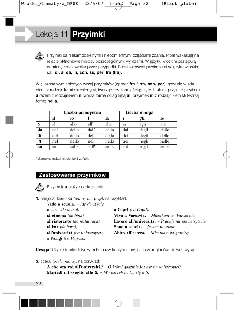 Wloski_Gramatyka_DRUK 23/5/07 15:52 Page 32 (Black plate) Lekcja 11 Przyimki 4 Przyimki sà niesamodzielnymi i nieodmiennymi cz´Êciami zdania, które wskazujà na relacje sk∏adniowe mi´dzy poszczególnymi wyrazami. W j´zyku w∏oskim zast´pujà odmian´ rzeczownika przez przypadki. Podstawowymi przyimkami w j´zyku w∏oskim sà: di, a, da, in, con, su, per, tra (fra). Wi´kszoÊç wymienionych wy˝ej przyimków (oprócz fra / tra, con, per) ∏àczy si´ w zdaniach z rodzajnikami okreÊlonymi, tworzàc tzw. formy Êciàgni´te. I tak na przyk∏ad przyimek a razem z rodzajnikiem il tworzà form´ Êciàgni´tà al, przyimek in z rodzajnikiem la tworzà form´ nella. Liczba pojedyncza a da di in su il al dal del nel sul lo allo dallo dello nello sullo l’ * all’ dall’ dell’ nell’ sull’ Liczba mnoga la alla dalla della nella sulla i ai dai dei nei sui gli agli dagli degli negli sugli le alle dalle delle nelle sulle * Zarówno rodzaj m´ski, jak i ˝eƒski. Zastosowanie przyimków 5 Przyimek a s∏u˝y do okreÊlenia: 1. miejsca, kierunku (do, w, na, przy), na przyk∏ad: Vado a scuola. – Id´ do szko∏y. a casa (do domu), al cinema (do kina), al ristorante (do restauracji), al bar (do baru), all’universit∫ (na uniwersytet), a Parigi (do Pary˝a), a Capri (na Capri). Vivo a Varsavia. – Mieszkam w Warszawie. Lavoro all’universit∫. – Pracuj´ na uniwersytecie. Sono a scuola. – Jestem w szkole. Abito all’estero. – Mieszkam za granicà. Uwaga! U˝ycie to nie dotyczy m.in. nazw kontynentów, paƒstw, regionów, du˝ych wysp. 2. czasu (o, do, na, w), na przyk∏ad: A che ora vai all’universit∫? – O której godzinie idziesz na uniwersytet? Martedì mi sveglio alle 6. – We wtorek budz´ si´ o 6. 32 Wloski_Gramatyka_DRUK 23/5/07 15:52 Page 33 CD 2 (Black plate) W¸OSKI GRAMATYKA A Natale i genitori passano molto tempo con i bambini. – Podczas Bo˝ego Narodzenia rodzice sp´dzajà du˝o czasu z dzieçmi. A maggio andiamo in Italia. – W maju jedziemy do W∏och. 3. sposobu, na przyk∏ad: Vado a casa a piedi. – Id´ do domu na piechot´. Dobbiamo imparare questa lezione a memoria. – Musimy nauczyç si´ tej lekcji na pami´ç. Lui parla sempre a voce bassa. – On zawsze mówi cicho. 4. zast´puje celownik odpowiadajàc na pytanie komu? czemu?, na przyk∏ad: Compro un regalo a Stefano. – Kupuj´ prezent Stefanowi. Dico sempre la verit∫ ai miei genitori. – Zawsze mówi´ prawd´ moim rodzicom. Dobbiamo dare questo libro a Pietro. – Musimy daç t´ ksià˝k´ Piotrkowi. 5. ∏àczy si´ z niektórymi czasownikami, na przyk∏ad: cominciare a (zaczynaç), mettersi a (zabraç si´ do czegoÊ), continuare a (kontynuowaç), imparare a (uczyç si´), riuscire a (udaç si´, powieÊç si´), pensare a (w znaczeniu „myÊleç o”). Na przyk∏ad: Domani comincio a studiare. – Jutro zaczynam si´ uczyç. Adesso mi metto a lavorare. – Teraz zabieram si´ do pracy. Vogliamo imparare a nuotare. – Chcemy nauczyç si´ p∏ywaç. 6. S∏u˝y do tworzenia niektórych wyra˝eƒ idiomatycznych, na przyk∏ad: fino a (a˝ do), davanti a (przed), vicino a (blisko), 6 a fatica (z trudem), a piedi (na piechot´). Przyimek con s∏u˝y do okreÊlenia: 1. zwiàzku lub wspó∏dzia∏ania, na przyk∏ad: Vado al cinema con te. – Id´ z tobà do kina. Abito con la mia famiglia. – Mieszkam z mojà rodzinà. 2. sposobu (z, za pomocà, w), na przyk∏ad: andare con l’autobus 180 (jechaç autobusem linii 180), andare con la macchina di Diana (jechaç samochodem Diany), con attenzione (z uwagà), www.jezykiobce.pl 33